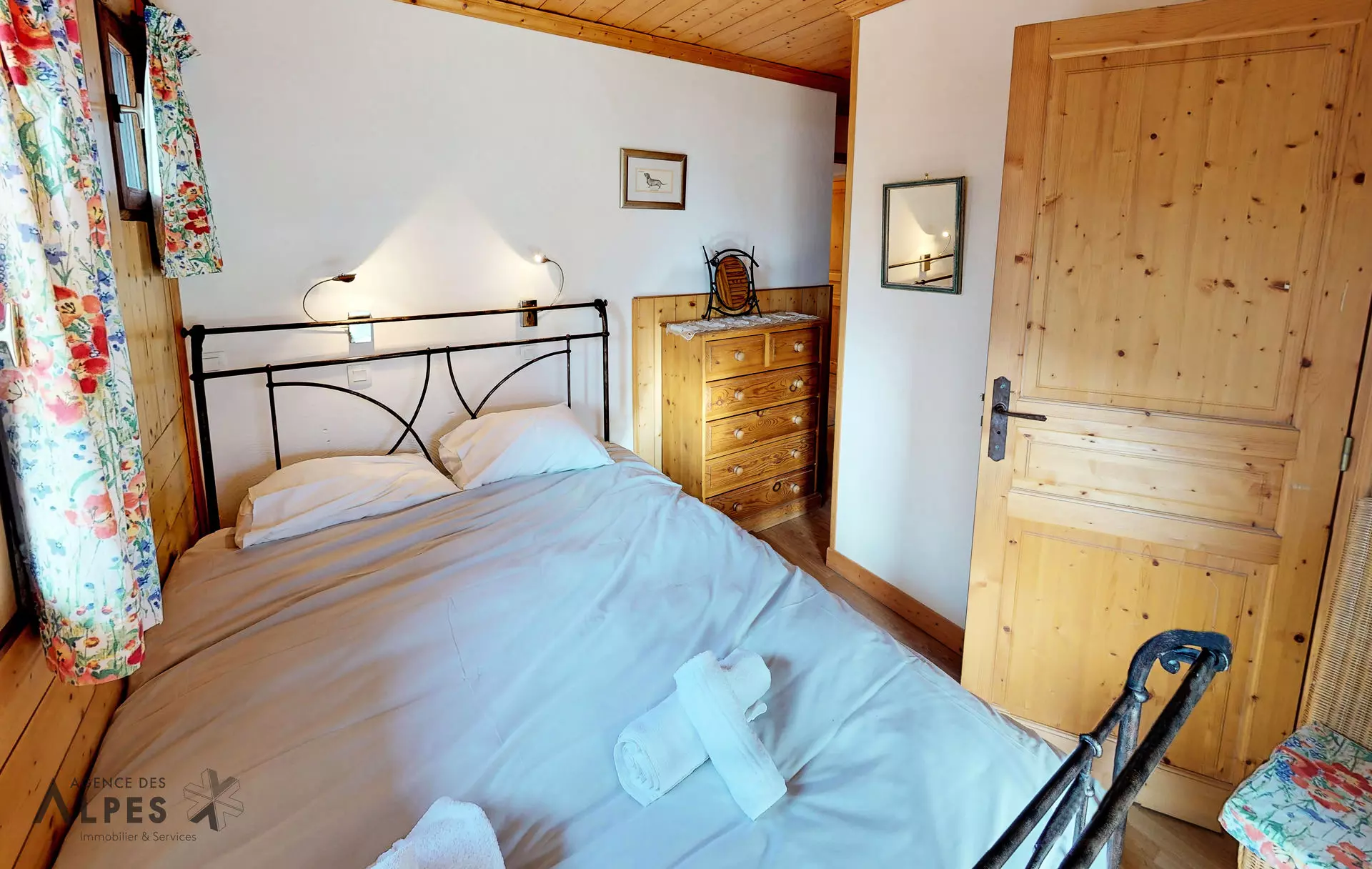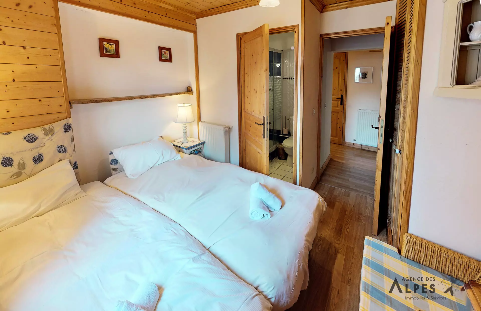 "Marmotte" room: double bed (150 cm), chest of drawers, adjoining bathroom (sink, shower, toilet, towel dryer),