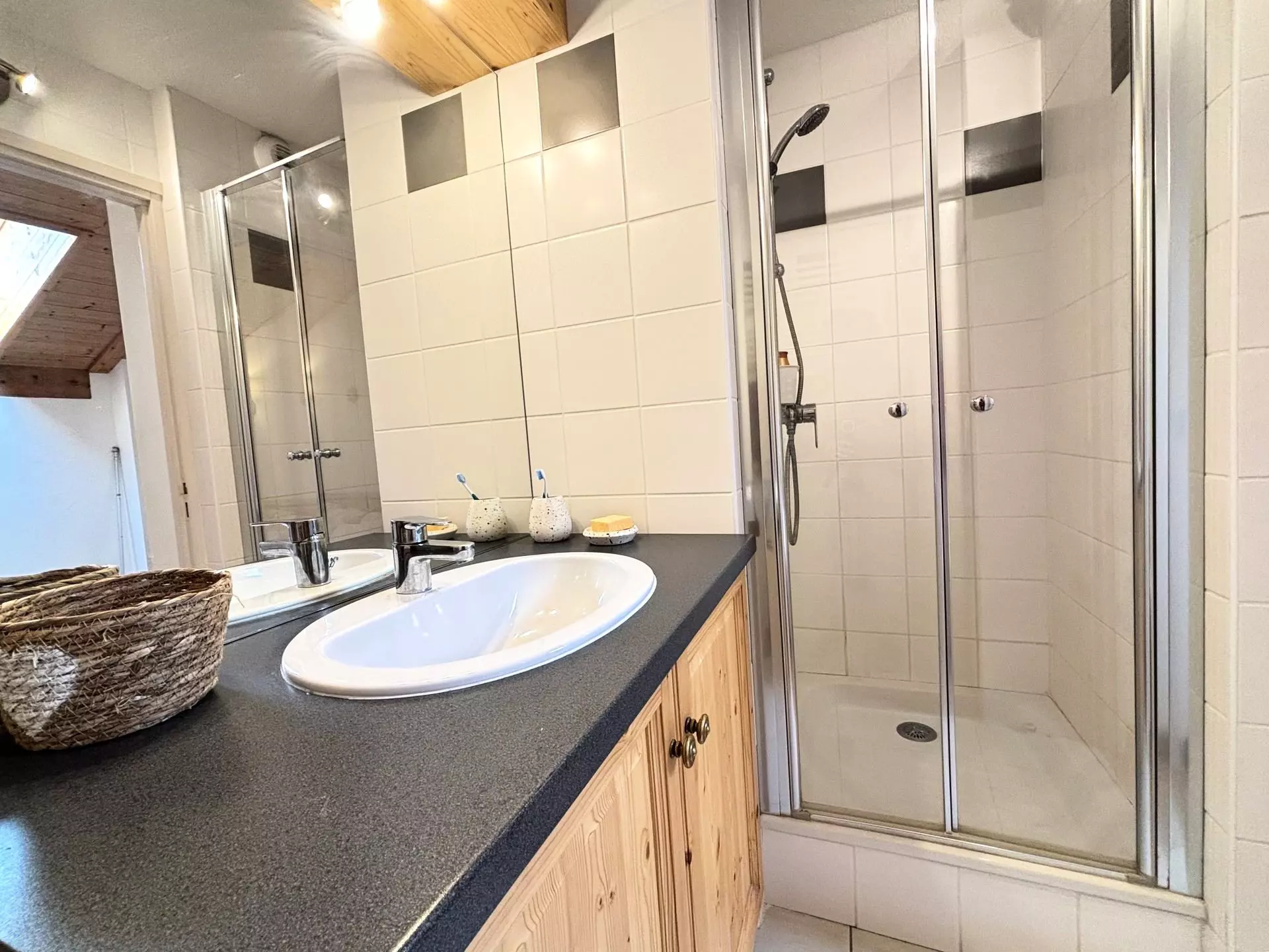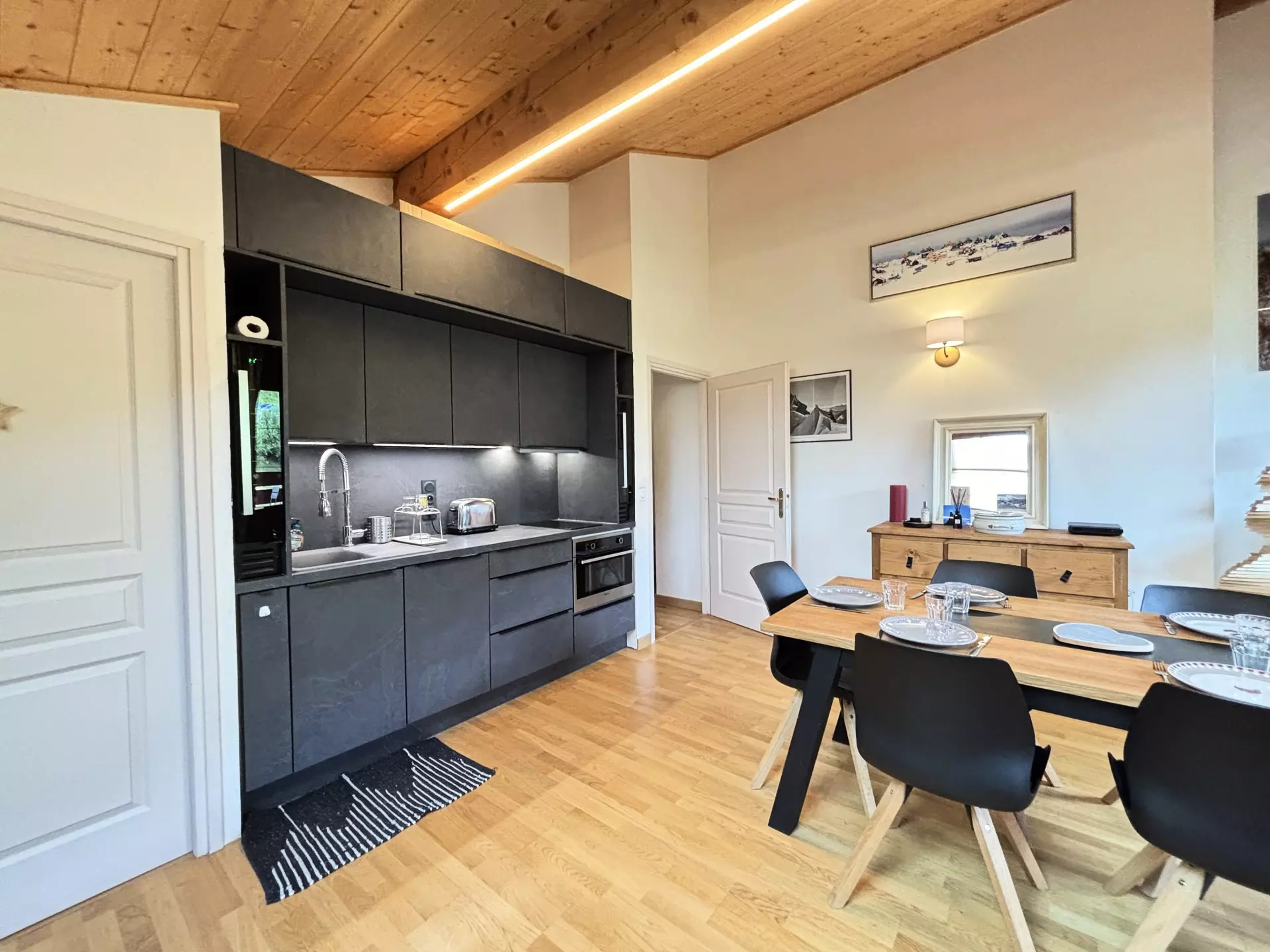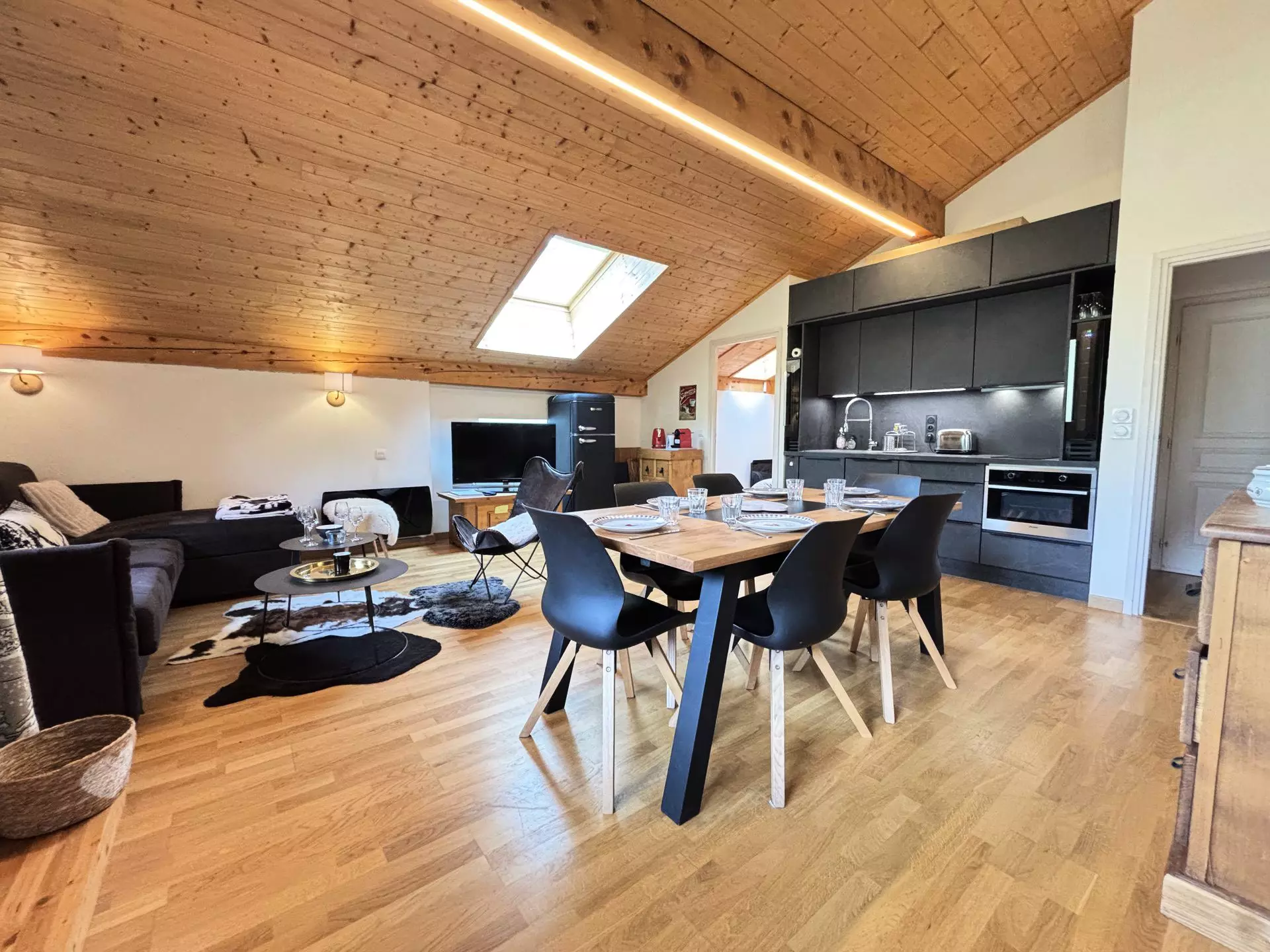 - A spacious and bright living room with an open-plan fitted kitchen: dishwasher, combined microwave oven, induction hob, refrigerator, two small wine cellars.