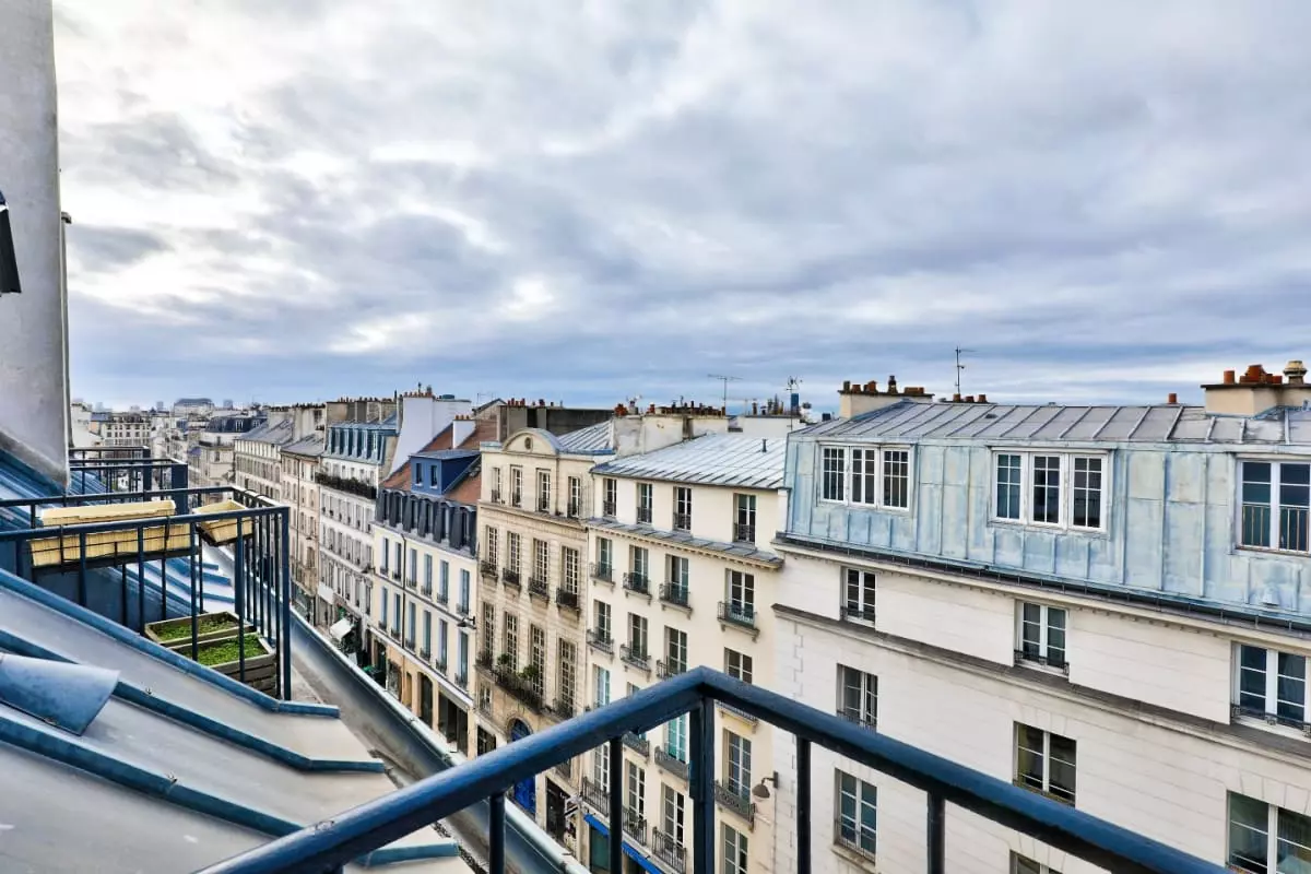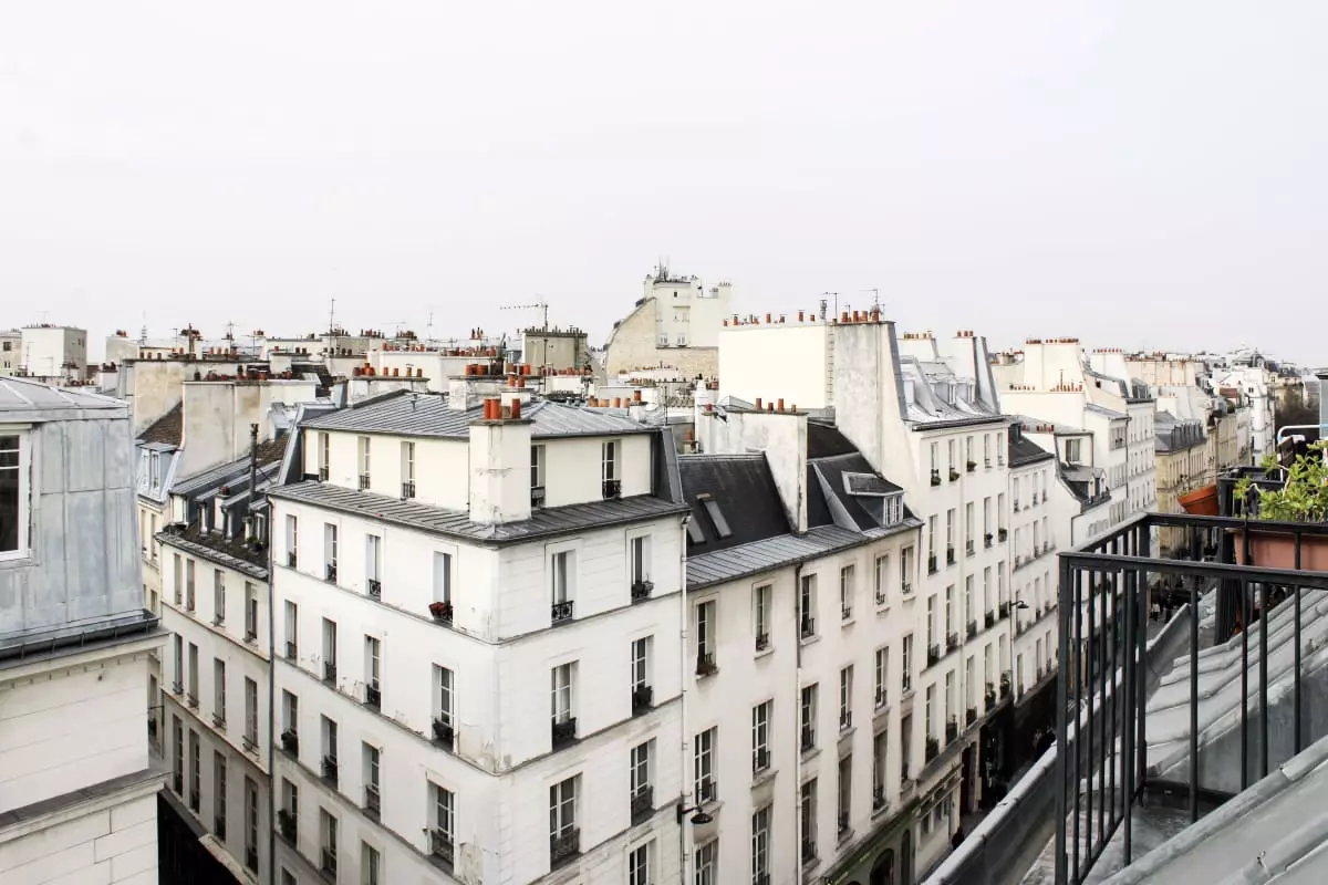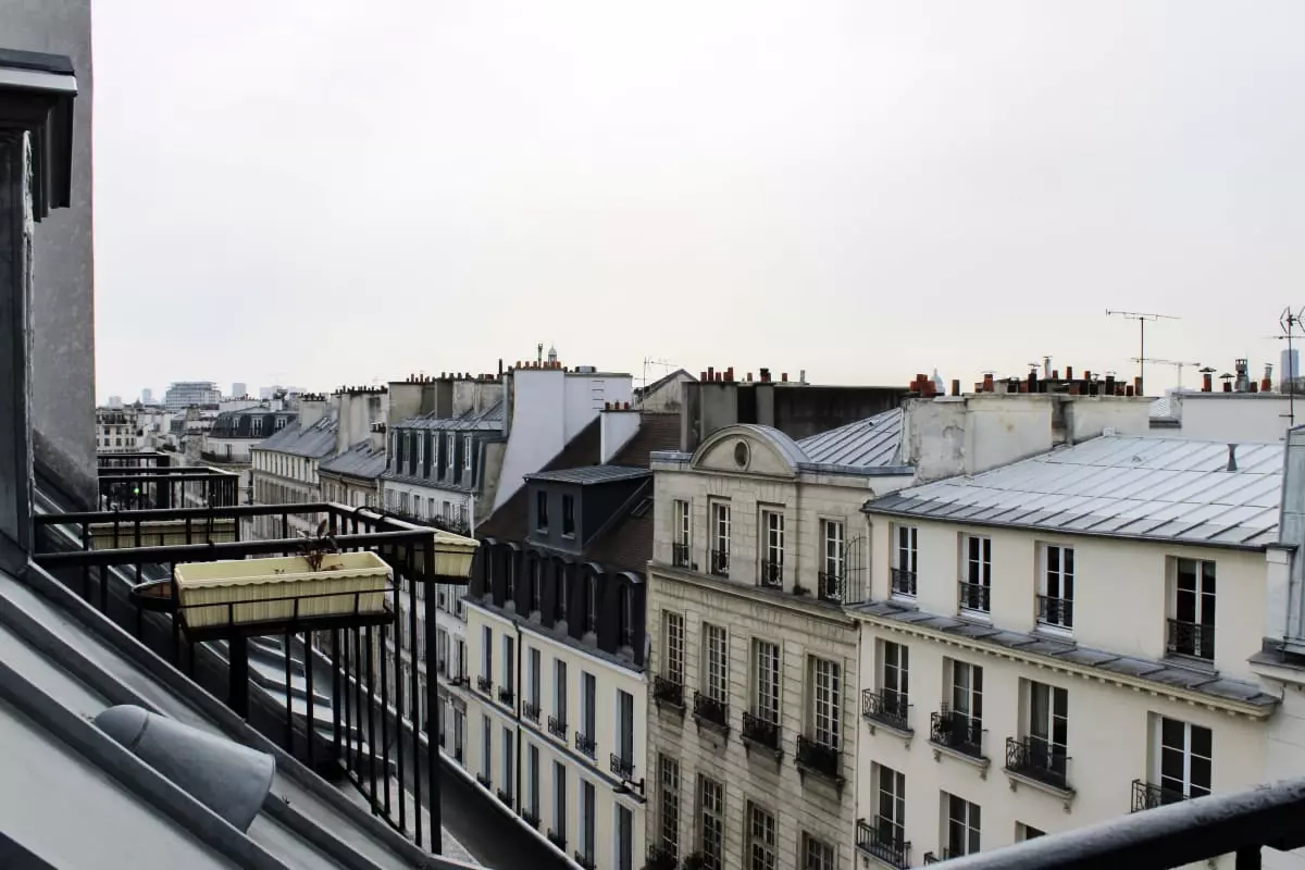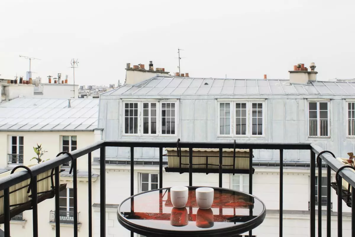 - a balcony with a table and two stools, a beautiful view of the rooftops of Paris and Beaubourg and then the Eiffel Tower in the distance;