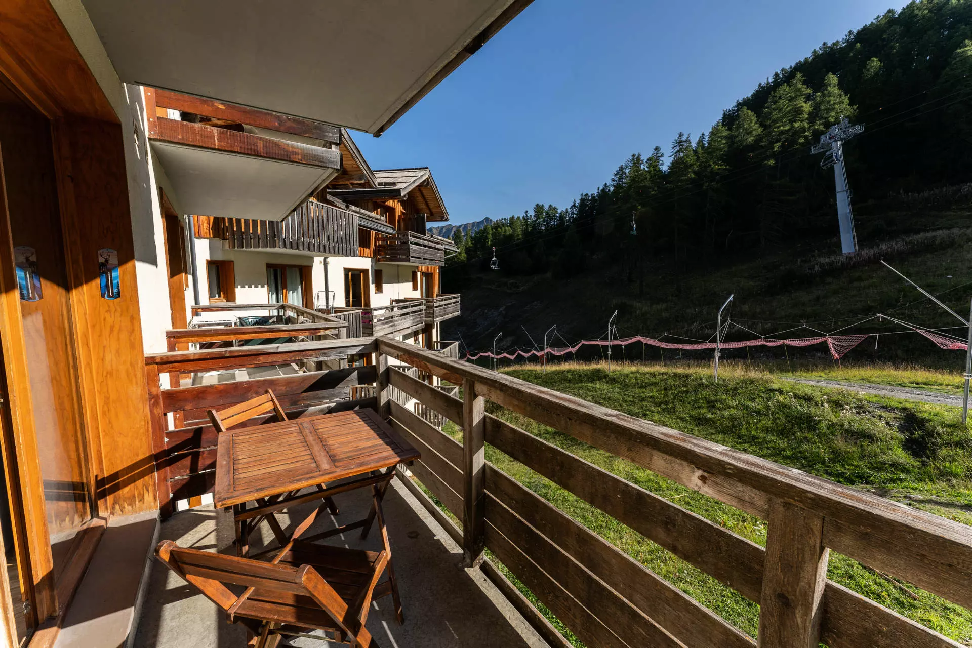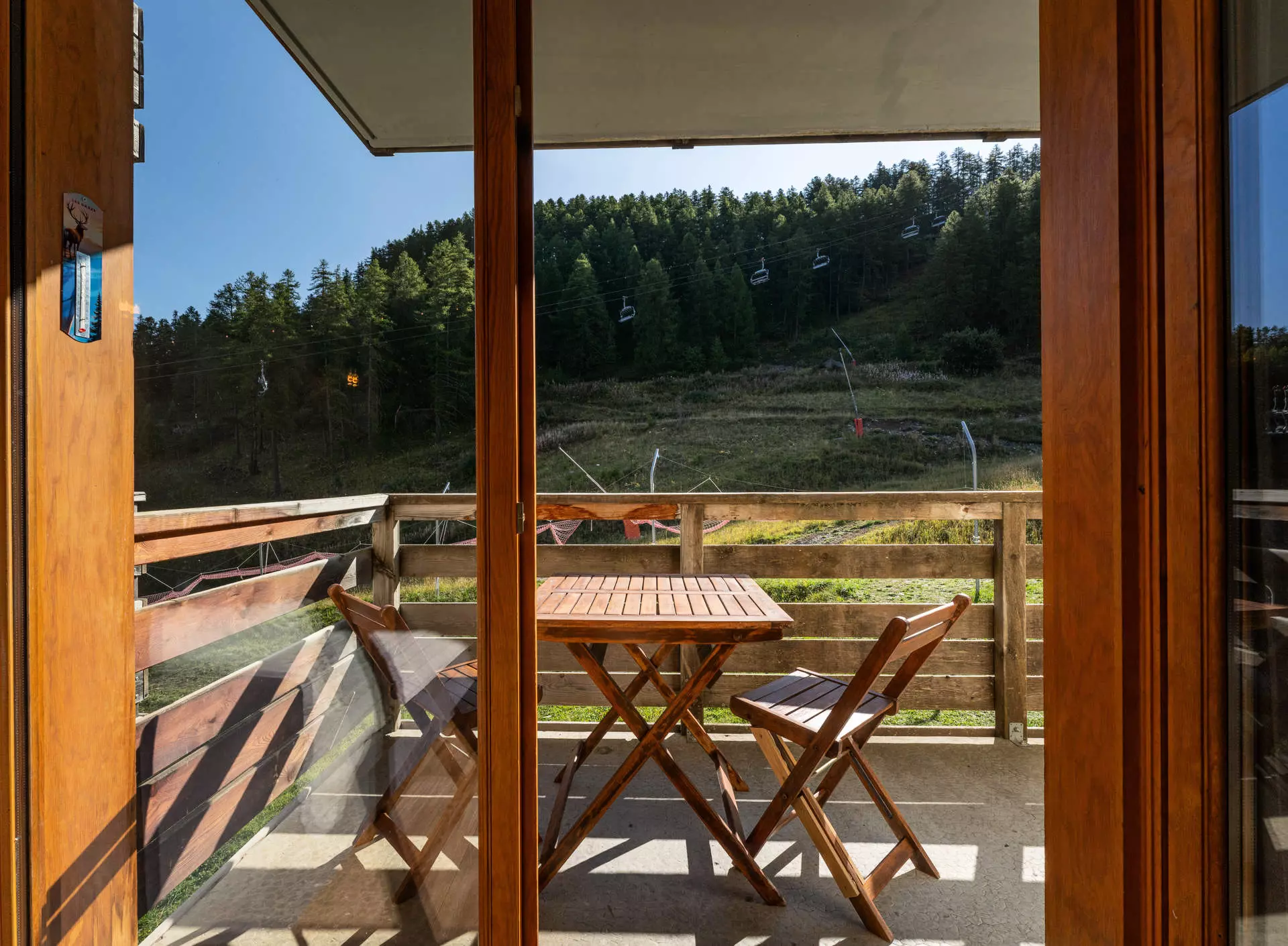 The east-facing balcony offers a magnificent view of the slopes, the larch forest and the surrounding mountains.