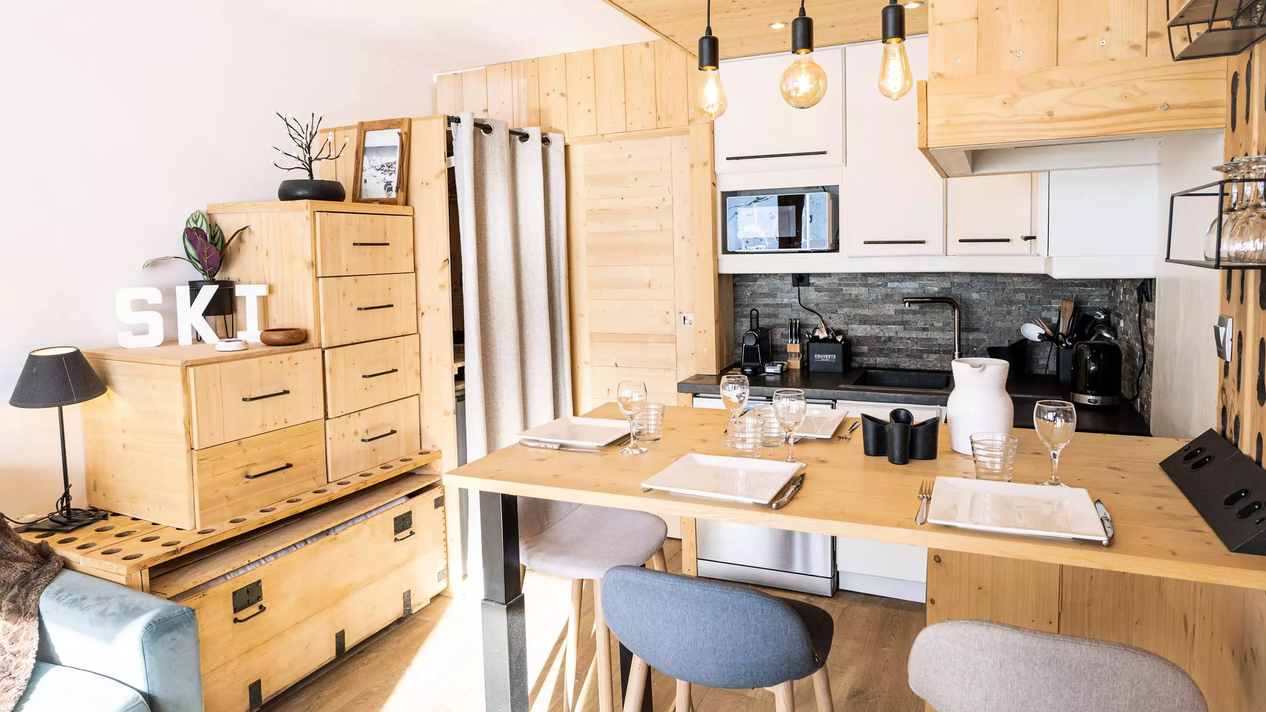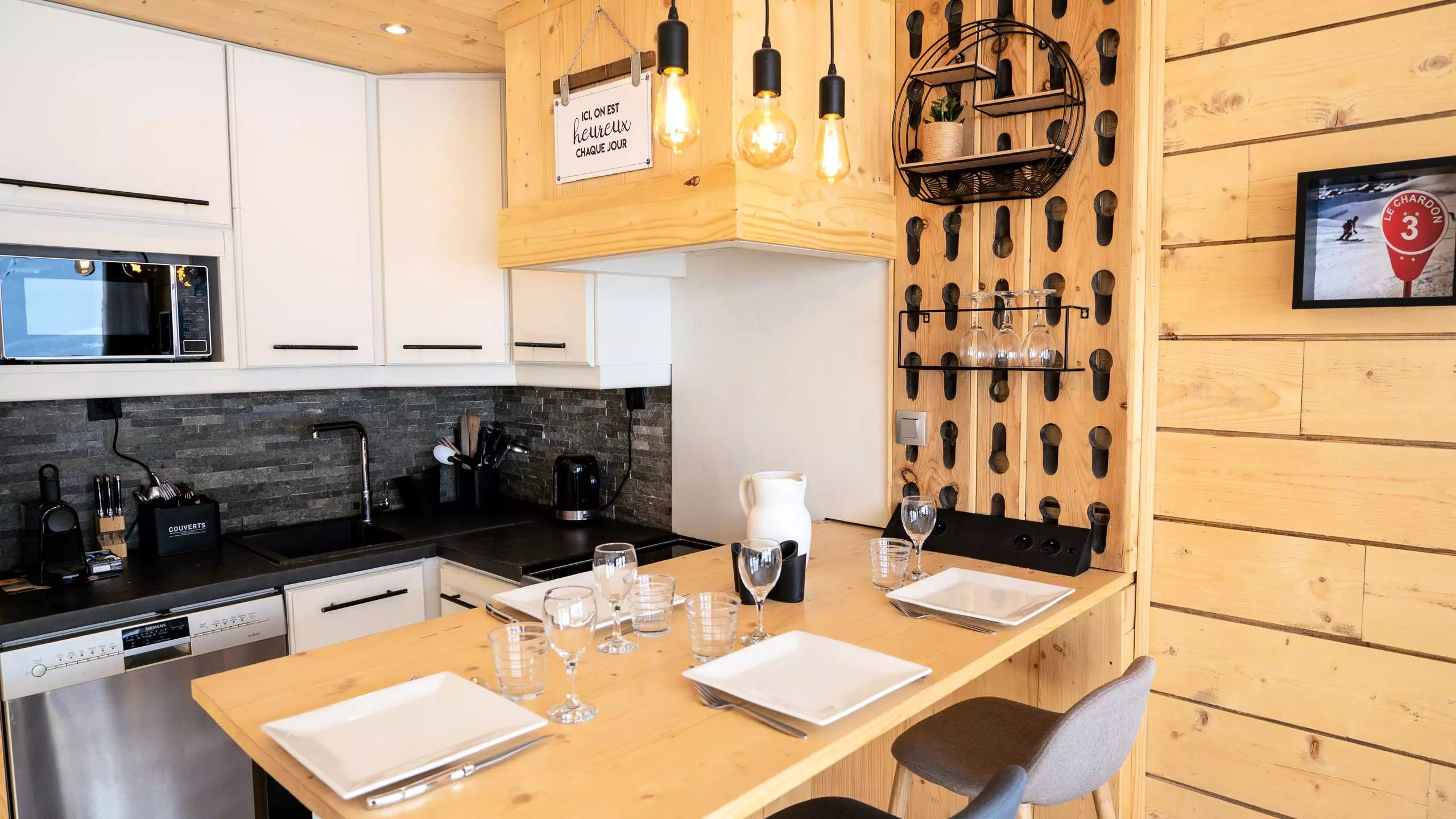 - A fully equipped open kitchen for 4 people with ceramic hob, extractor hood, dishwasher, oven, microwave, refrigerator, NESPRESSO coffee machine, toaster, kettle...