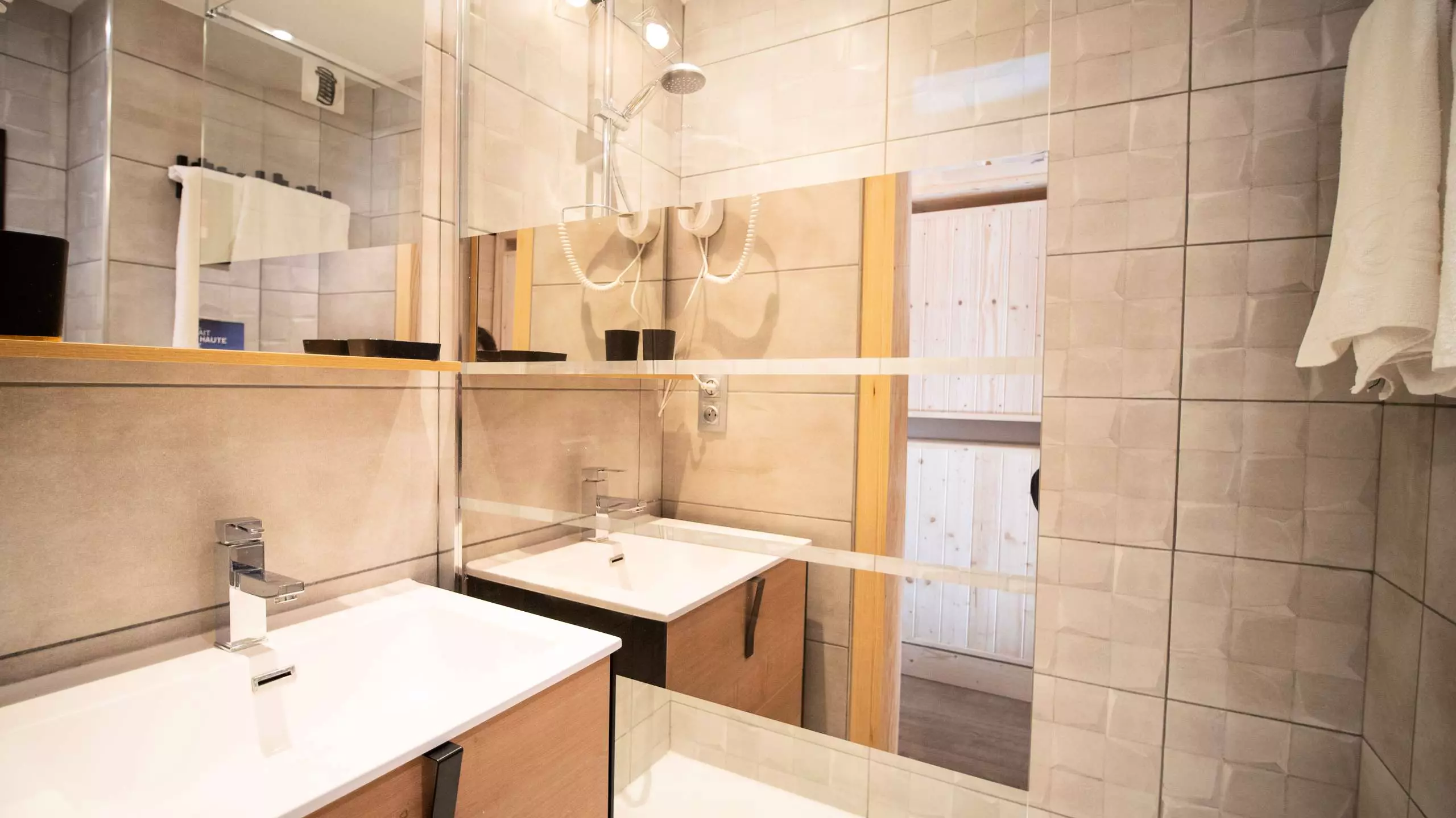 - A separate bathroom with shower, sink, towel dryer and toilet.
