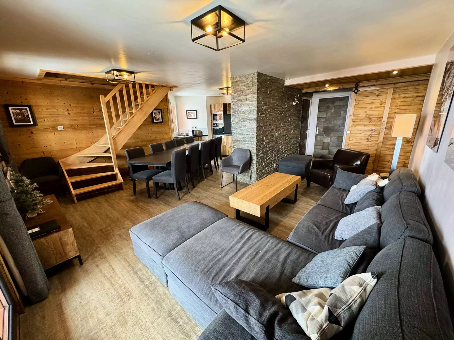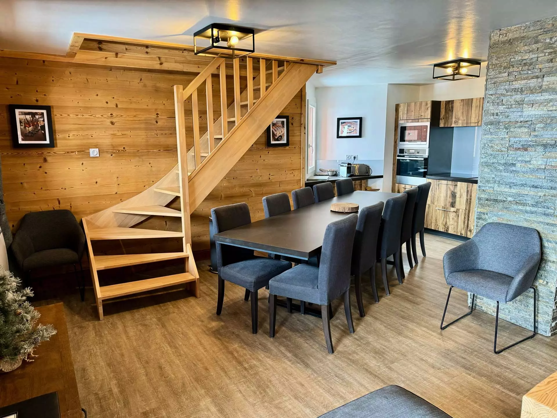 - Living room with corner sofa, chaise longue, armchairs, large screen TV, Wi-Fi and equipped kitchen for 12 people, induction hob, oven, microwave, refrigerator, classic and Nespresso coffee maker, kettle, toaster and citrus press.