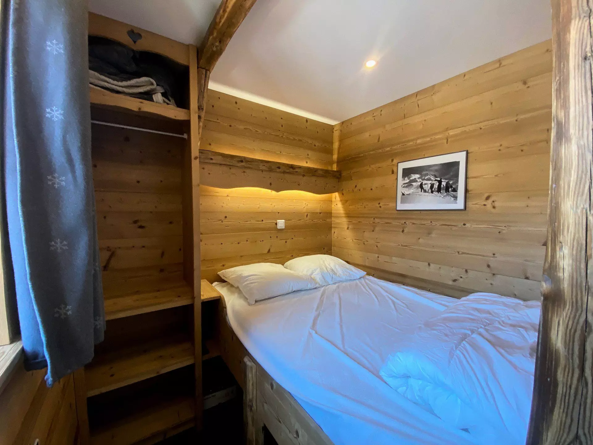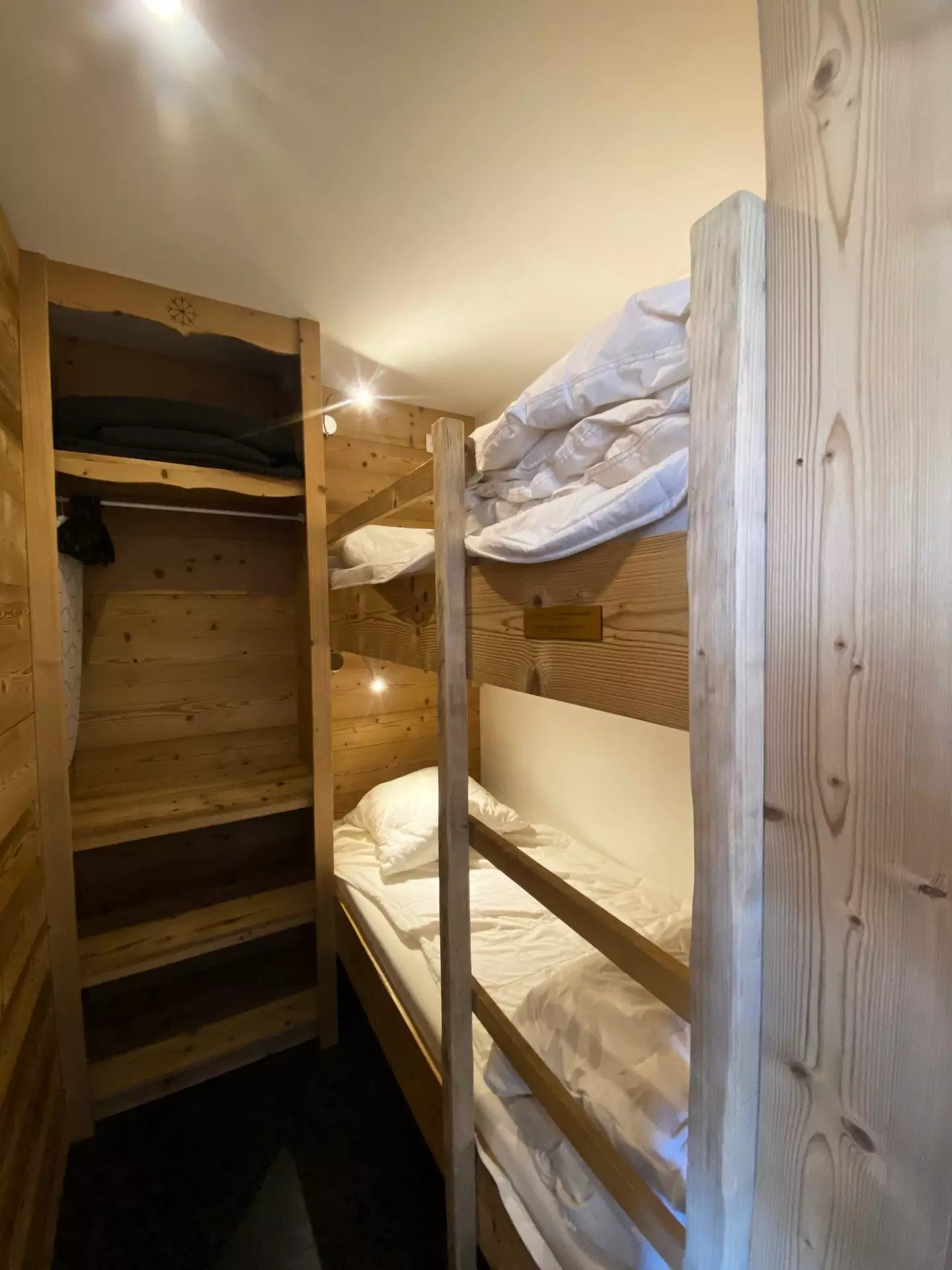 It has a cabin with bunk beds closed by a sliding door and a bedroom with a double bed.