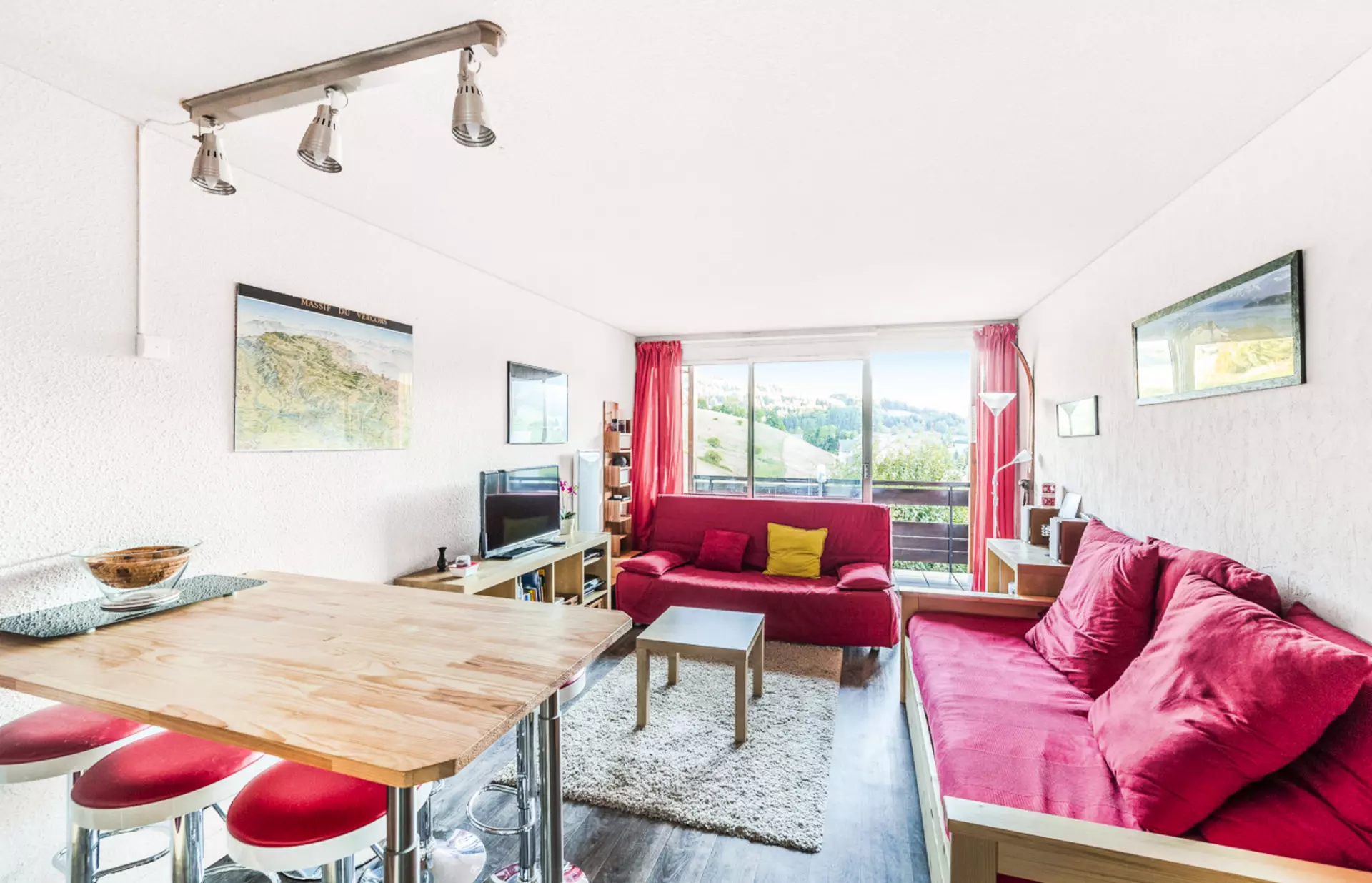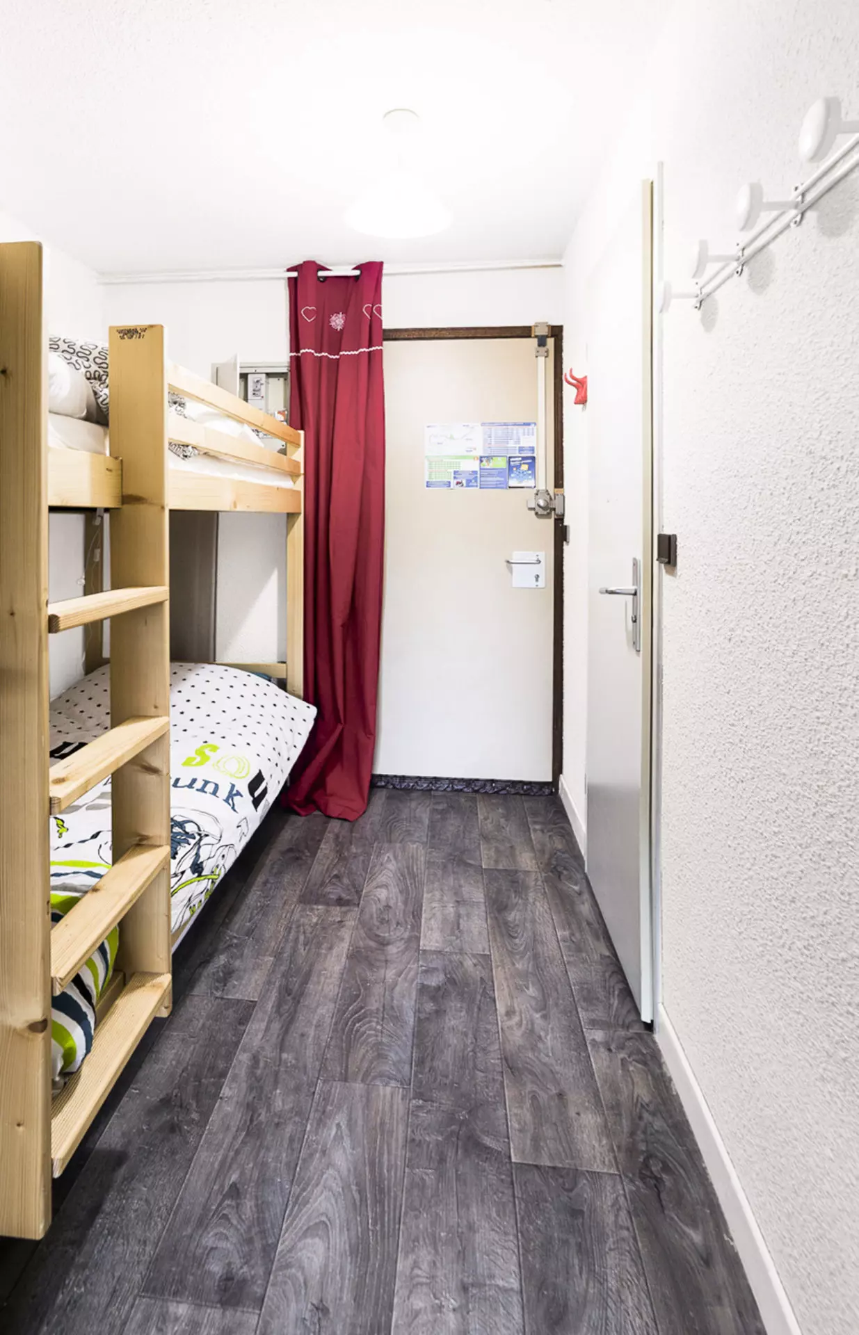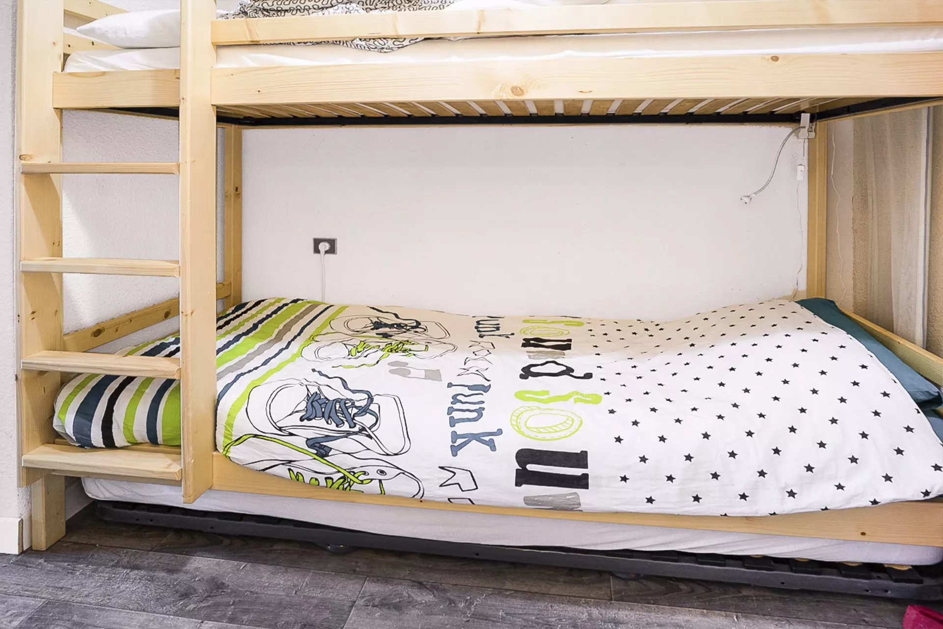 A 29 m² studio cabin is located in a very quiet condominium on the 2nd floor with an elevator. You can admire the magnificent view of the mountains. South-facing. This fully renovated studio features a very bright living/sleeping area, a fully equipped kitchen, a cabin area with two bunk beds, a bathroom, and a separate toilet.