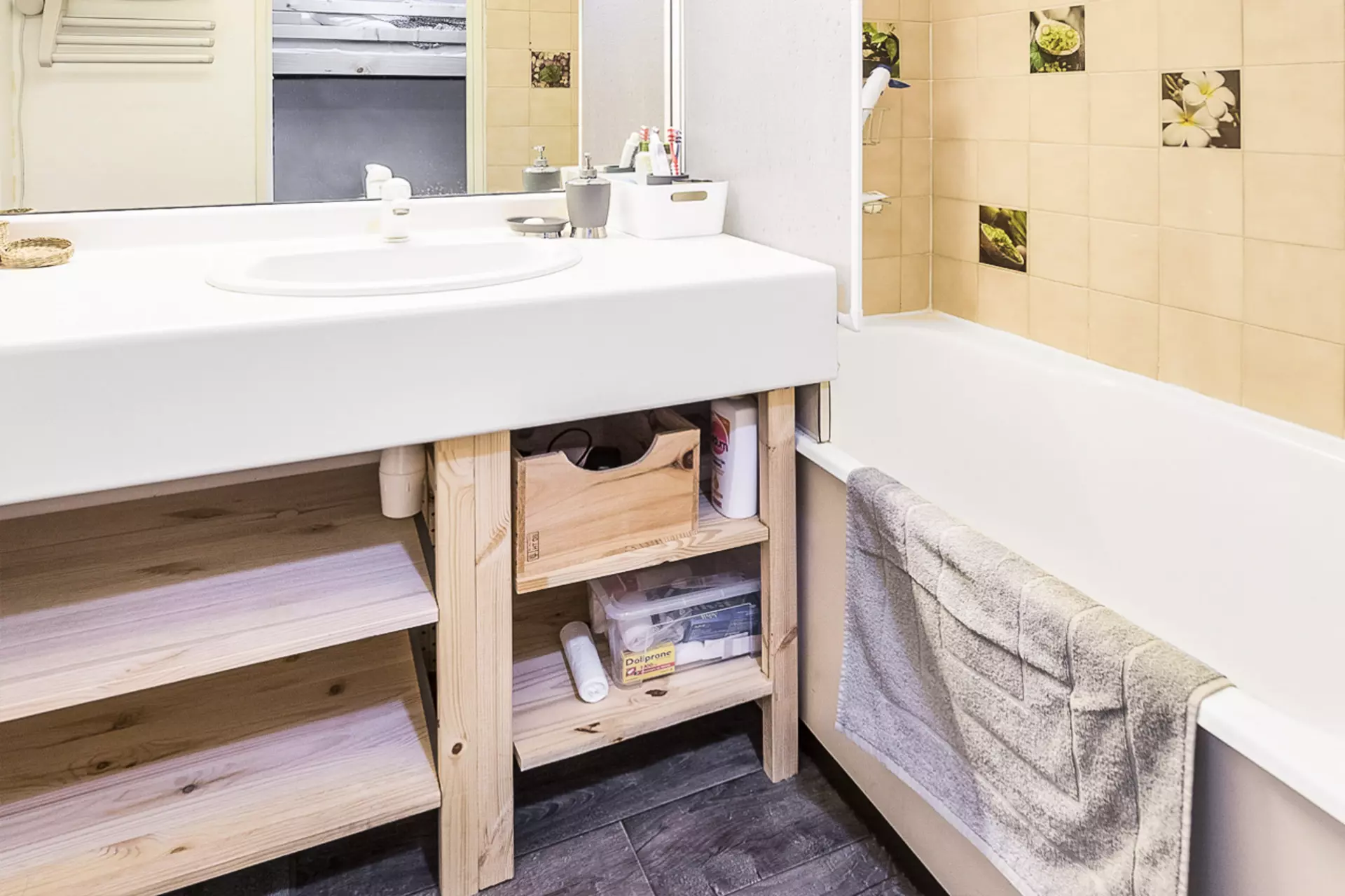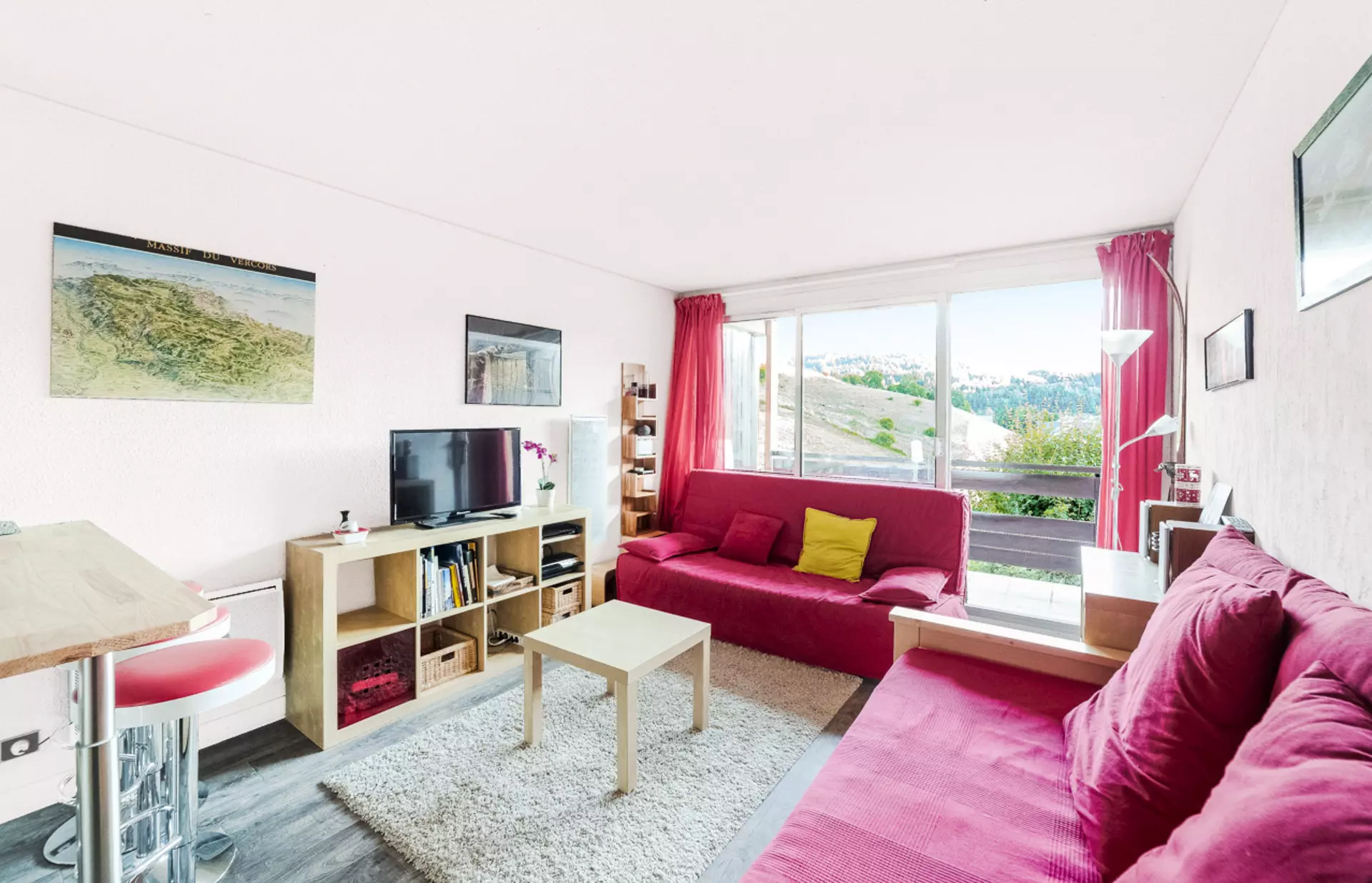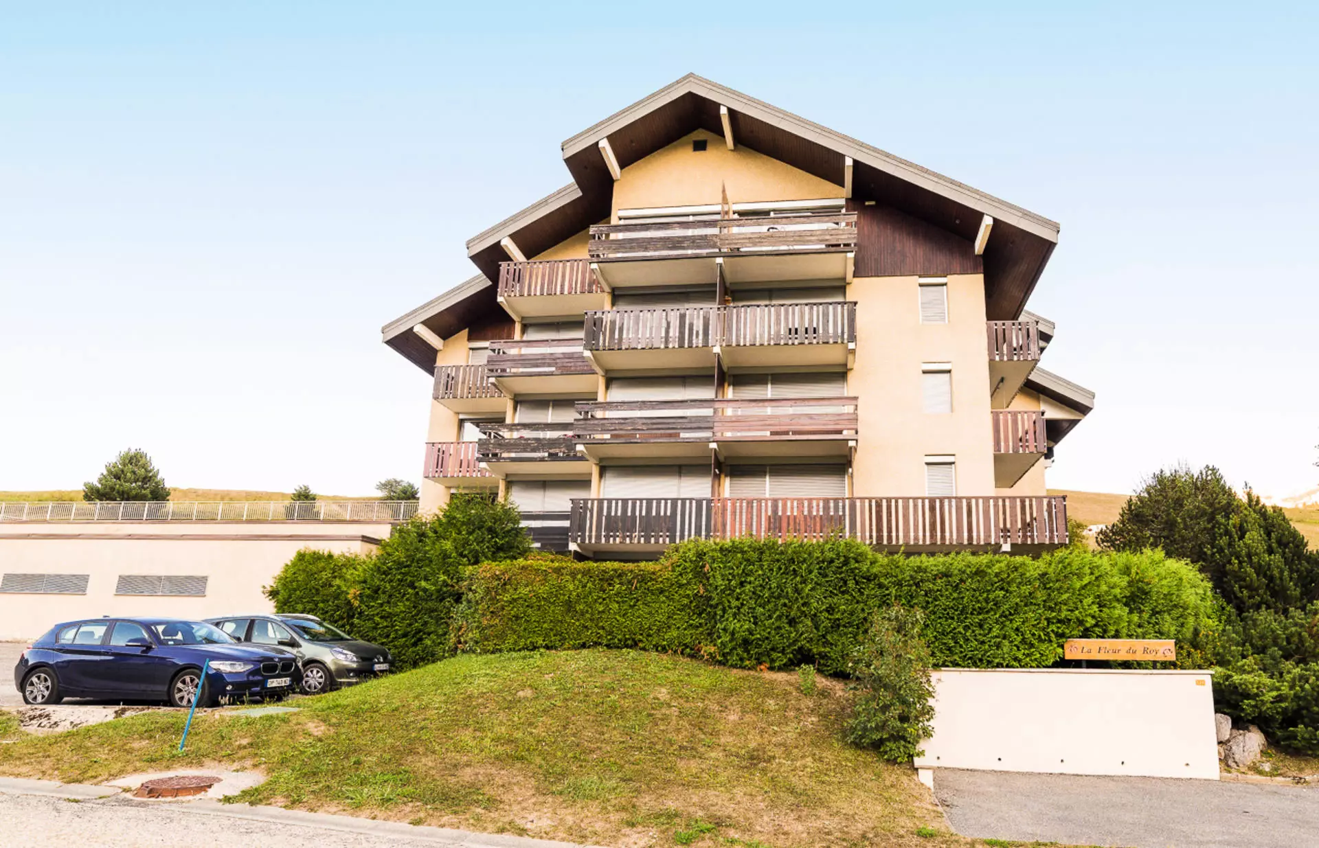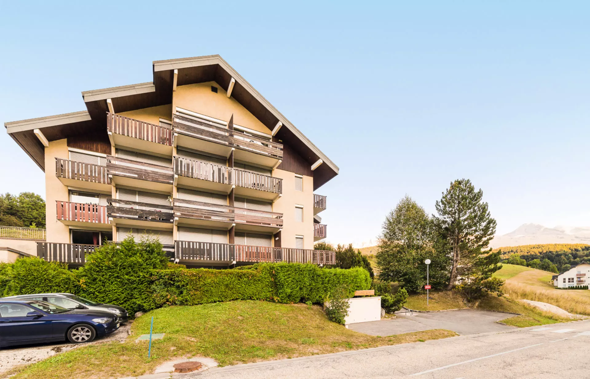 A 29 m² studio cabin is located in a very quiet condominium on the 2nd floor with an elevator. You can admire the magnificent view of the mountains. South-facing. This fully renovated studio features a very bright living/sleeping area, a fully equipped kitchen, a cabin area with two bunk beds, a bathroom, and a separate toilet.