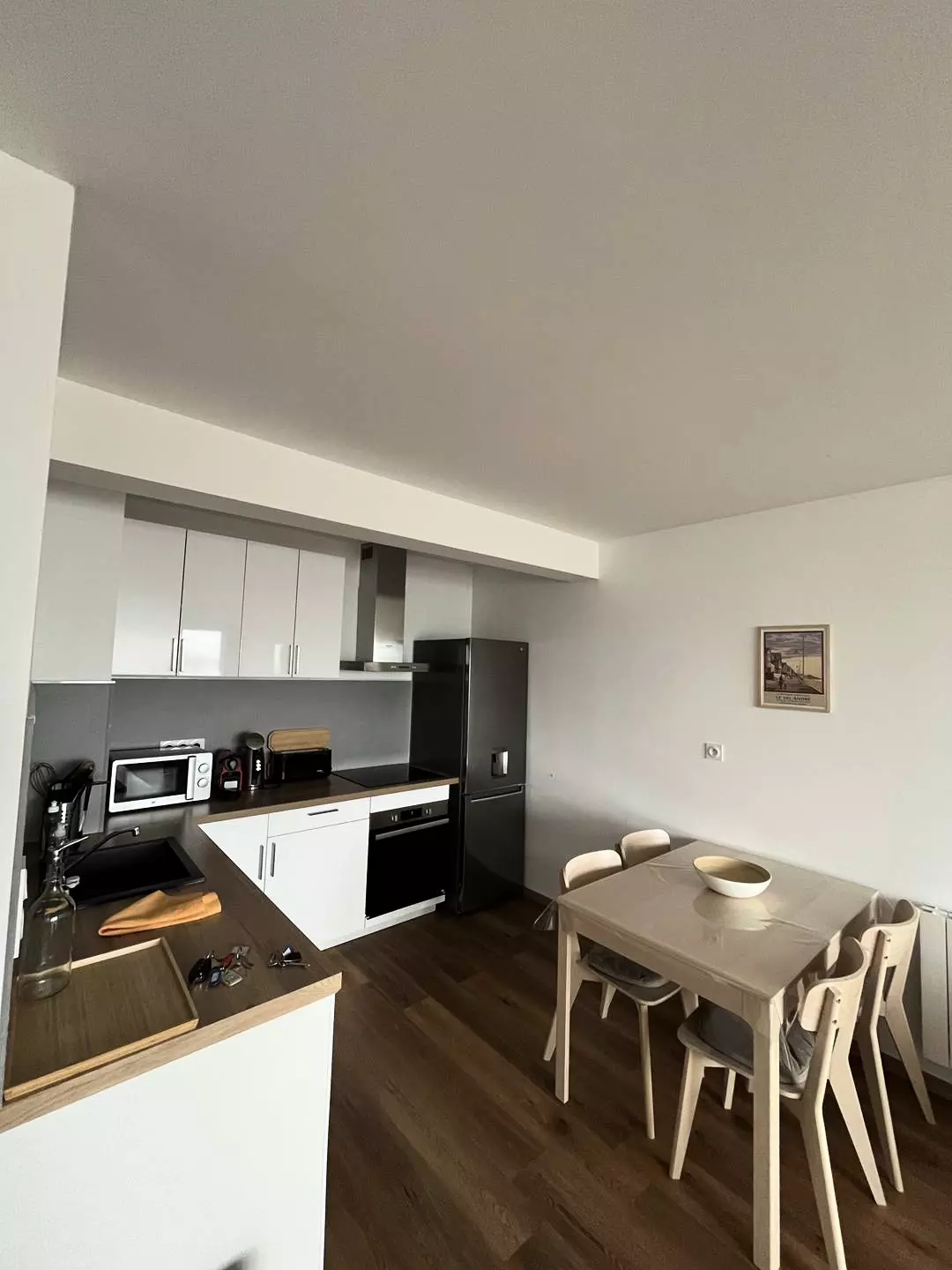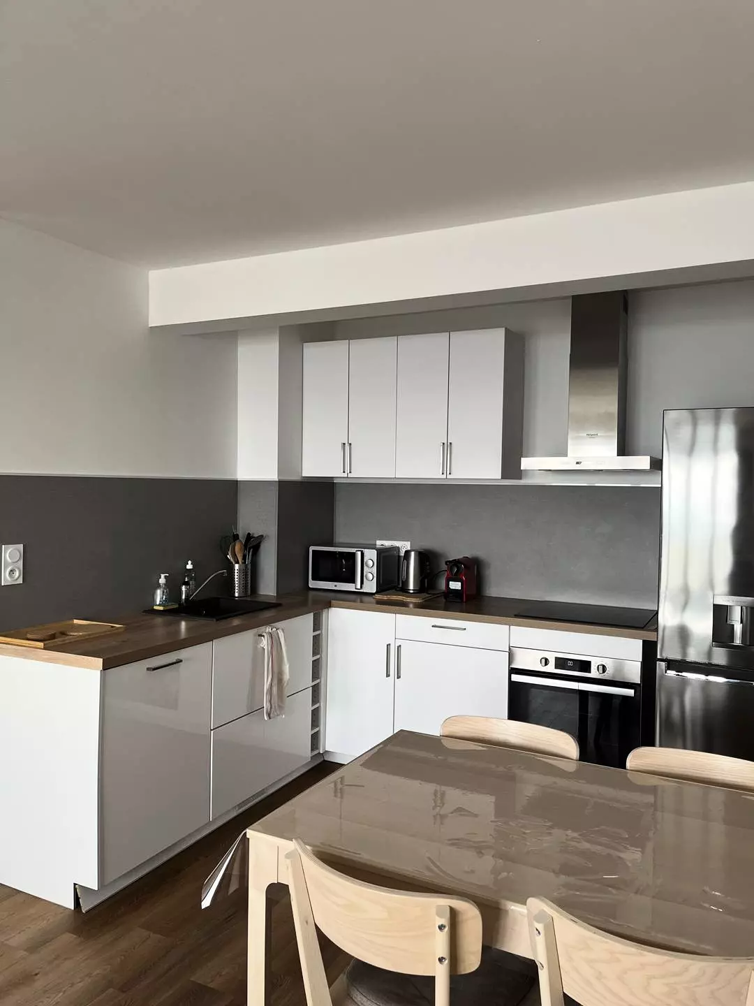 -A fitted and equipped kitchen with induction hob, oven, extractor hood, kettle, coffee maker, fridge-freezer, dishwasher, microwave, toaster, casserole dish;