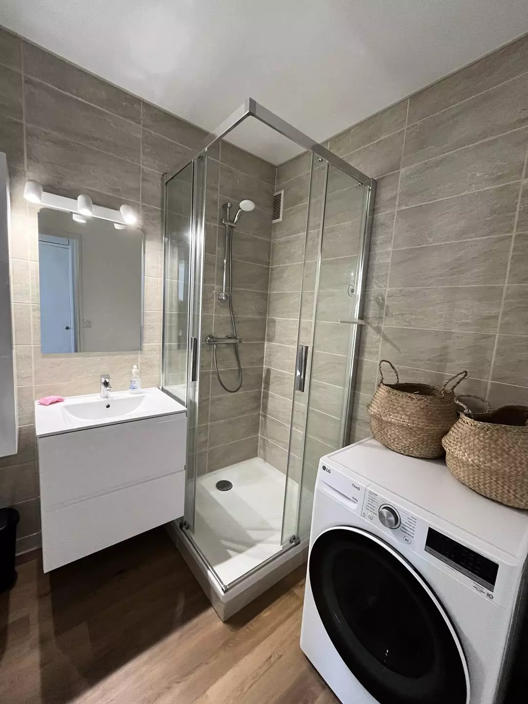 -Bathroom with shower, towel dryer, sink, hair dryer, mirror, washing machine/dryer;