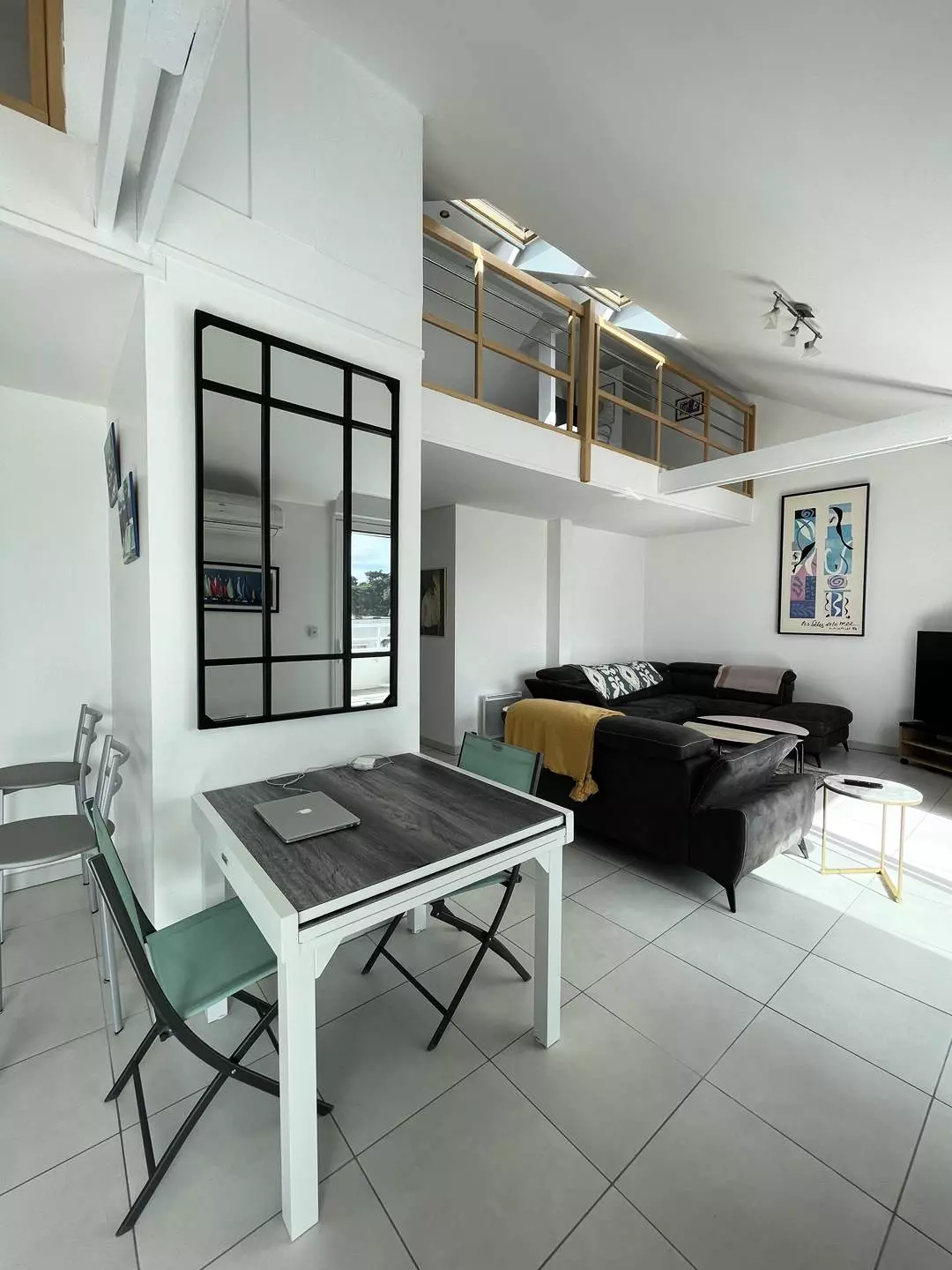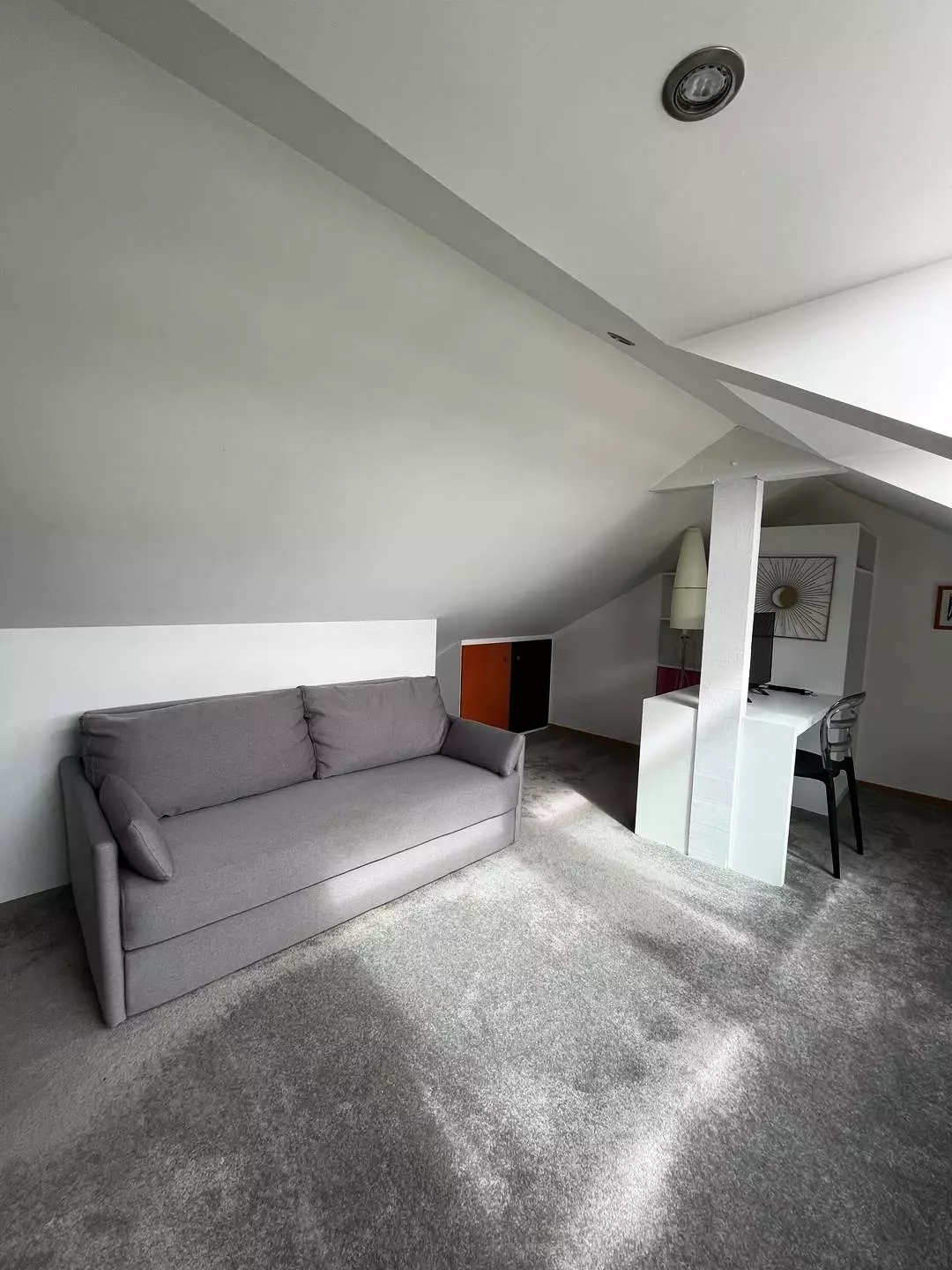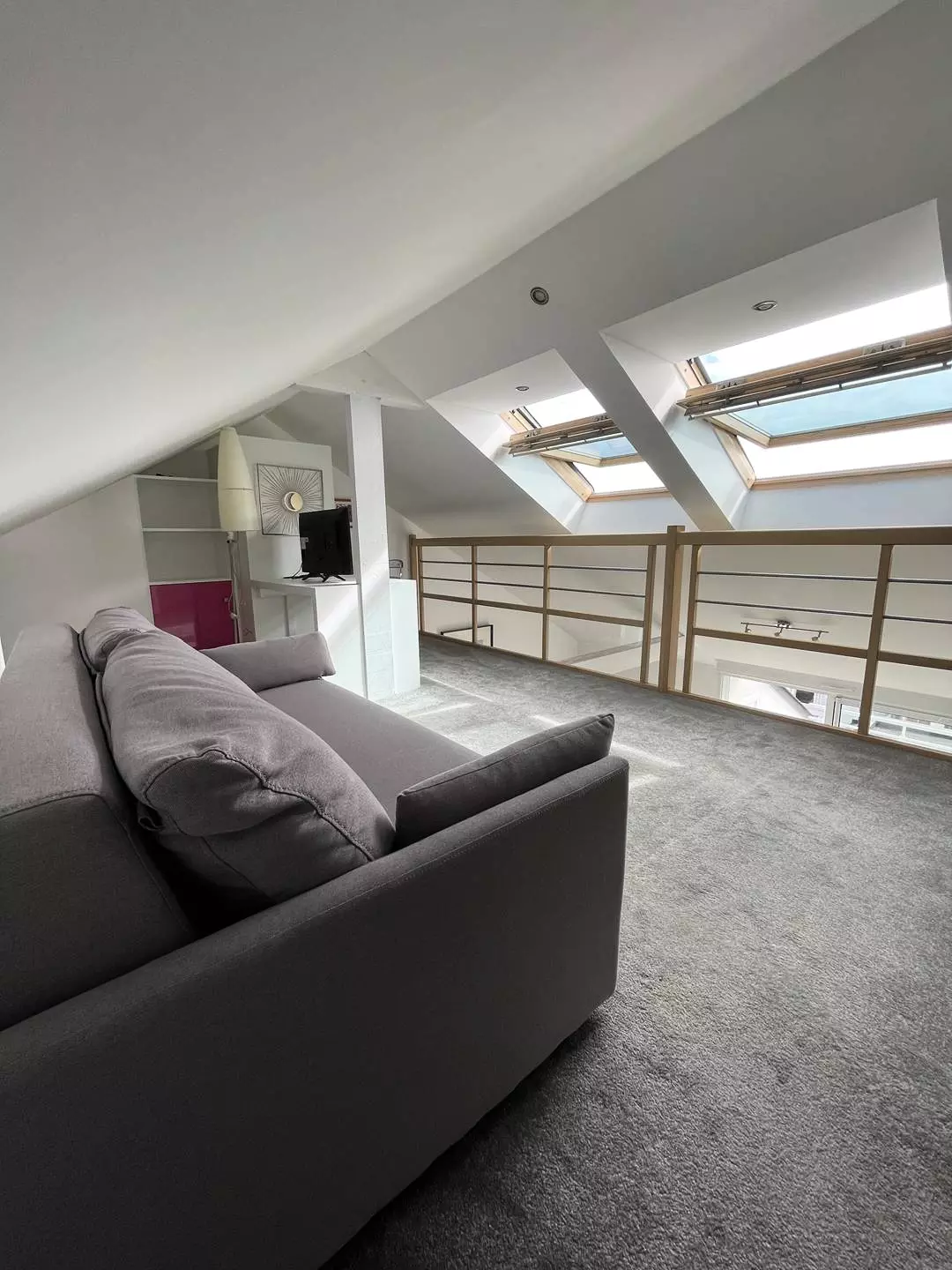 -A mezzanine (relaxation area) with a convertible sofa, a desk, a television, a wardrobe;