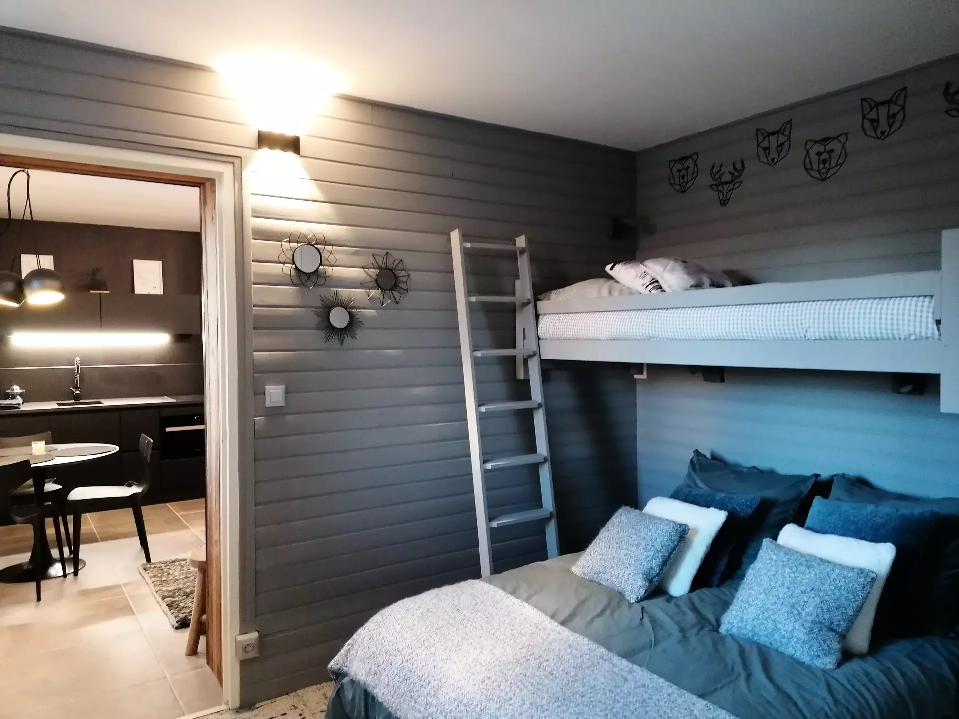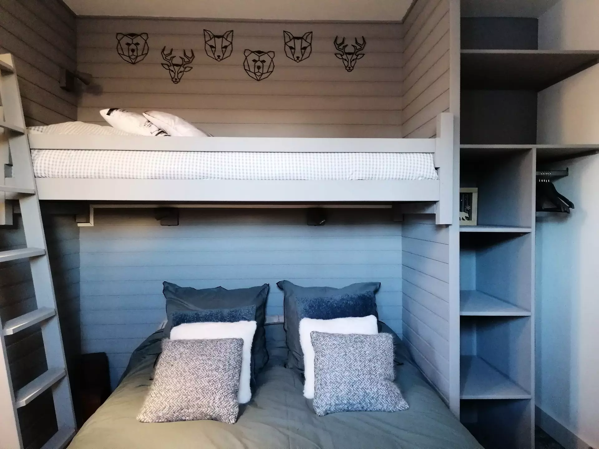 * Bedroom: 1 double bed (140*190), 1 mezzanine bed (80*190), electric shutters;