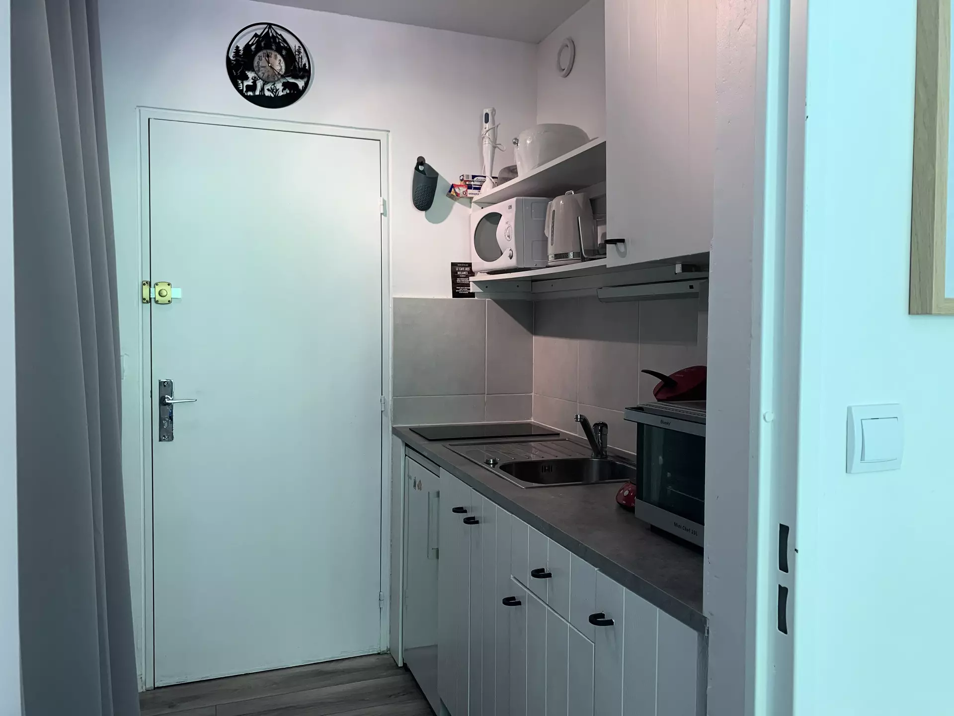 * Kitchenette: refrigerator, 2 electric hotplates, mini oven, microwave, Senseo coffee maker, kettle, toaster, raclette machine, plancha;