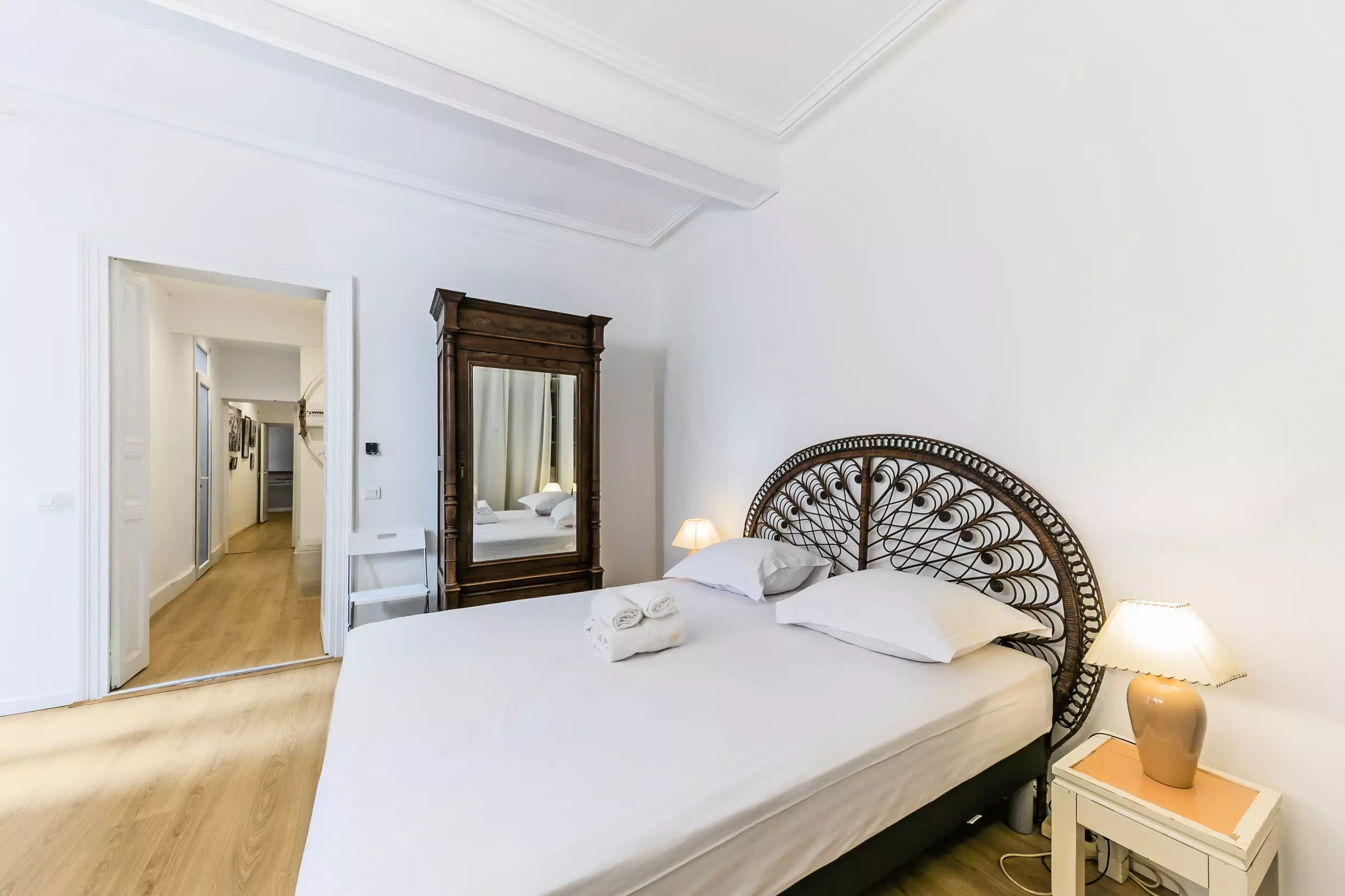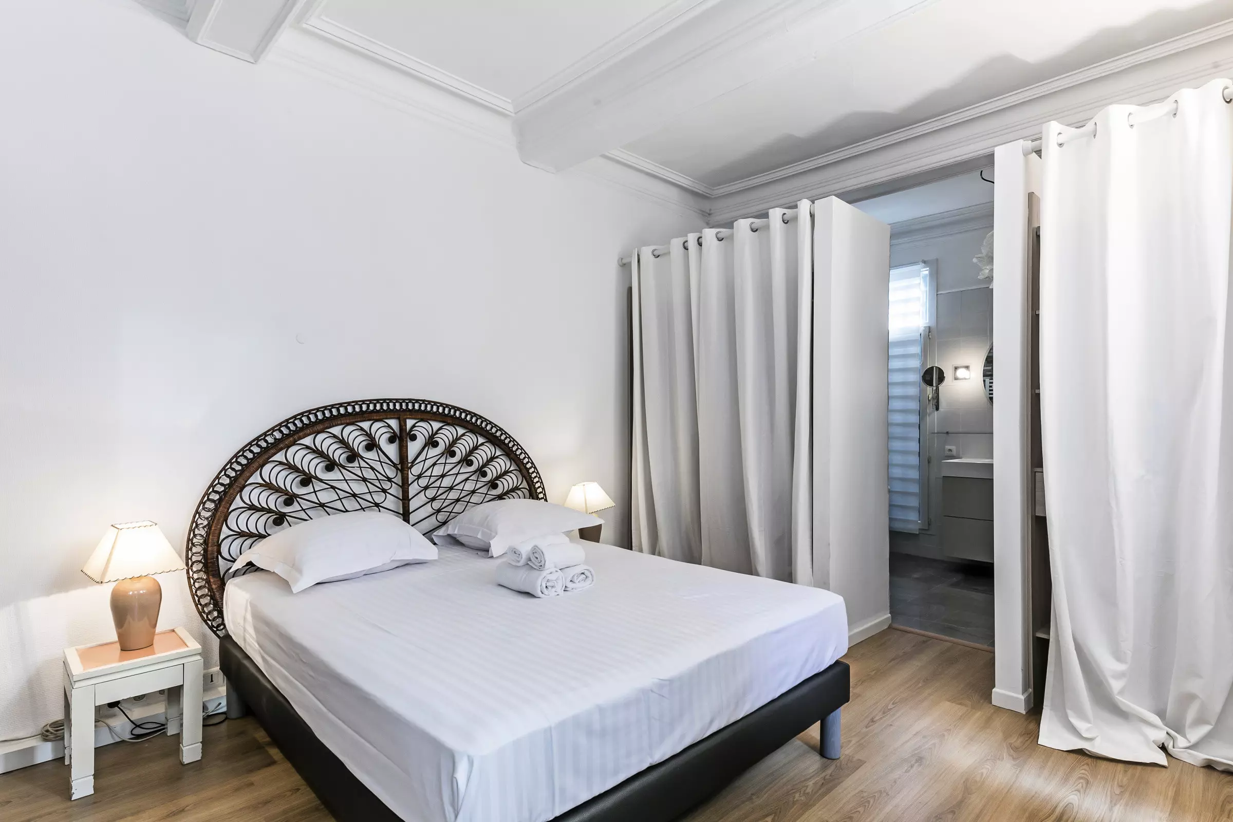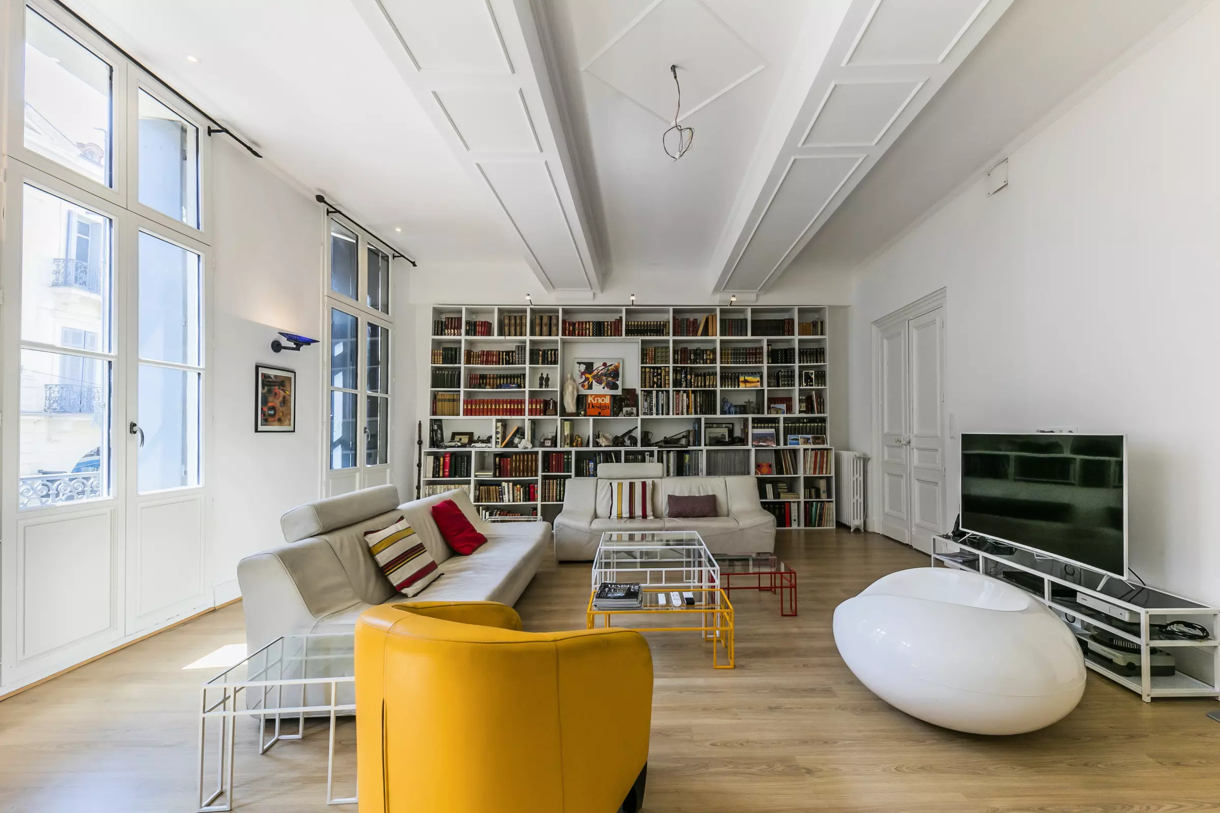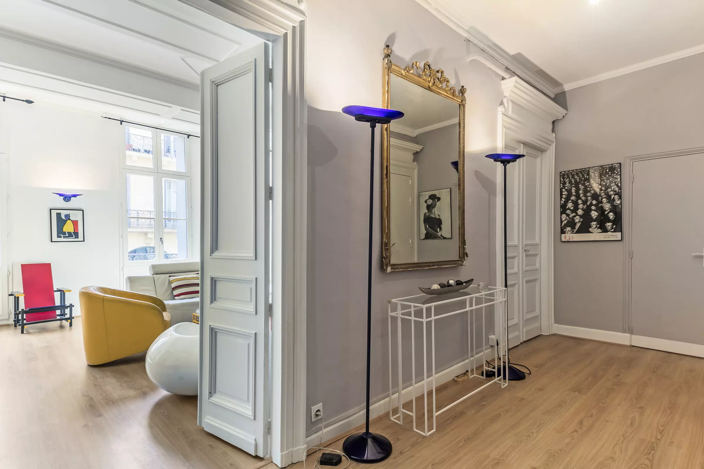 We selected "Villa Jeu de Paume" for its location, its style, and its elegance on the floor. A refined apartment with spacious and high ceilings, "Villa Jeu de Paume" is a true bourgeois apartment in the purest Haussmannian style. It features a large living room, a library, beautiful large French windows, and two bedrooms with separate bathrooms. There is an interior patio for breakfast. The bedrooms overlook the rear patio. The owners welcome you to their home during their absence, whether for a few days or several weeks. You can read one of the countless books in the majestic library on the sofa, or relax on the sofa. The master bedroom is air-conditioned.