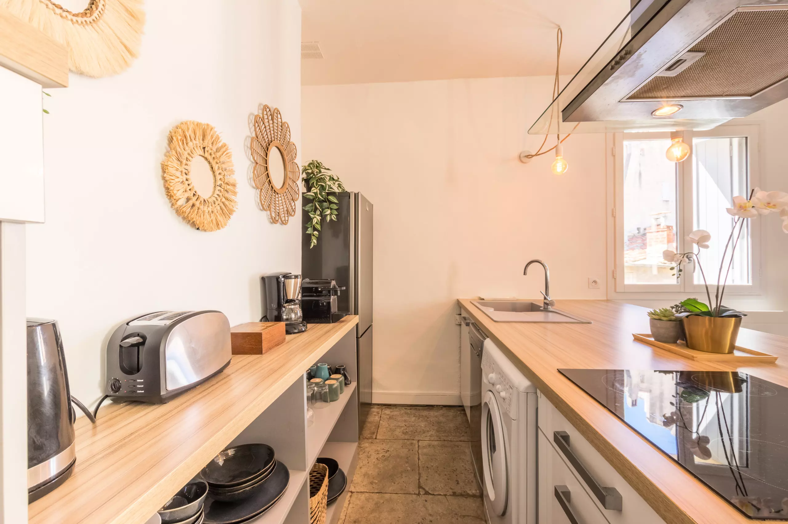 If only for its location, because it is located in the upper part of the historic center (Ecusson), but especially for its dominant and quiet position, with a view of the rooftops of Montpellier. The apartment is dual-aspect, and bathed in light with its three windows. Ideal for short or long stays, it has been completely renovated according to the rules of the art. Beautiful and large American kitchen, 4-burner ceramic hob, extractor hood, dishwasher, washing machine, microwave oven. Walk-in shower with a water heater for stress-free lounging under long hot showers, separate toilet. Soft and comfortable 160cm bedding, large closet in the bedroom.