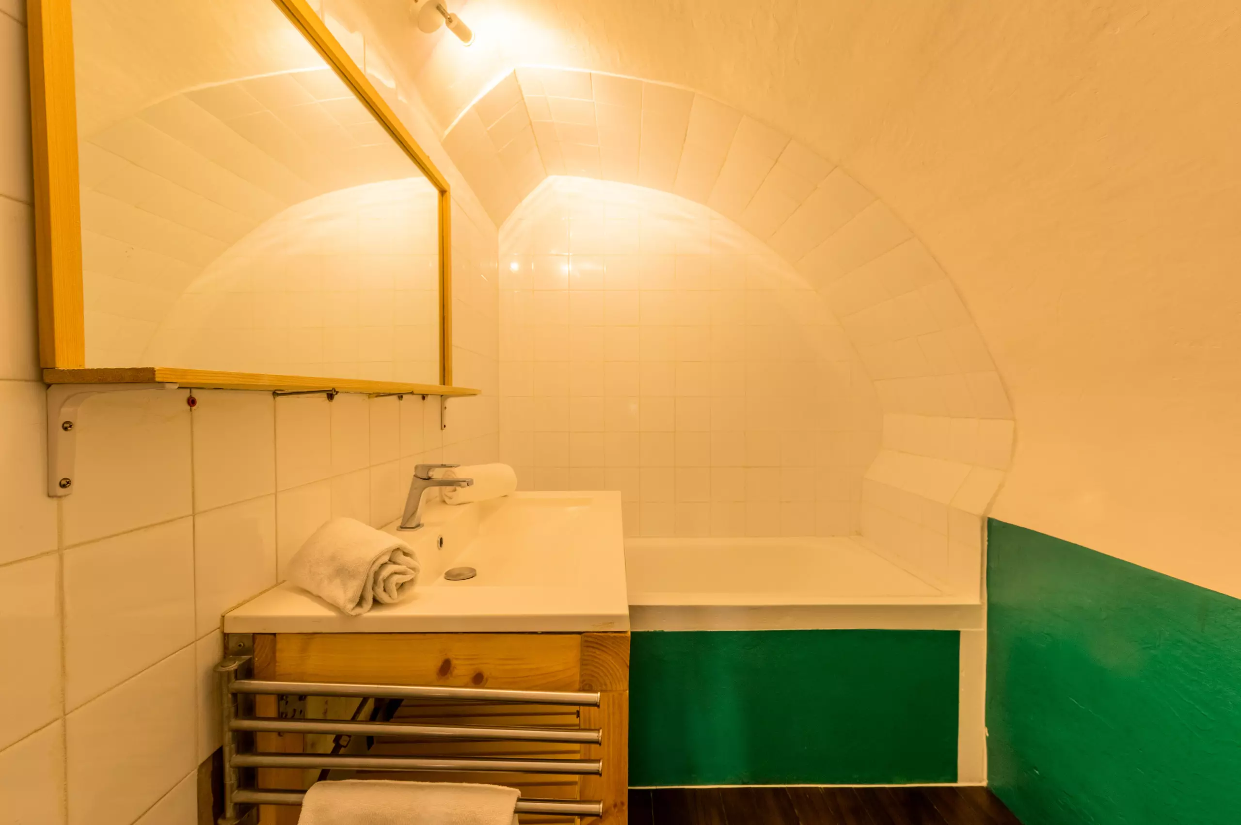 This apartment offers a unique setting with its old vaulted ceilings, exposed stone and typical Montpellier floor bars in the kitchen and living room.