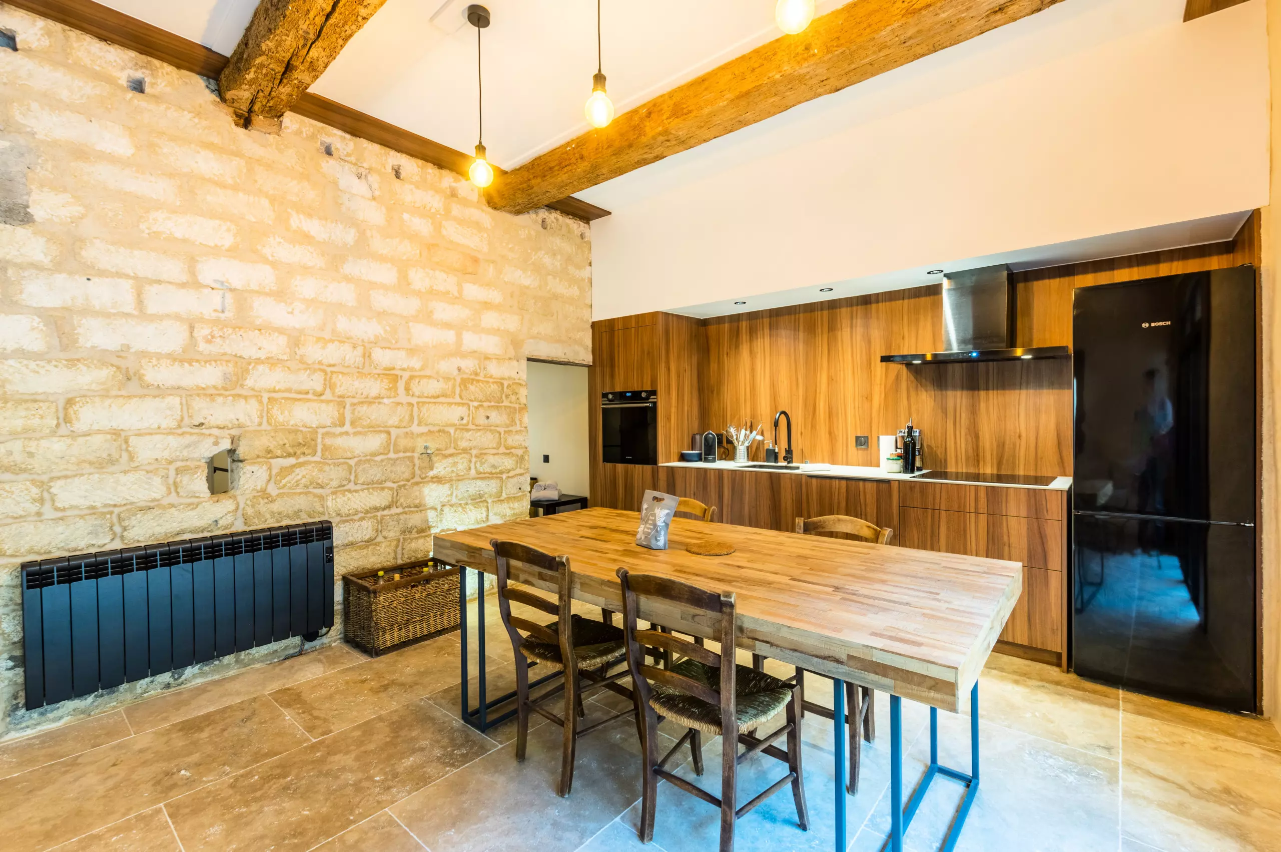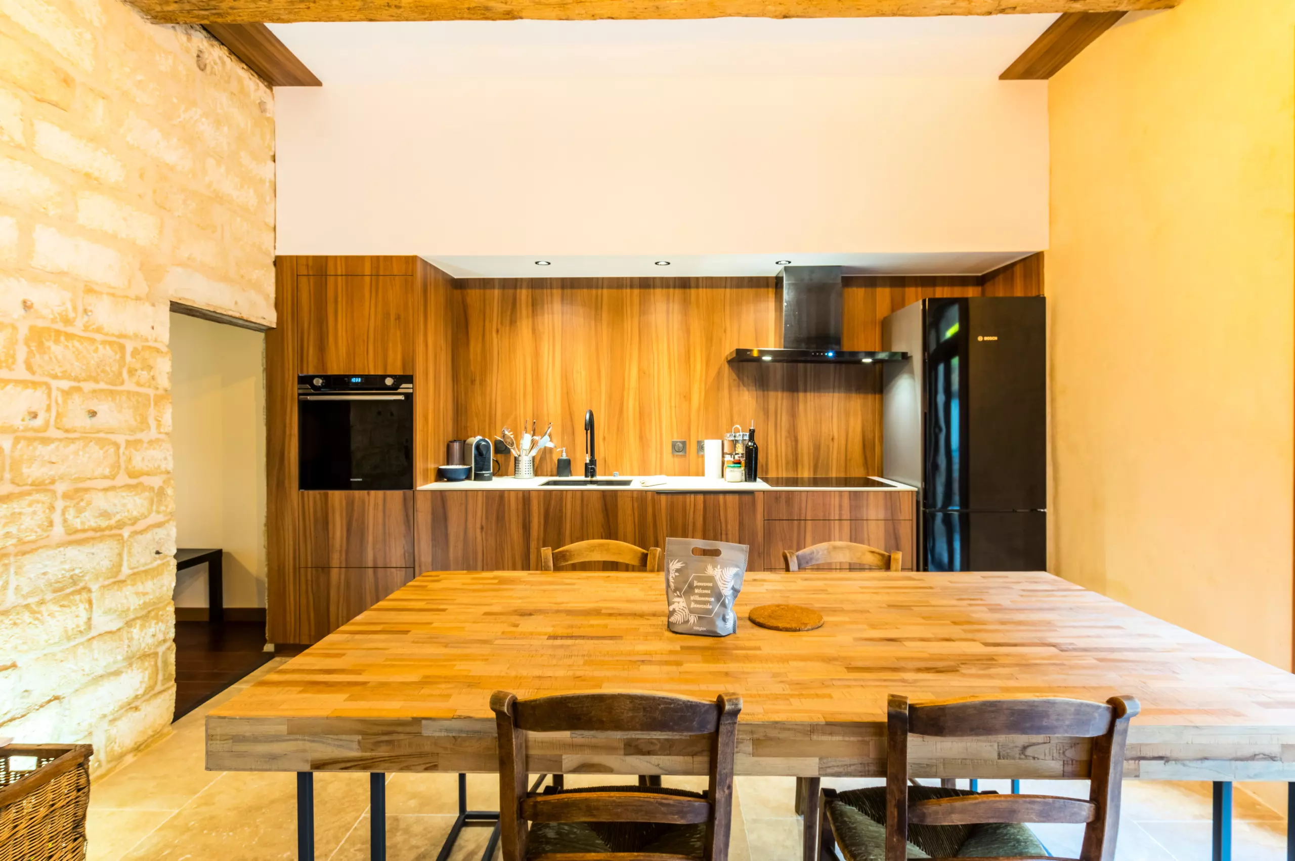 The open-plan kitchen, with ceramic hob, is equipped with a refrigerator, oven, freezer, dishwasher, dishes/cutlery, kitchen utensils and coffee maker.