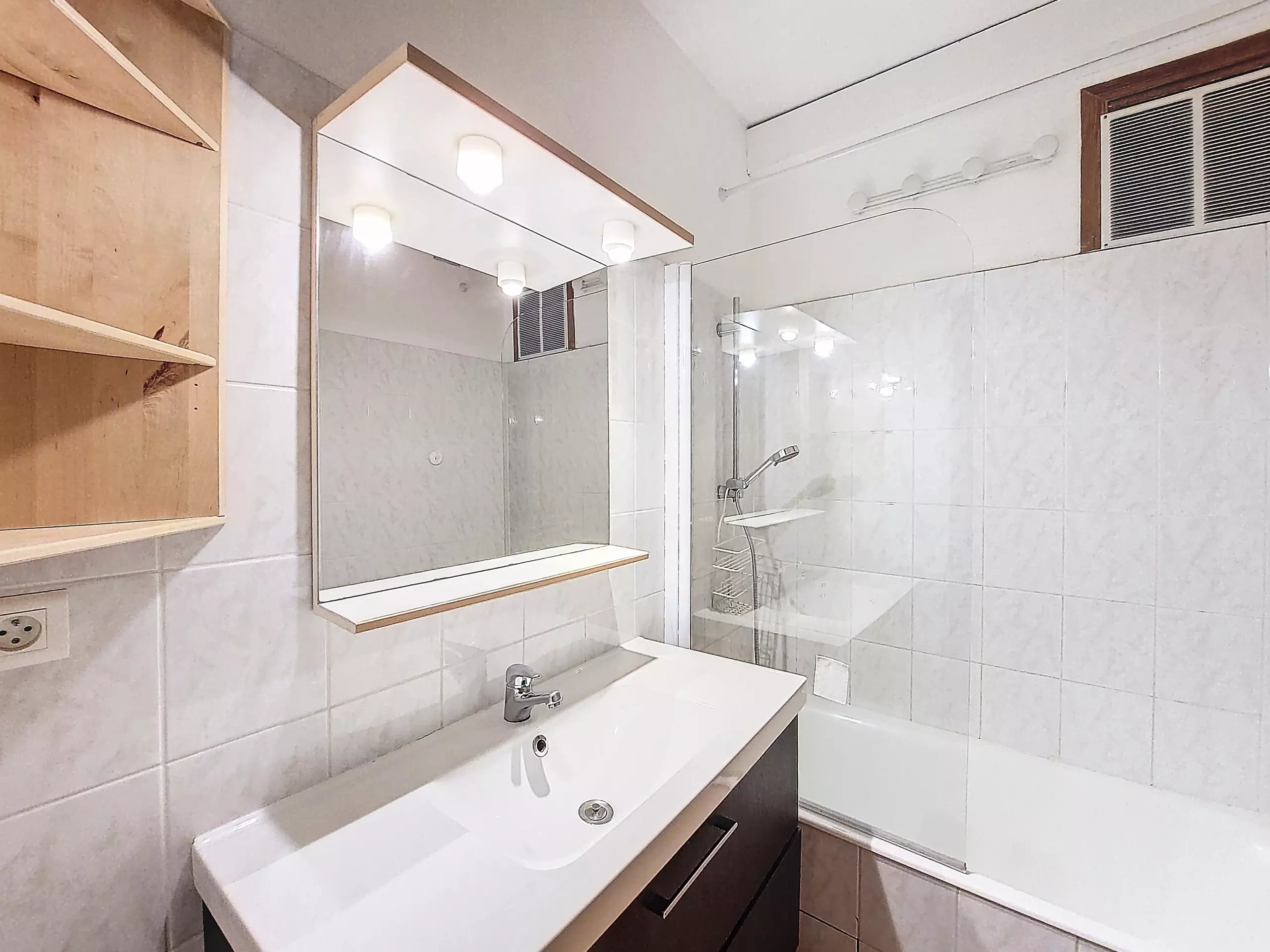 - 1 Bathroom with bathtub, shower screen and sink with storage unit