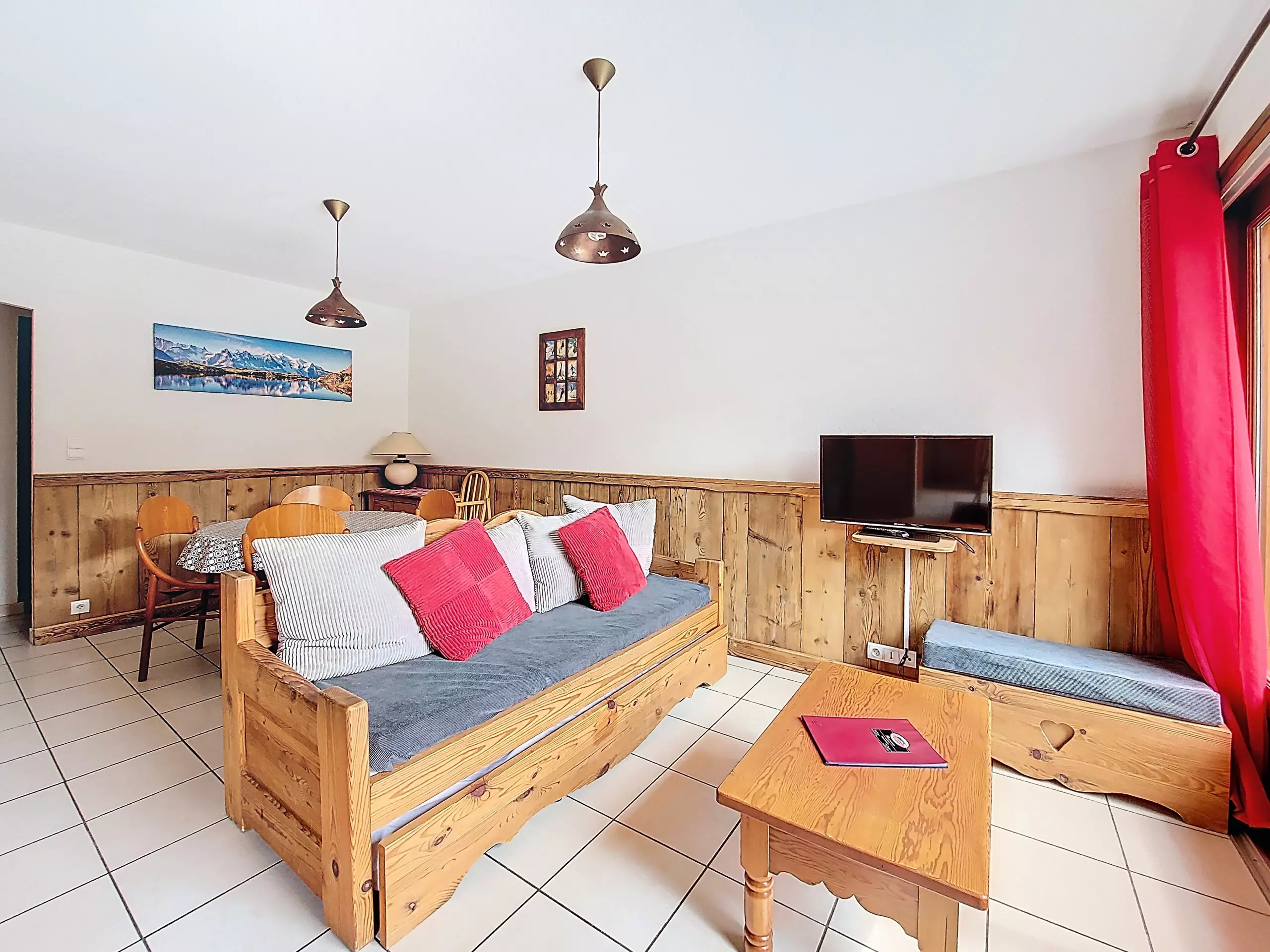 A lounge area with a convertible pull-out sofa bed (2x80x190), TV and DVD player