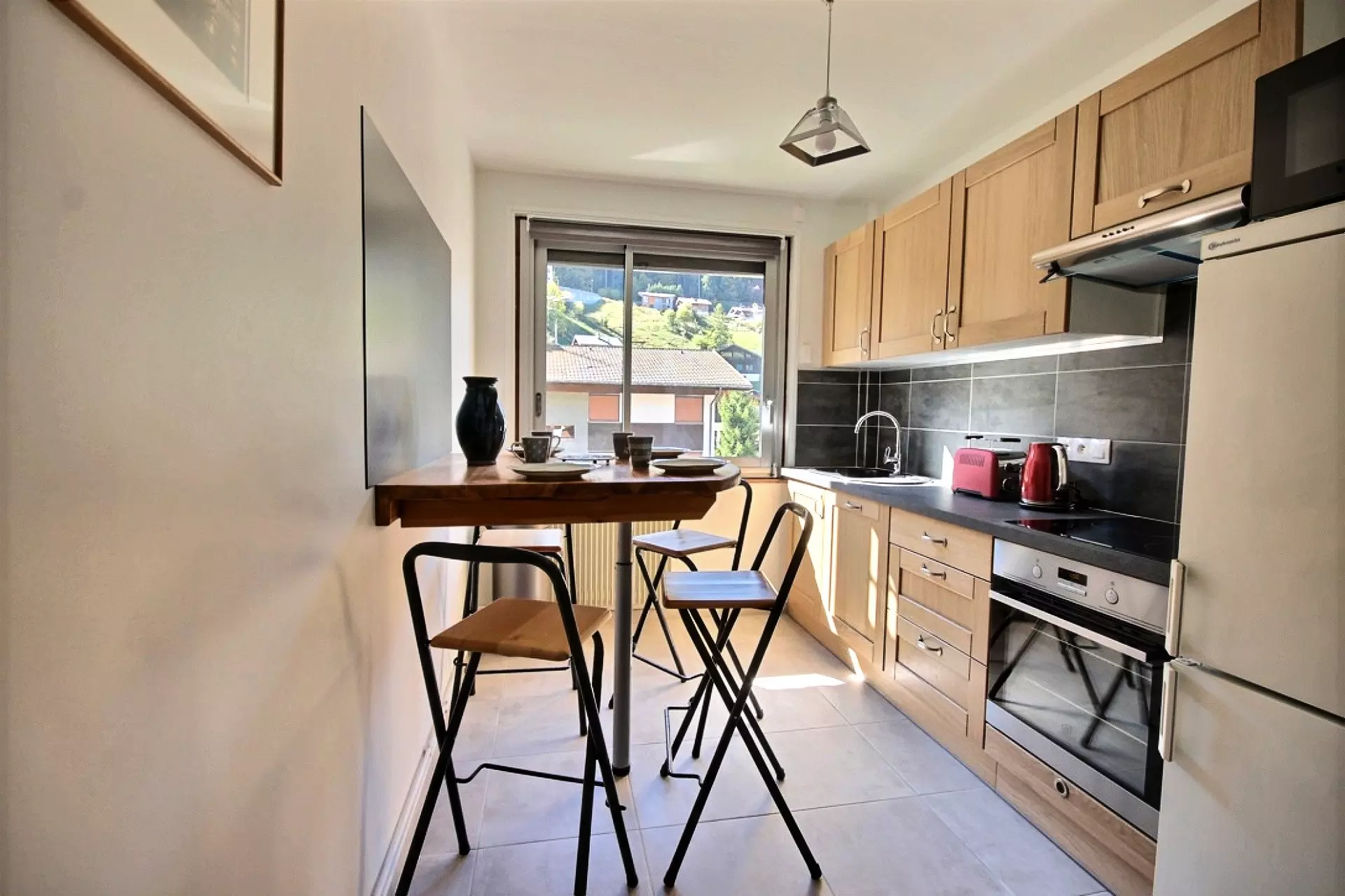 - 1 Separate fitted kitchen of 7.38 m² with: combined fridge with a capacity of 210 L, microwave oven, 3-burner hob, oven, extractor hood, dishwasher, filter coffee maker, kettle, toaster, high table + stools, crockery for 6 people.