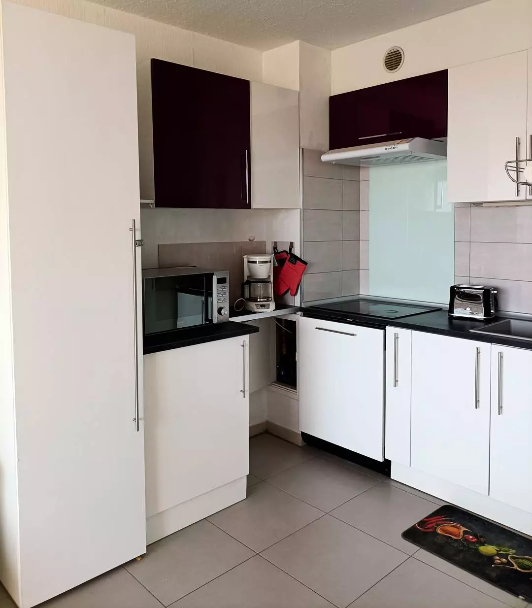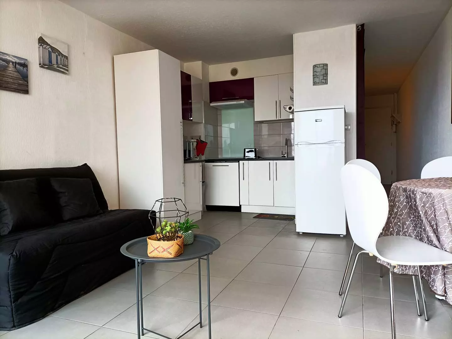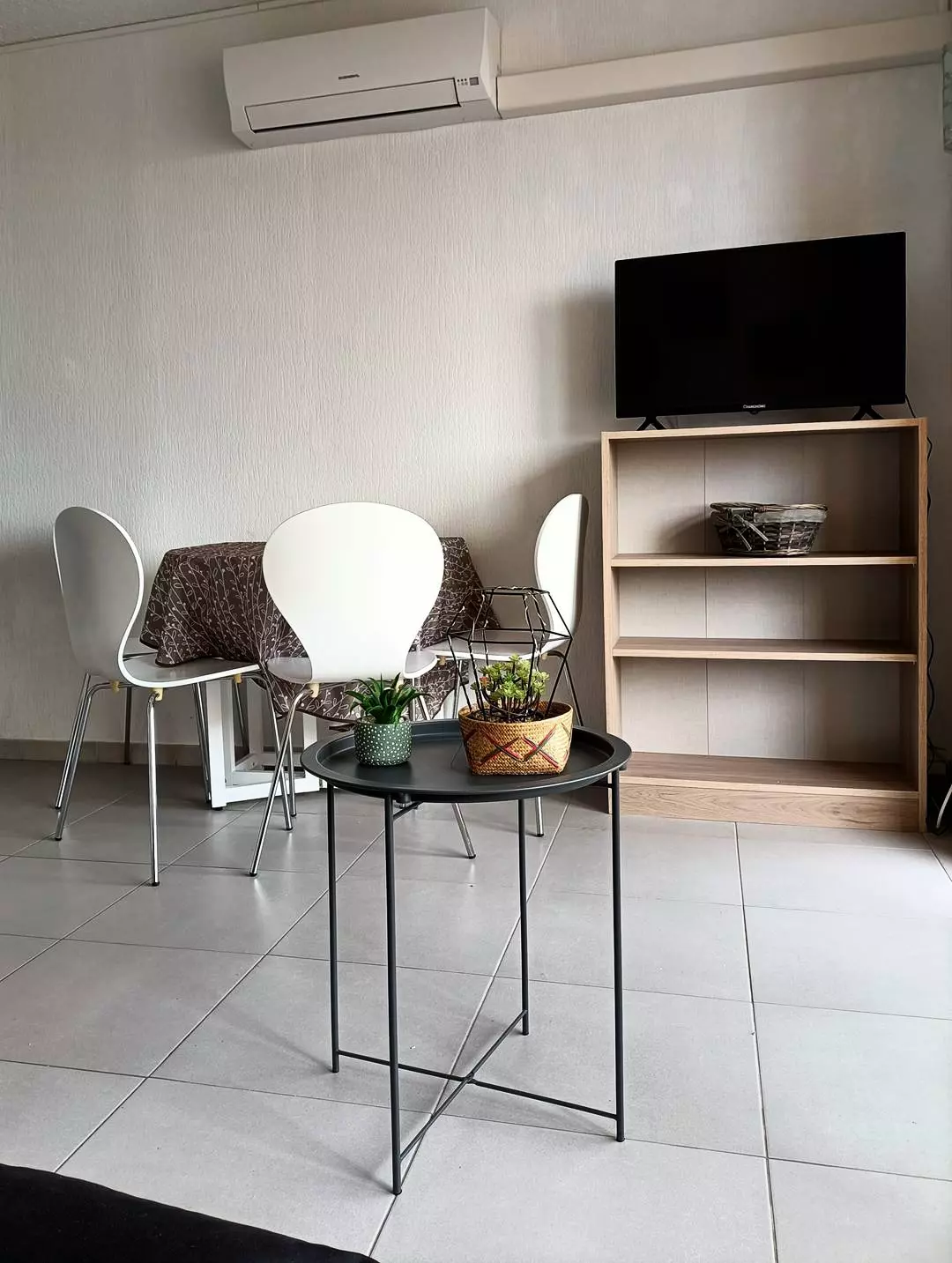 The main room has a sofa bed (120cm) for 2 people, TV corner, fully equipped kitchen (microwave, dishwasher, electric hob, fridge/freezer) terrace access.