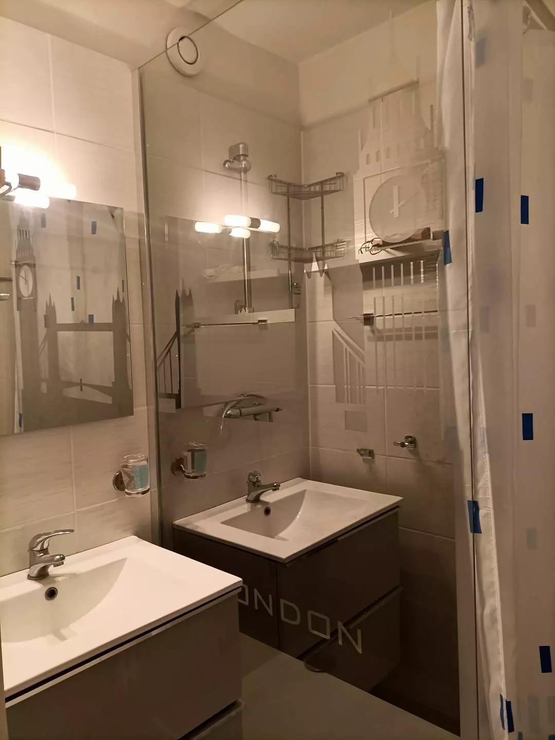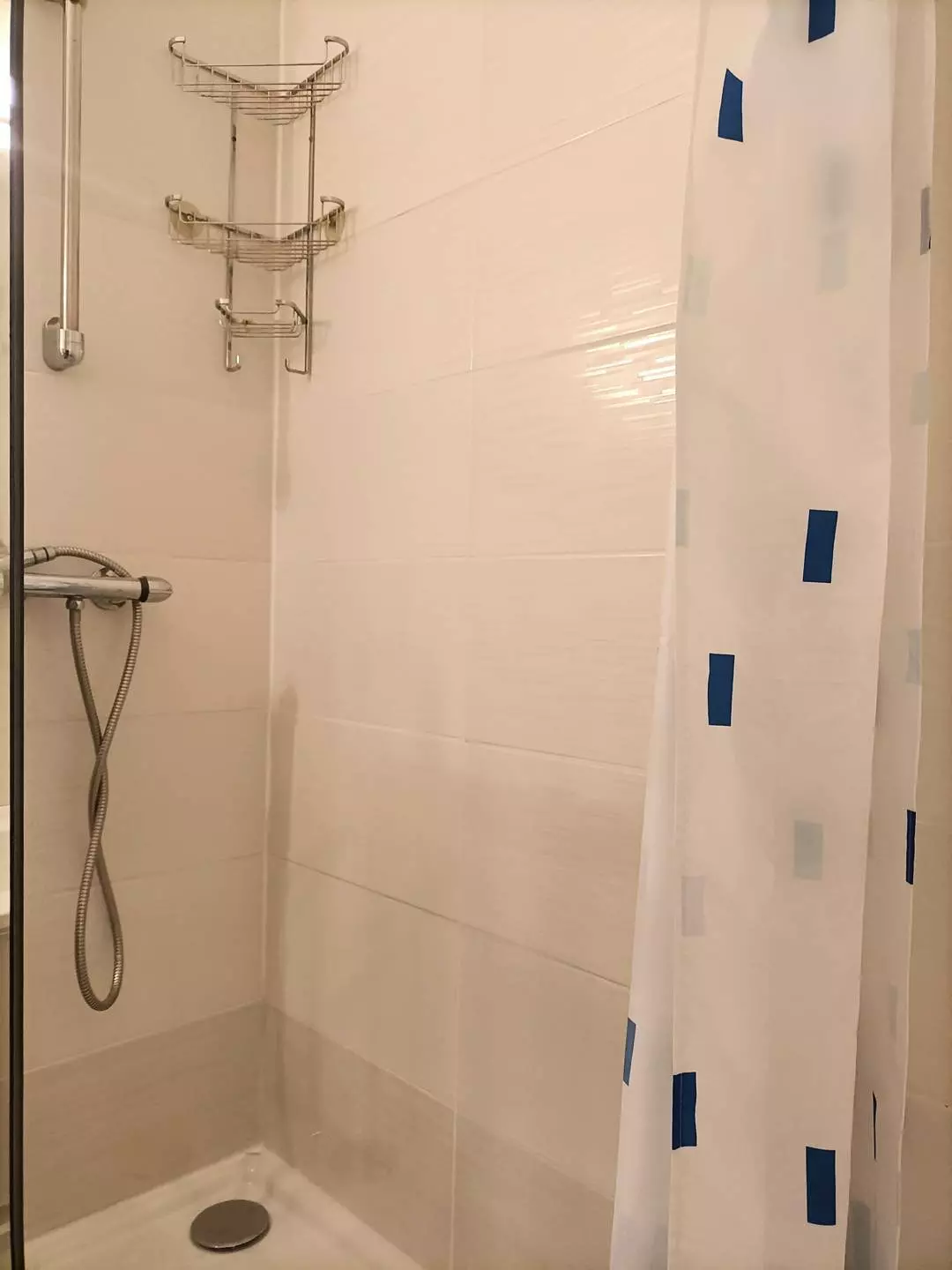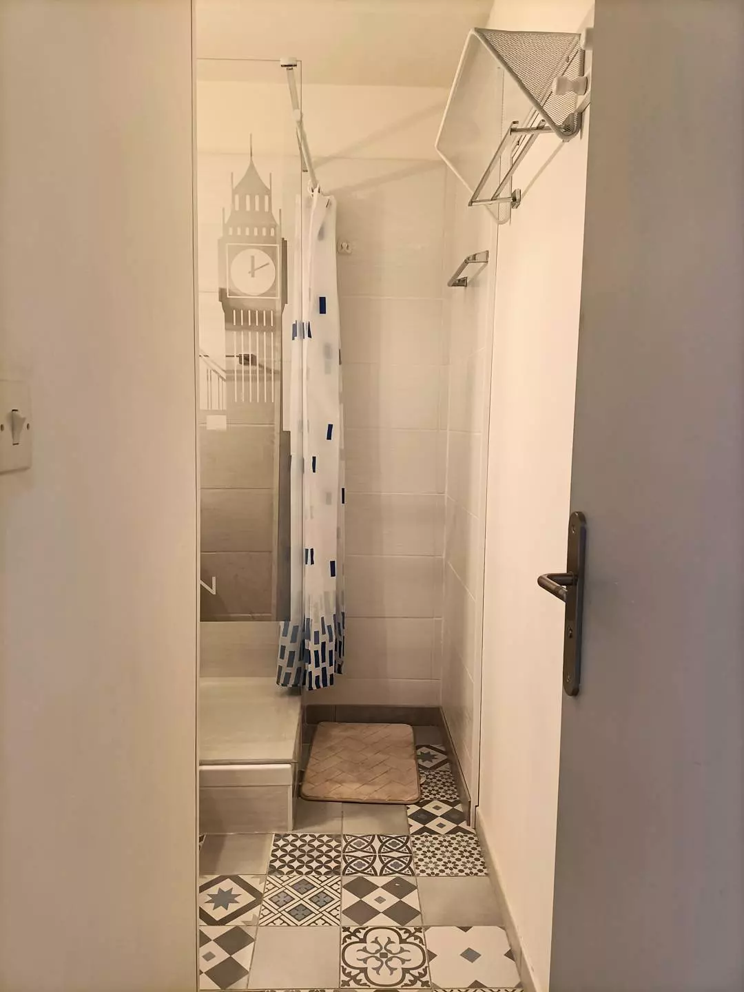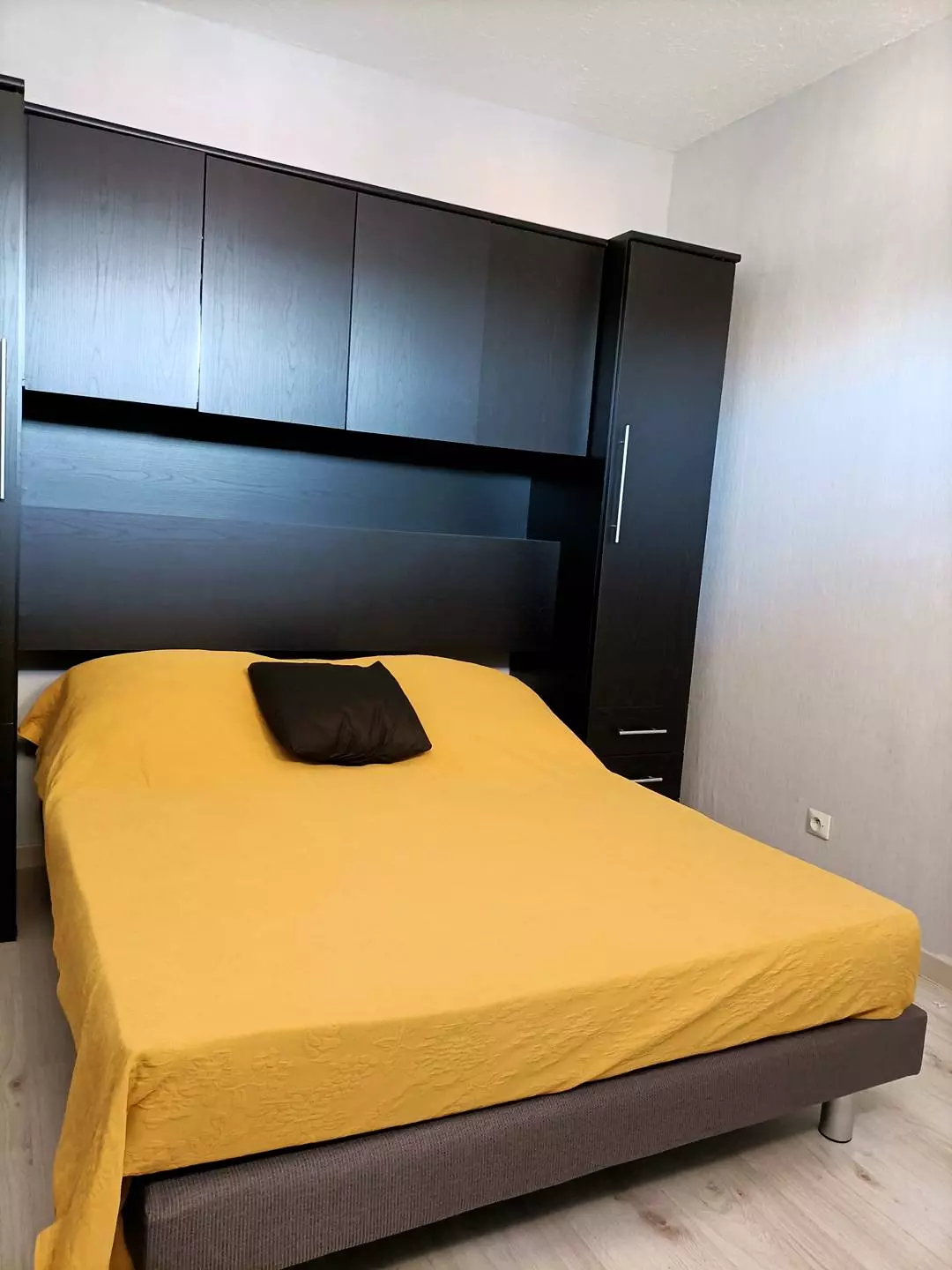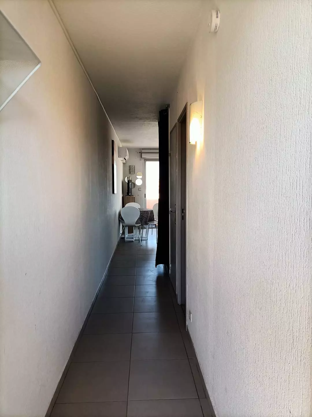 Entrance with corridor leading to a separate bedroom with double bed (140cm) and cupboards, a bathroom with shower and sink, separate toilet.