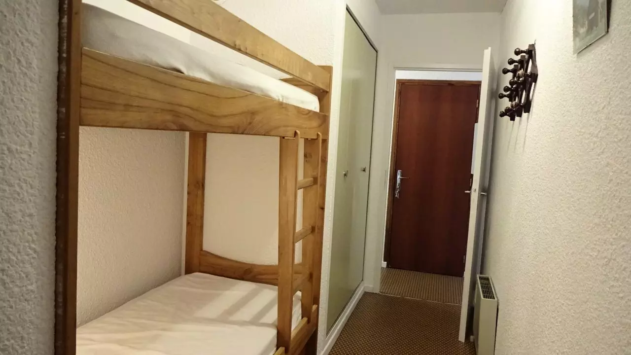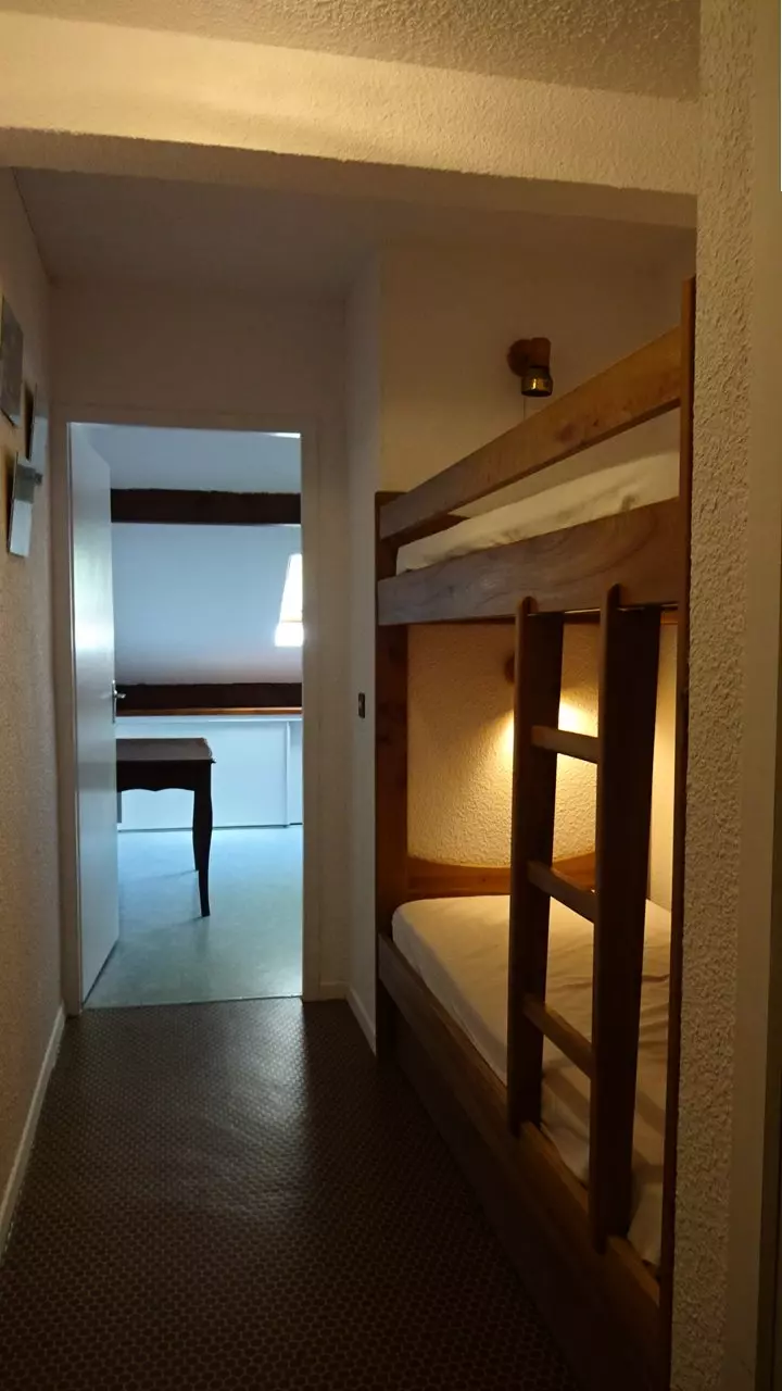 A bedroom with a 140cm bed and a storage unit facing east and two bunk beds in the hallway and storage cupboard. A bathroom with toilet. Enclosed garage.