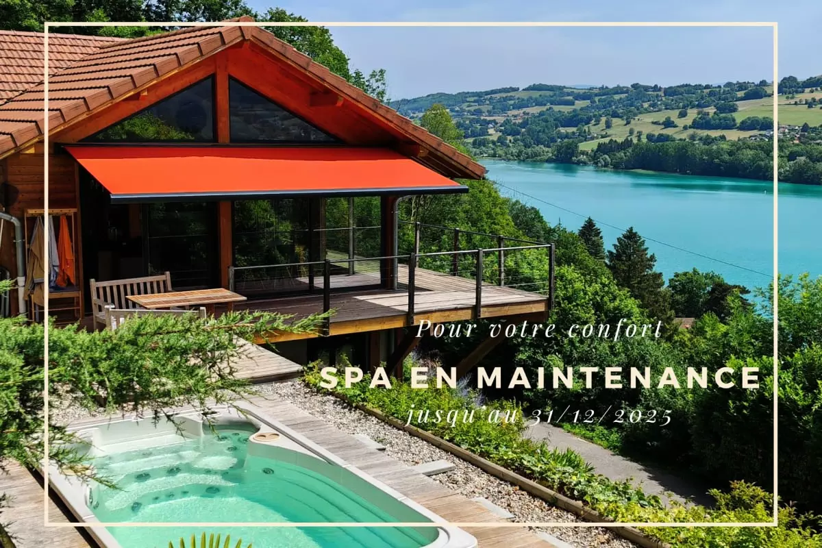 Perched on the hillside, the chalet offers a 180-degree panoramic view of Lake Paladru, its turquoise waters, and the surrounding hills. The balcony, which runs all the way around the chalet, leads to the terrace: hidden from view, it is equipped with a spa where you can relax while enjoying this breathtaking view.
