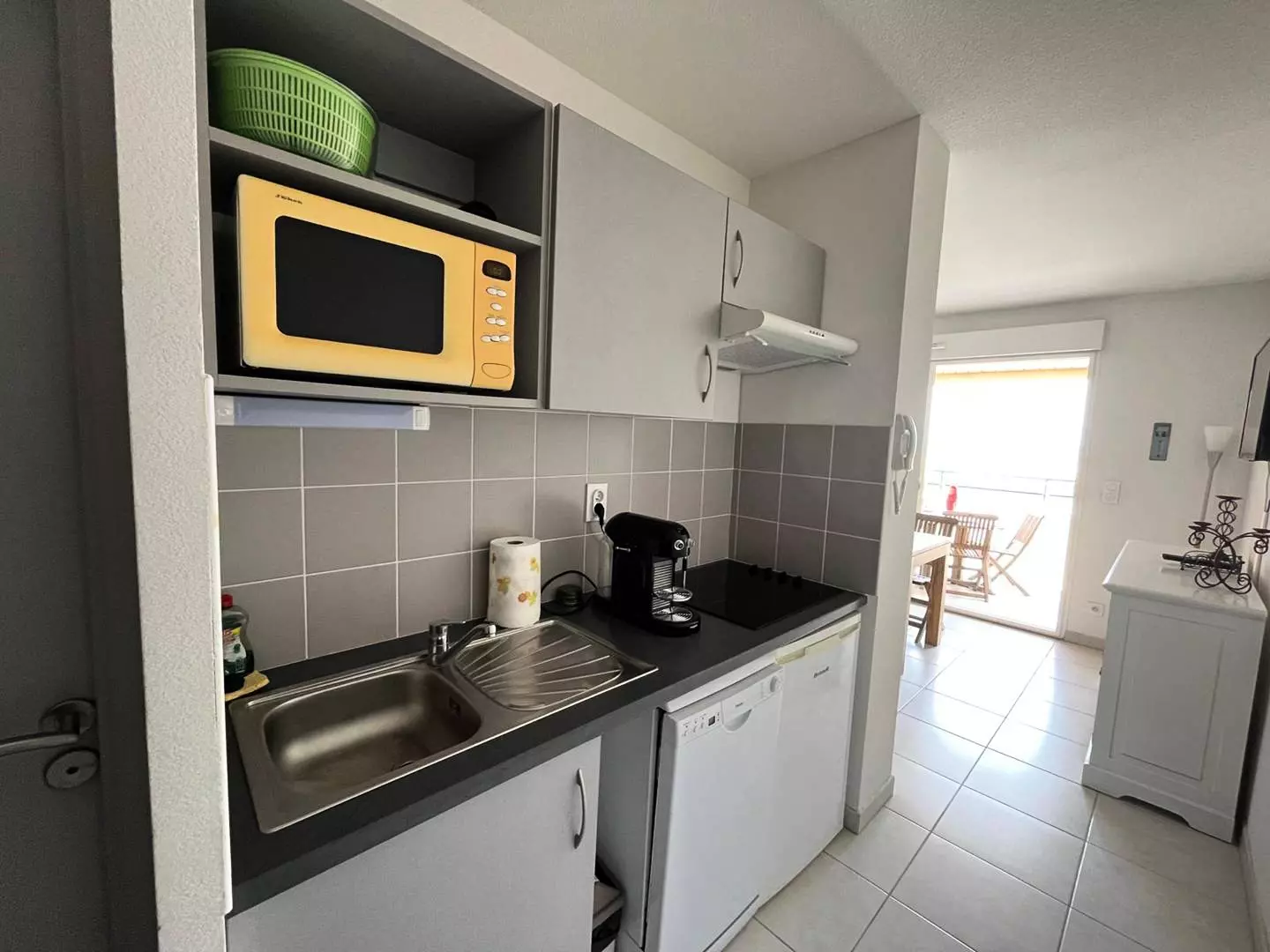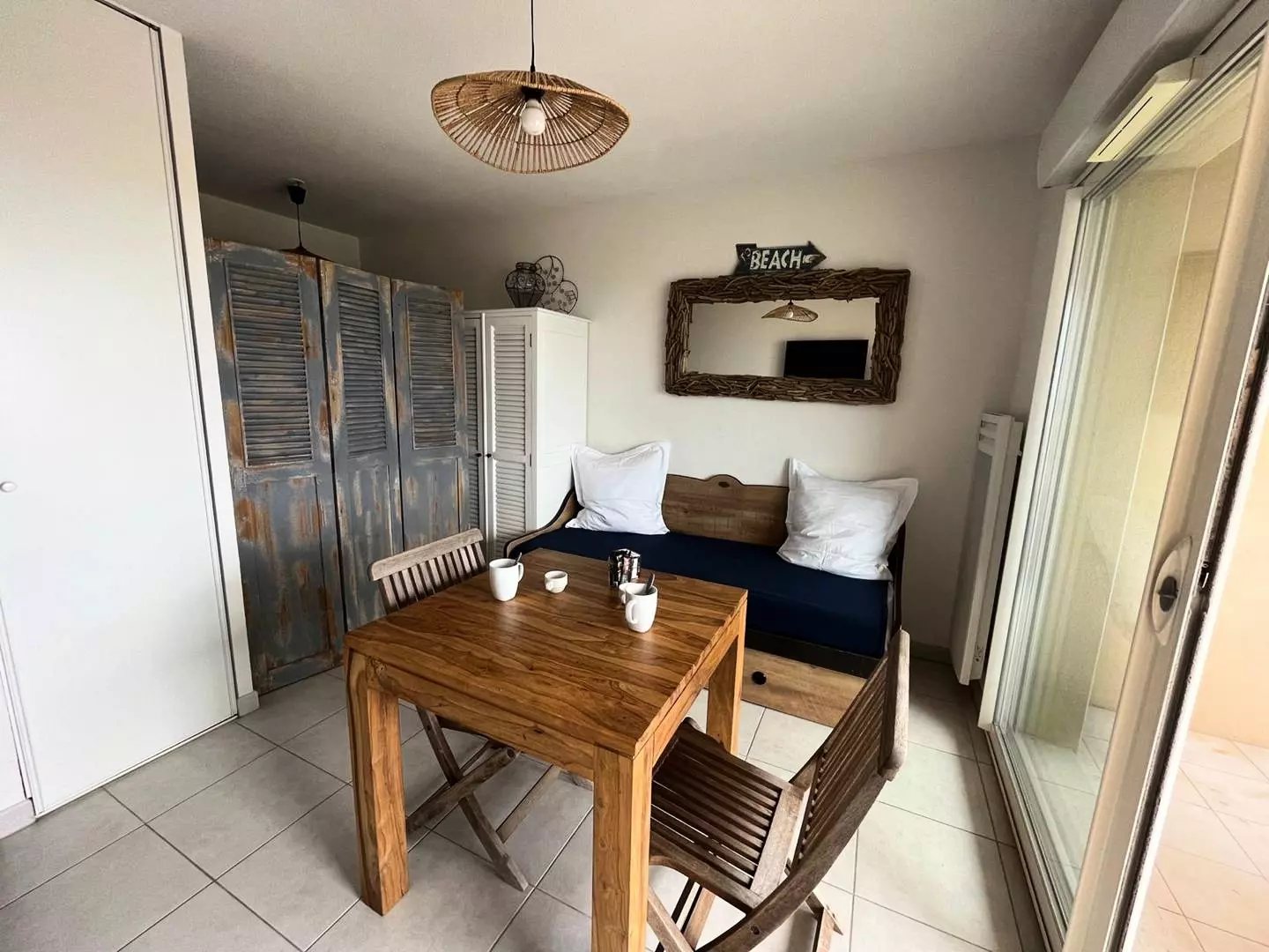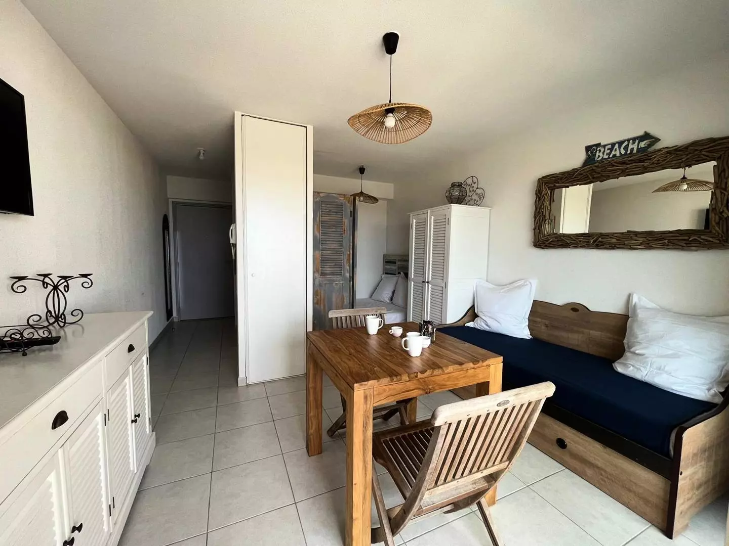 Air-conditioned studio in a residence close to shops and the beach, it is composed of a main room with a trundle bed (80cm), television and equipped kitchen area: hotplates, top refrigerator, microwave, dishwasher, coffee maker. You also have a sleeping area with a double bed (140cm). A bathroom with shower, sink, toilet and washing machine. You can also enjoy a large terrace to have your meals while having a view of the sea.