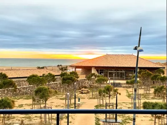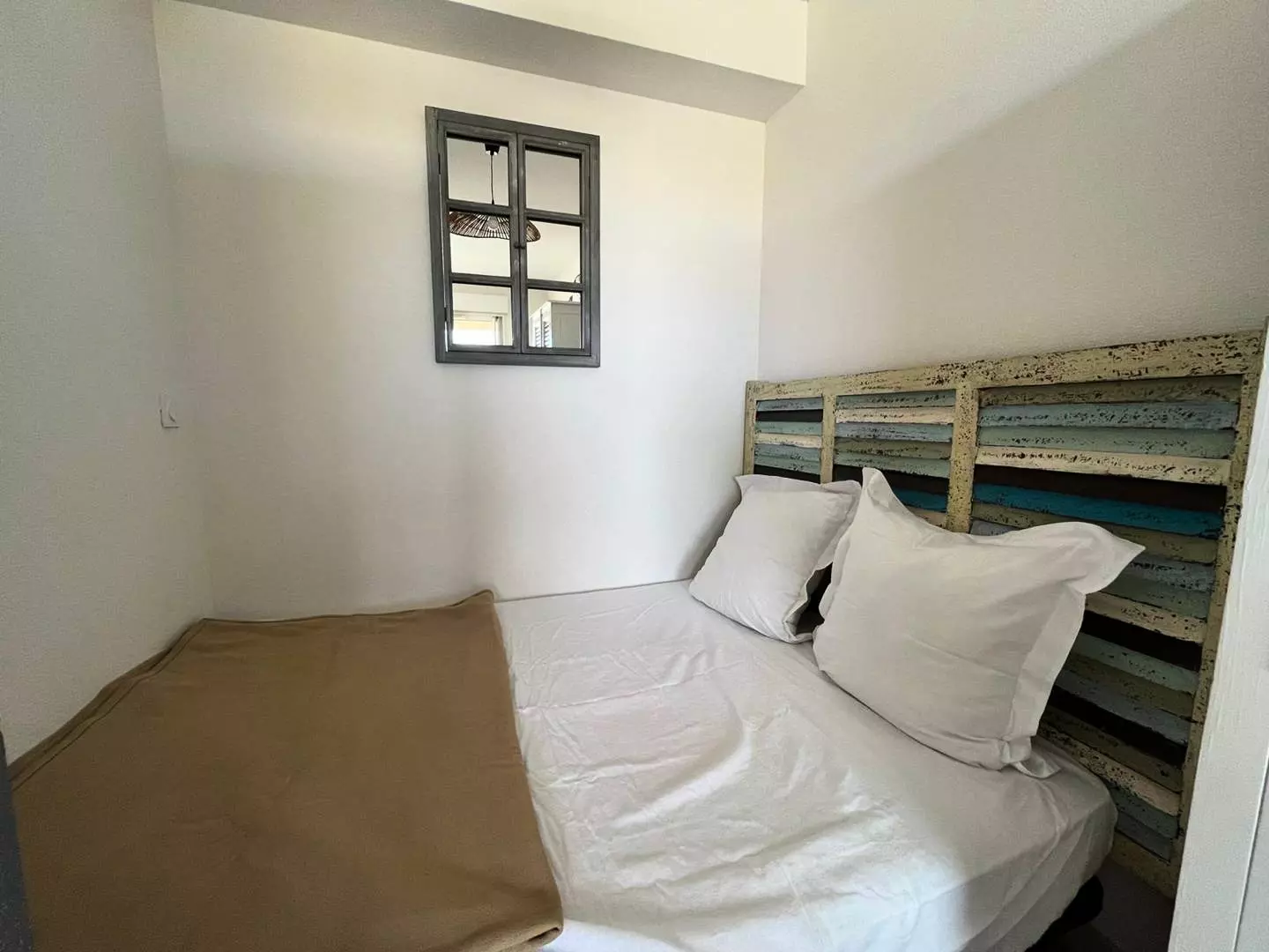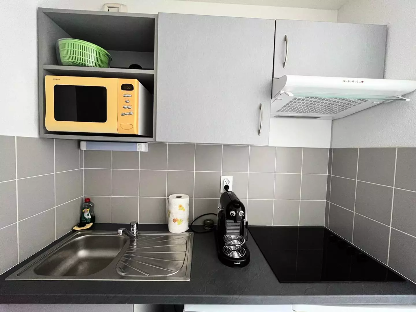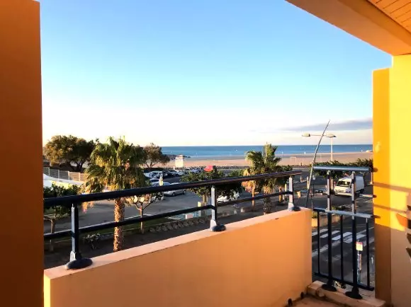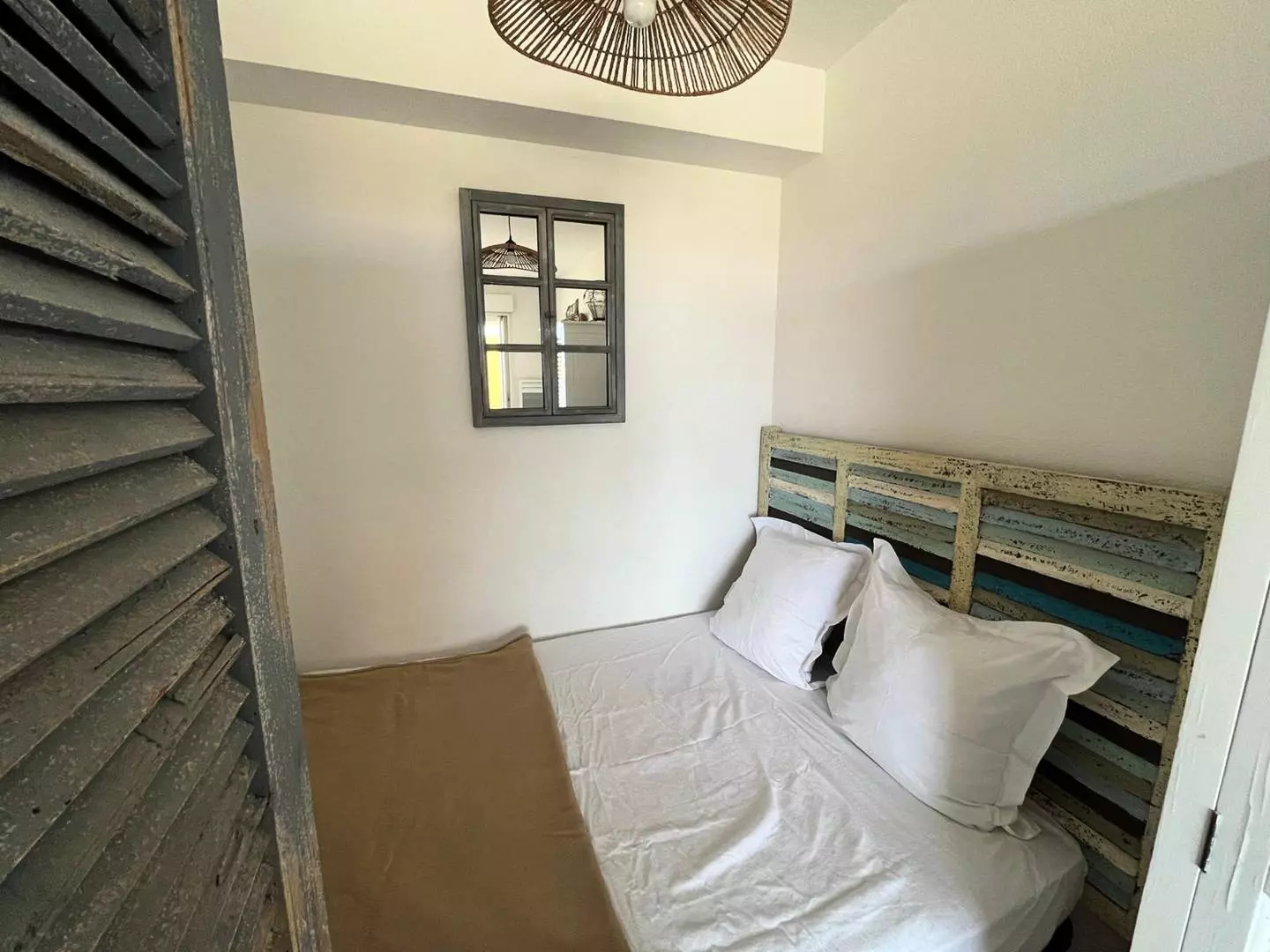 Air-conditioned studio in a residence close to shops and the beach, it is composed of a main room with a trundle bed (80cm), television and equipped kitchen area: hotplates, top refrigerator, microwave, dishwasher, coffee maker. You also have a sleeping area with a double bed (140cm). A bathroom with shower, sink, toilet and washing machine. You can also enjoy a large terrace to have your meals while having a view of the sea.