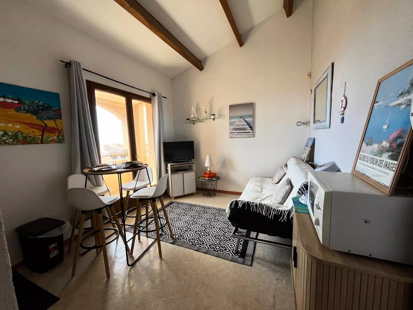 Located on the 2nd and top floor, comprising an entrance leading to the main room with living room, sofa bed for 2 people and television.