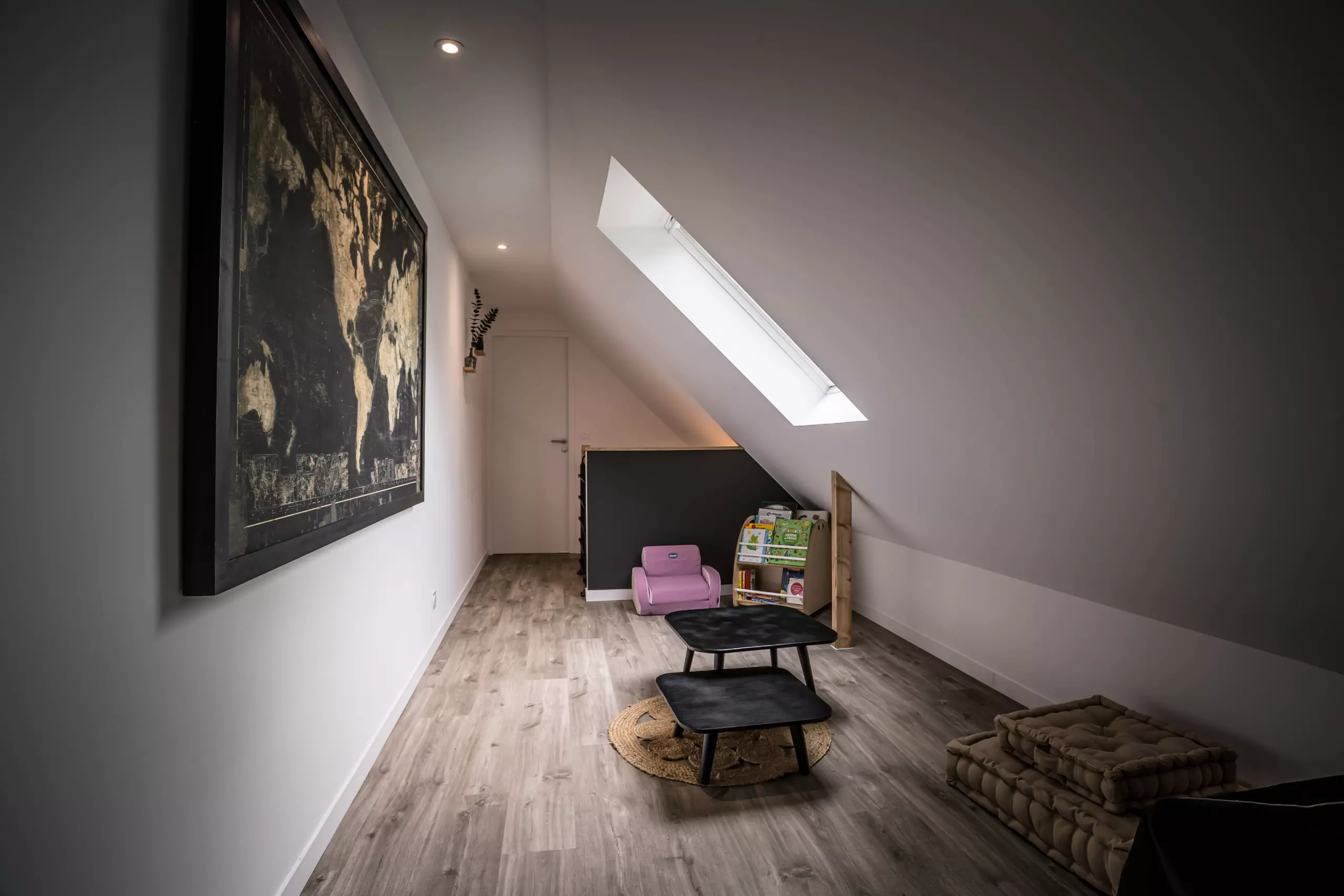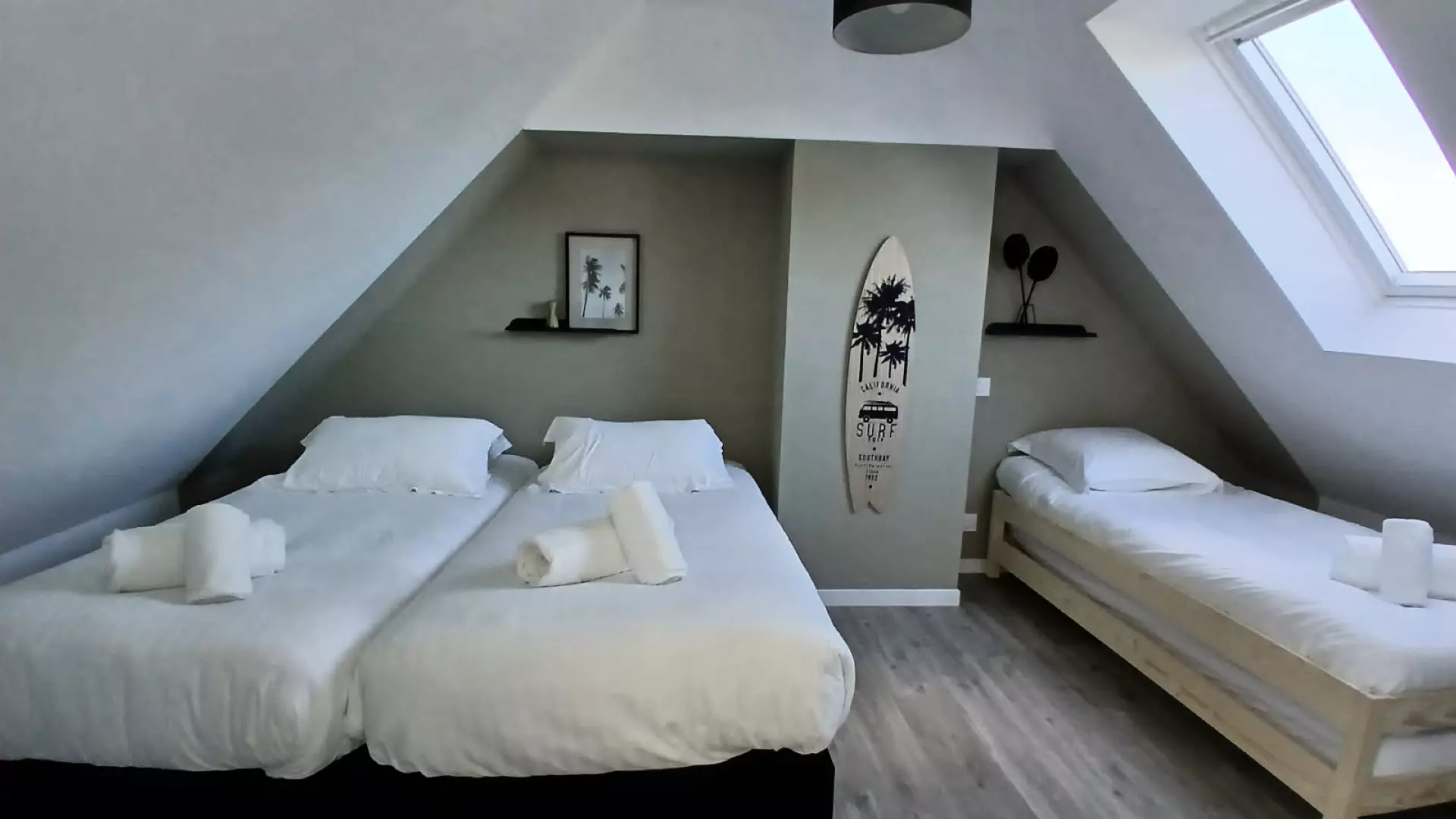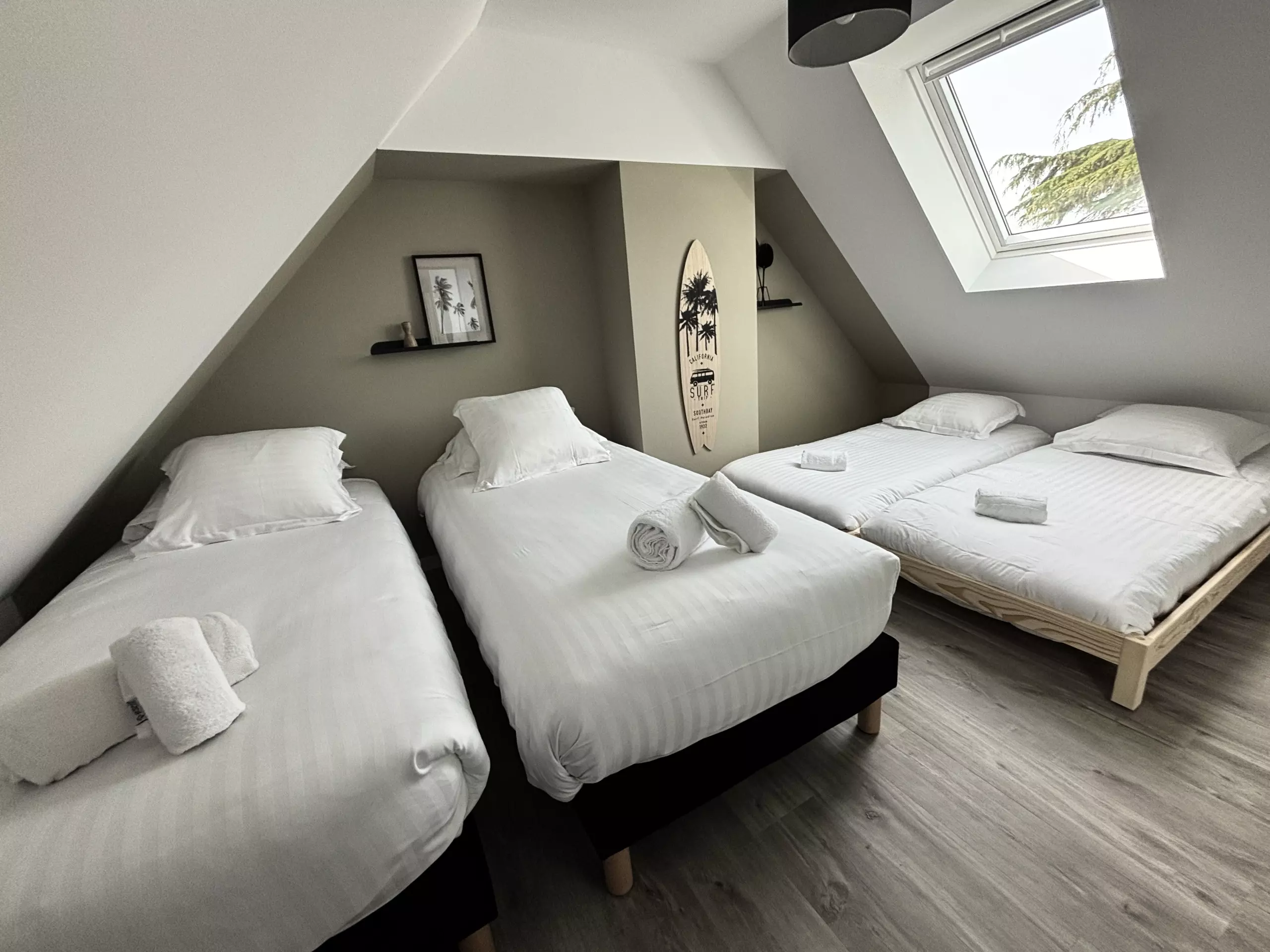 - Bedroom 3 (upstairs): 2 single beds of 80 cm and 2 single beds of 70 cm (ideal for children, see photo). Private shower room and toilet.
