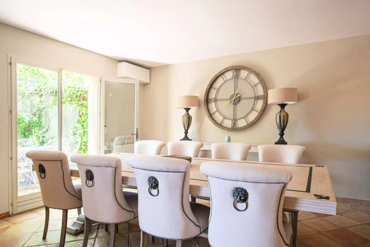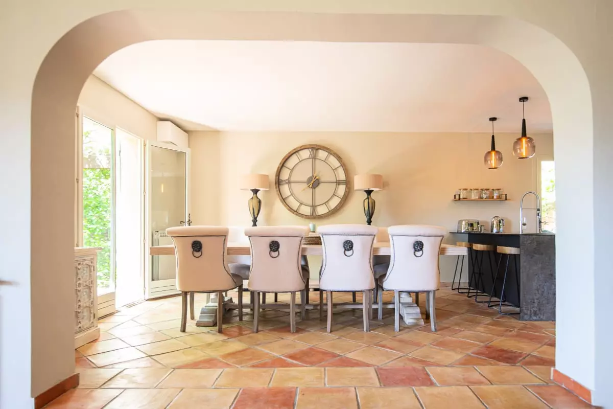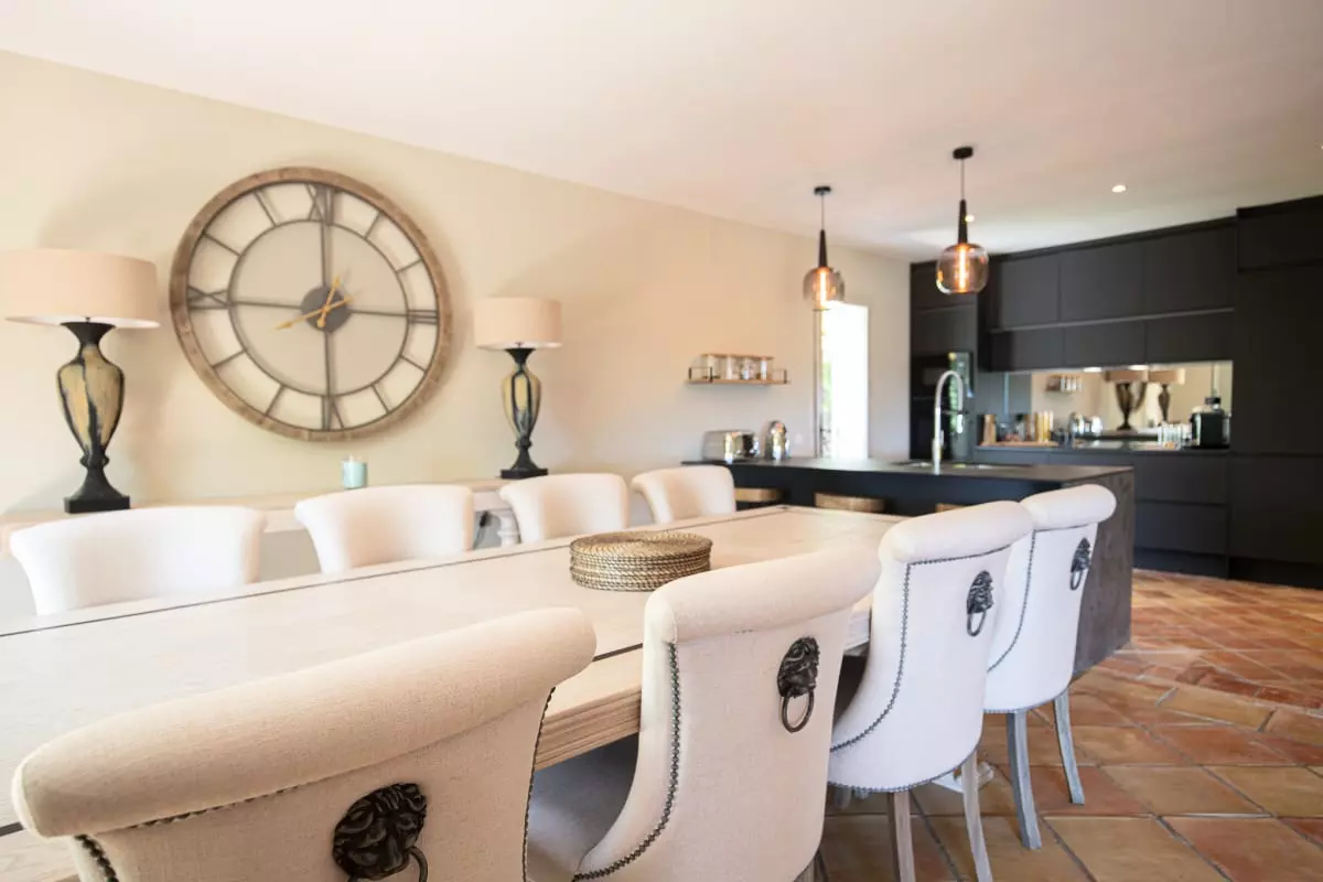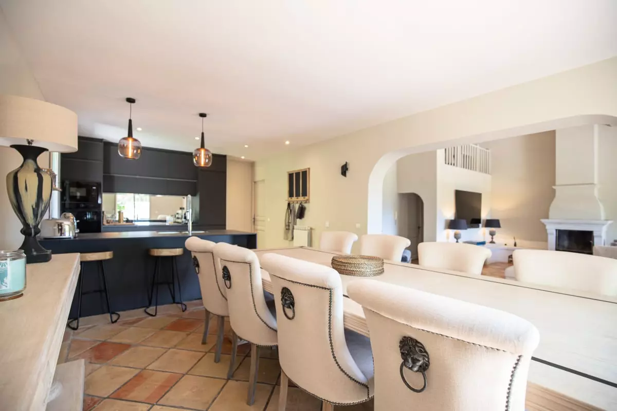 The dining room is furnished with a large table, opening onto the kitchen fully equipped with high-end equipment.