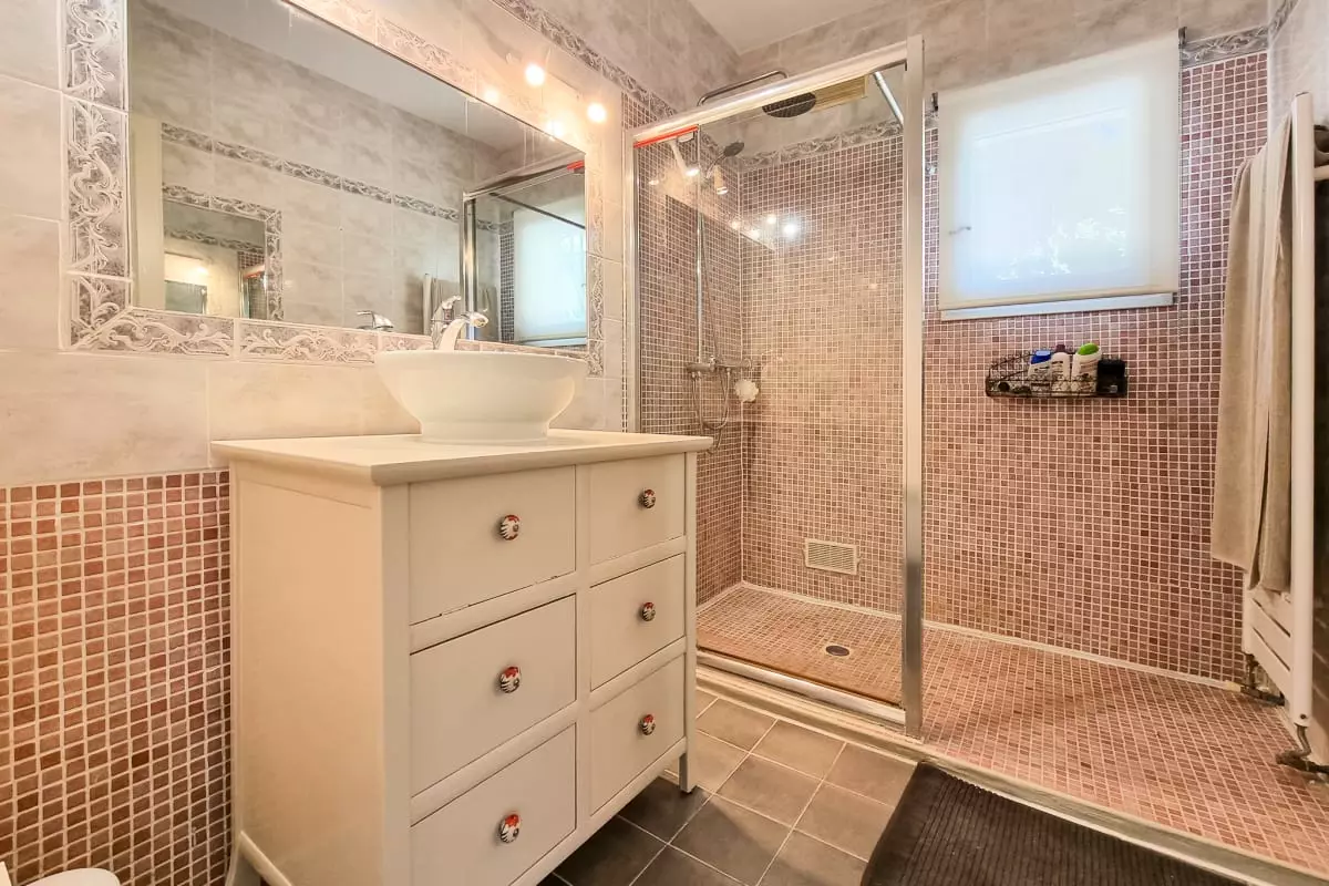 We continue with a large living/dining room bathed in light with a breathtaking view of the Esterel massif, the living room is equipped with a large comfortable corner sofa with electric relaxation seat, a large television with stereo system.
