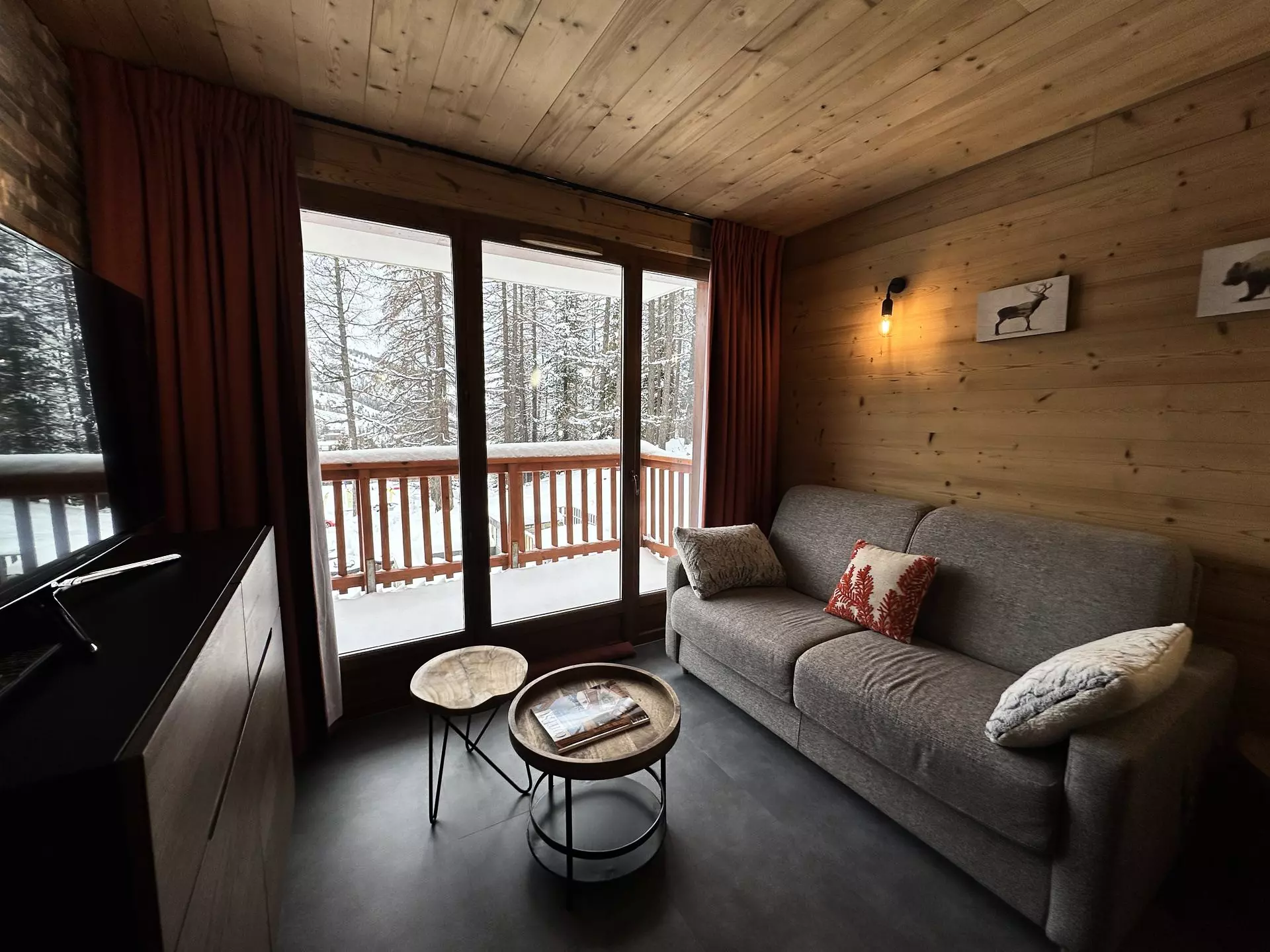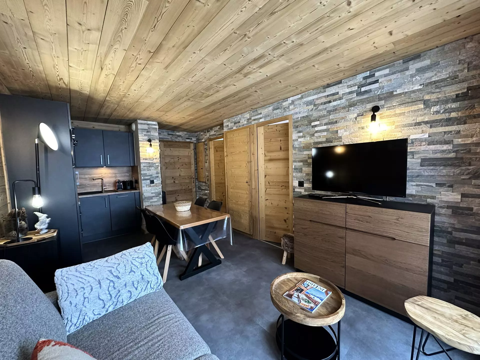 This elegant apartment can accommodate up to four people, featuring one bedroom, a modern bathroom with WC, and a bright living room opening onto a fully equipped kitchen. Enjoy breathtaking mountain views from your private terrace.