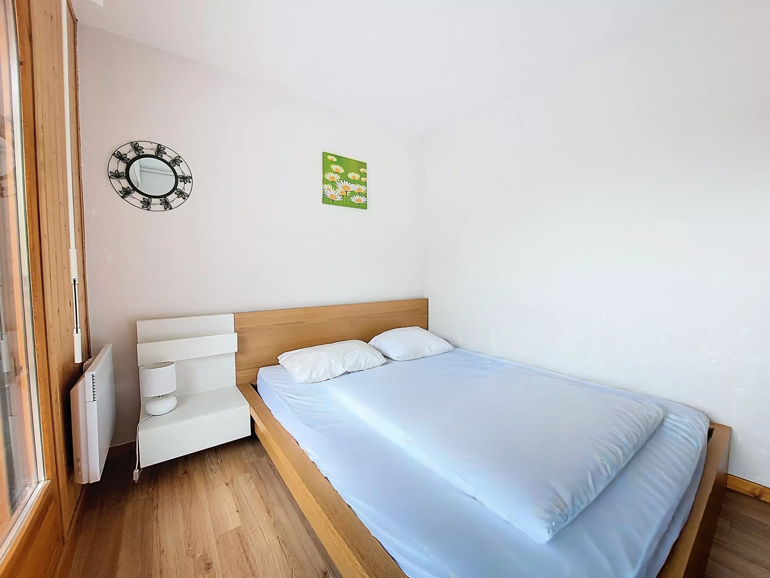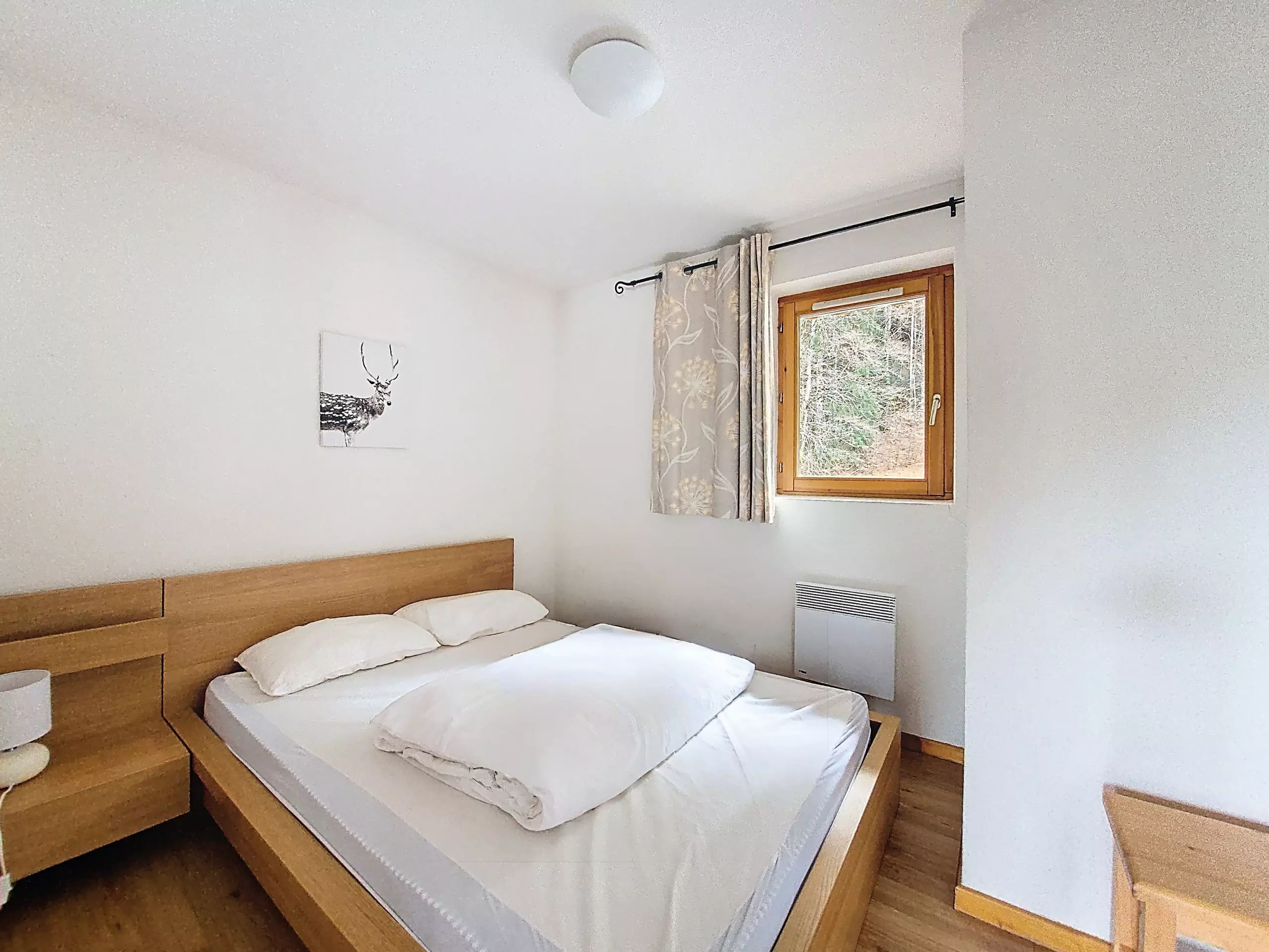 - 1 Bedroom (8.21 m²) with double bed (160x200), storage cupboard, access to the balcony, 1 window overlooking the woods