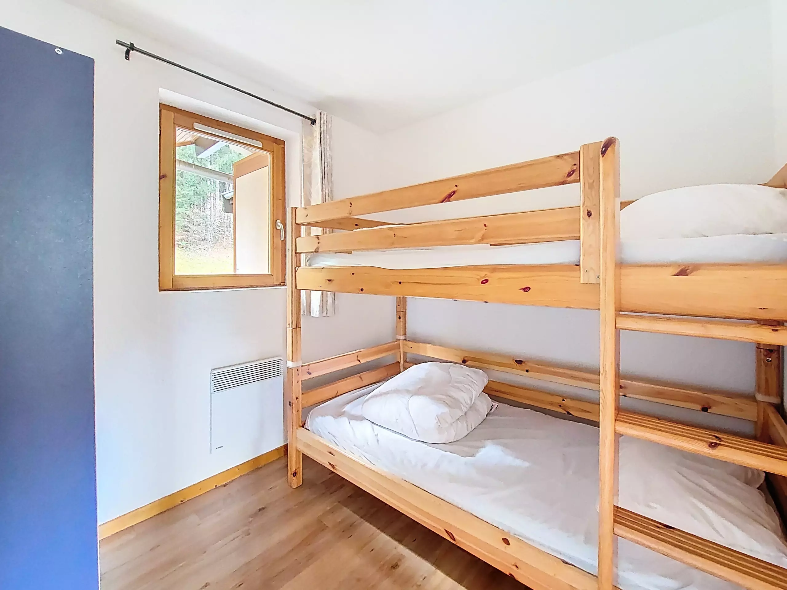 - 1 Bedroom with bunk bed of 5.76 m², 1 window, 1 window overlooking the woods.