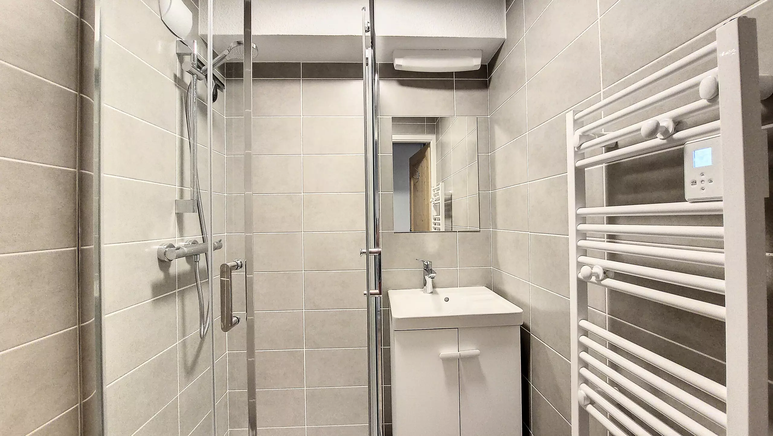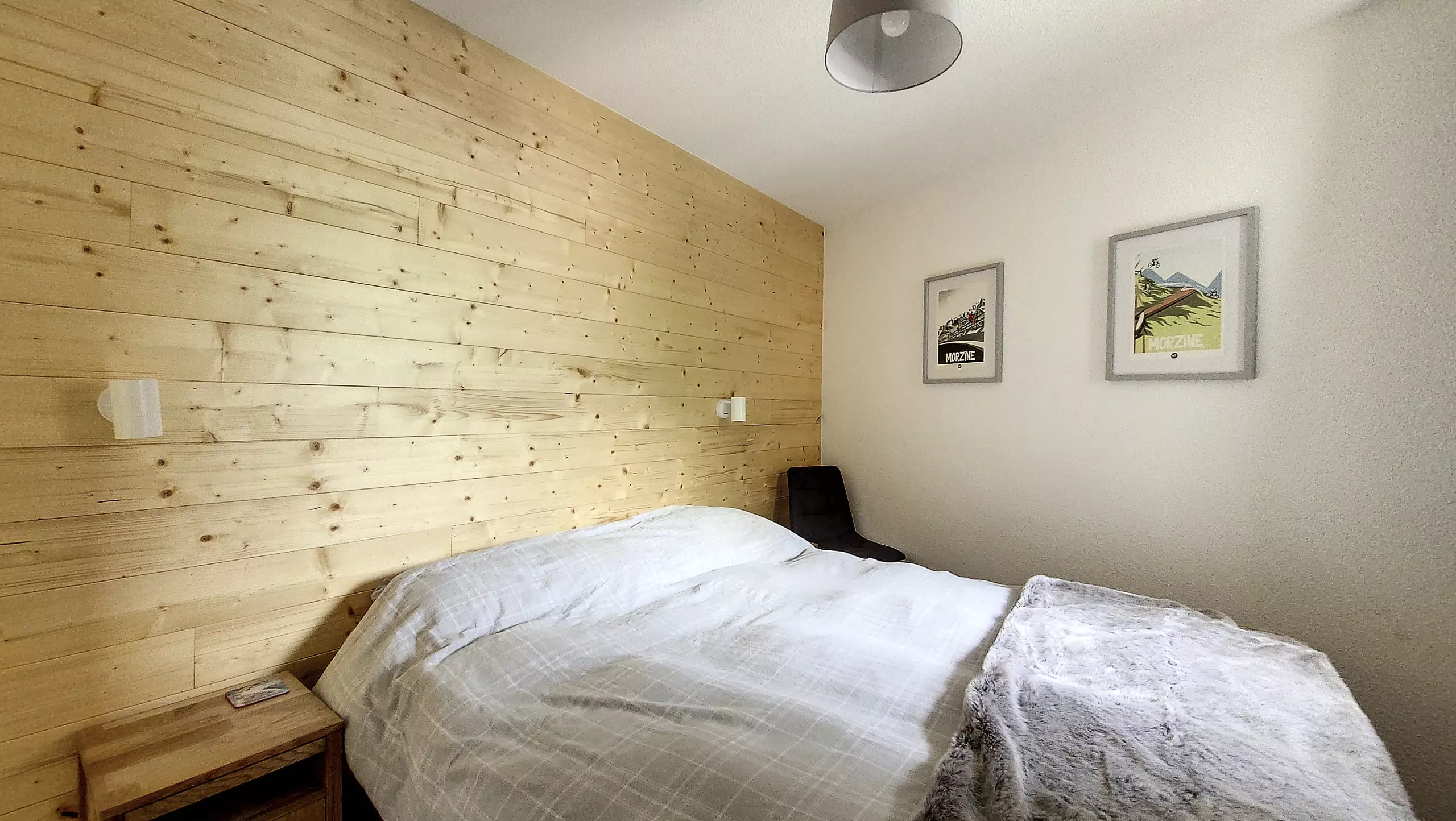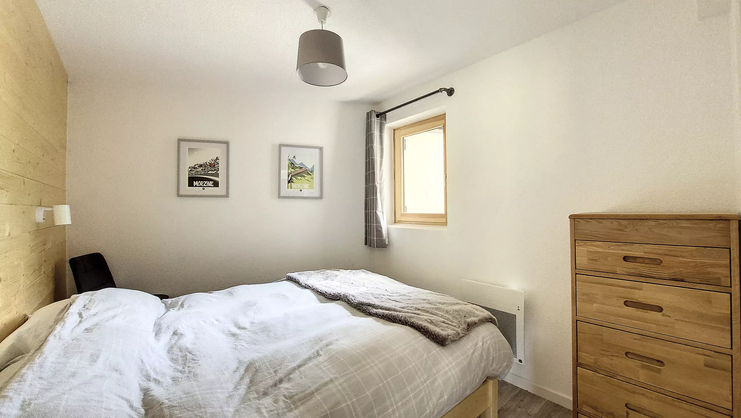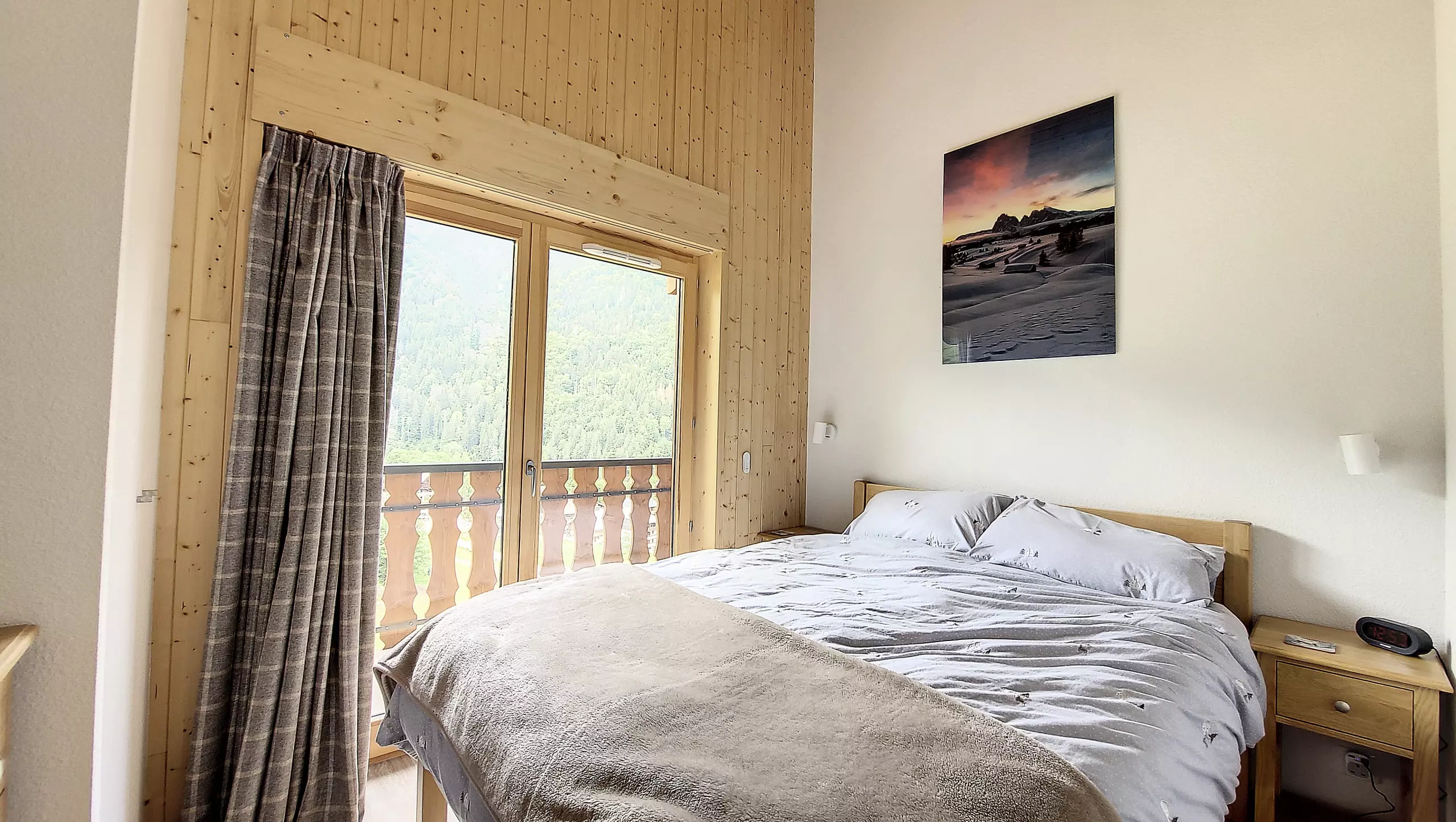 - 1 bedroom with double bed and cupboards, west-facing balcony with view of the ski slopes, a window and access to the balcony
