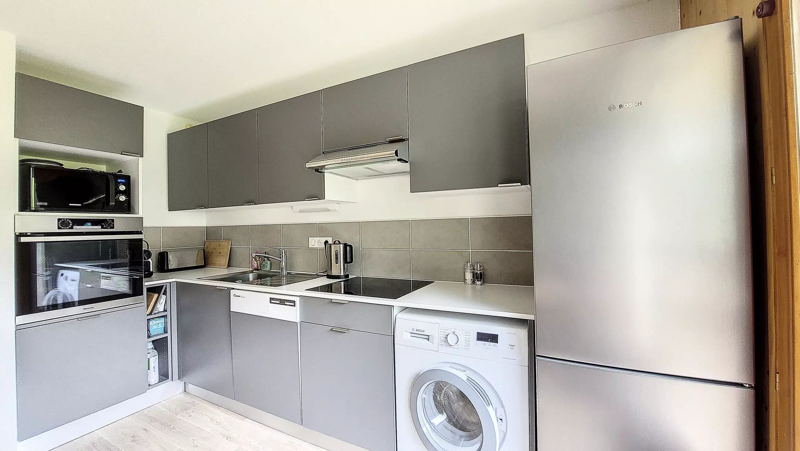 - 1 large main room kitchen/dining room with dining area for 6 people / living room with view of the slopes, west exposure including: