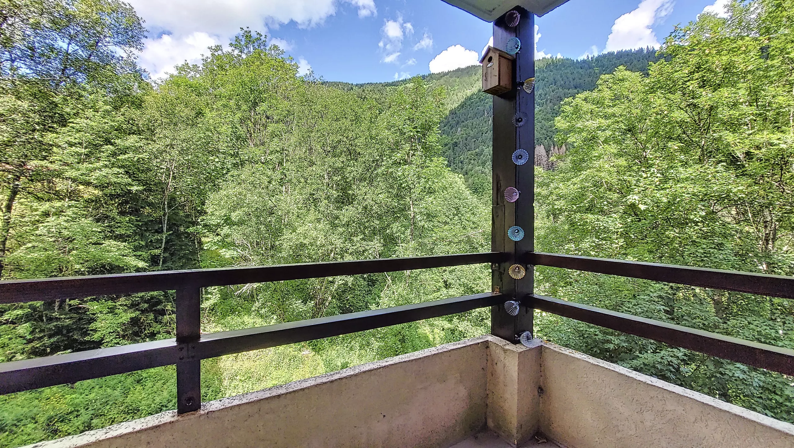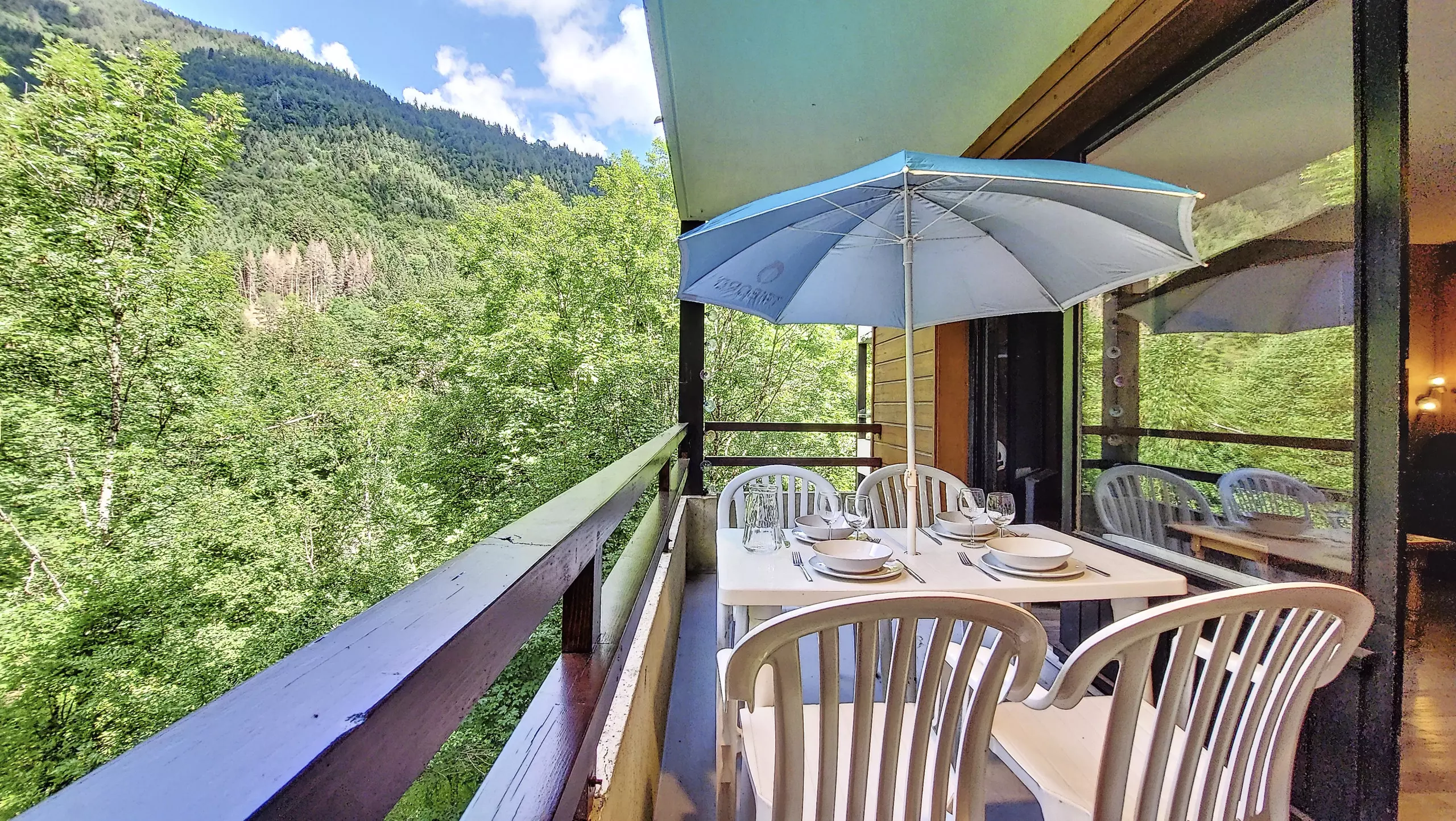 A French window giving access to the balcony equipped with garden furniture facing west with a view of the forest and the mountain