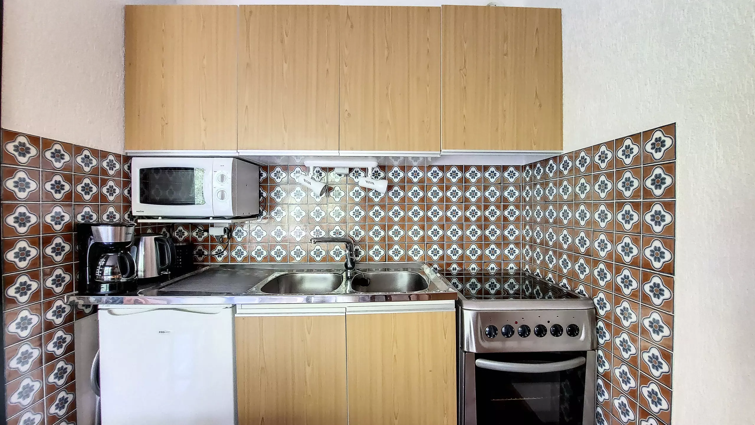 A fully equipped kitchen: Fridge, toaster, kettle, filter coffee maker, microwave, electric stovetop and oven.