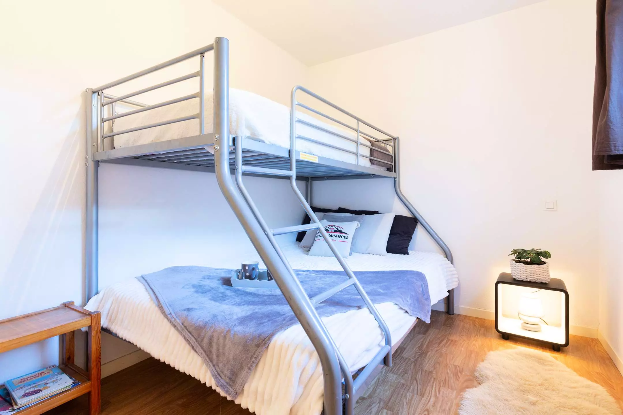 1 Bedroom with 2 single bunk beds, double bed on the bottom, single bed on the top