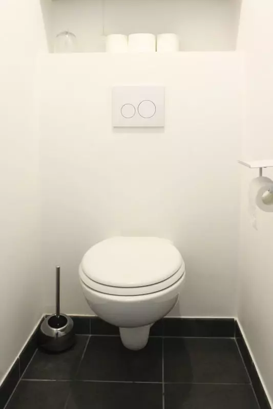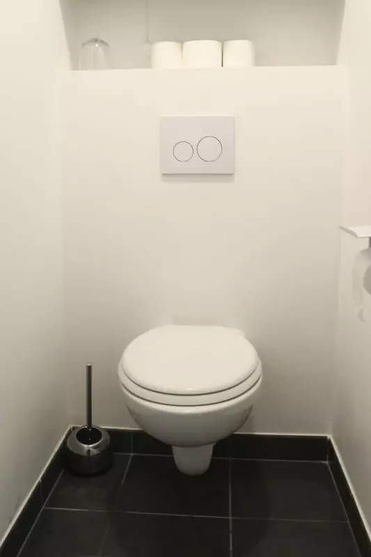 - a bathroom with washing machine and dryer, separate toilet.
