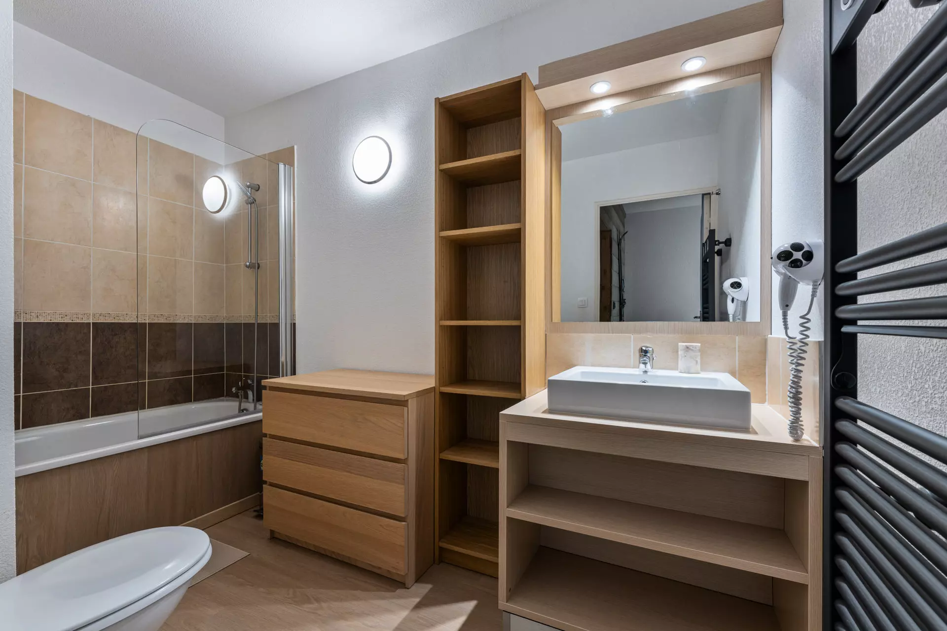 The large bathroom will relax you thanks to its bathtub, while offering you practicality with its numerous storage spaces and hair dryer.