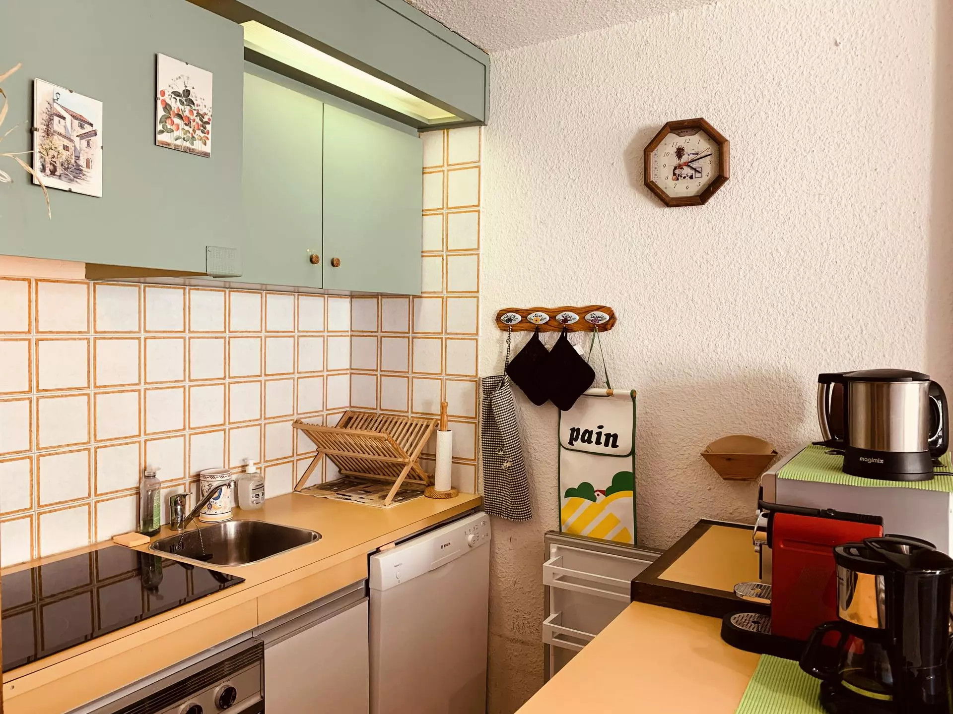* Kitchen area: oven, refrigerator, 3-burner ceramic hob, dishwasher, microwave, filter coffee maker, toaster, kettle;