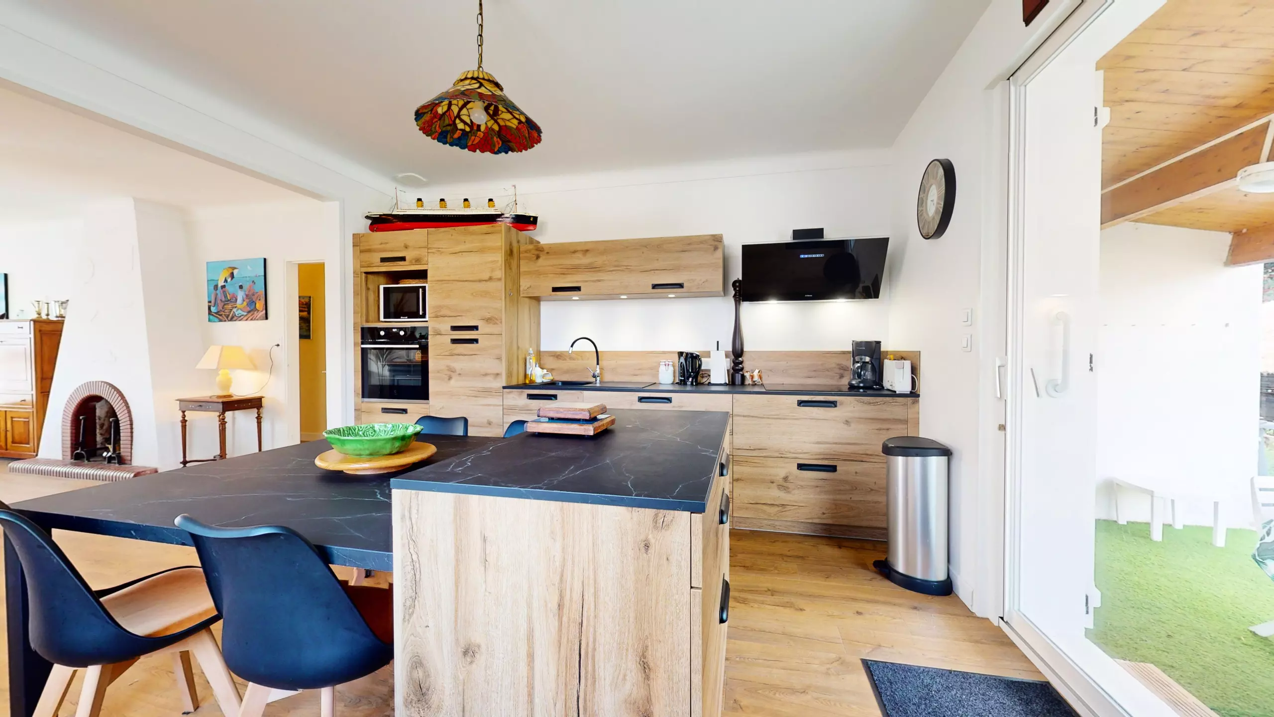 The villa features a bright living and dining room with a large table for meals with family or friends, as well as a kitchen equipped with everything aspiring chefs need: induction hob, oven, microwave, dishwasher, coffee makers, and much more.