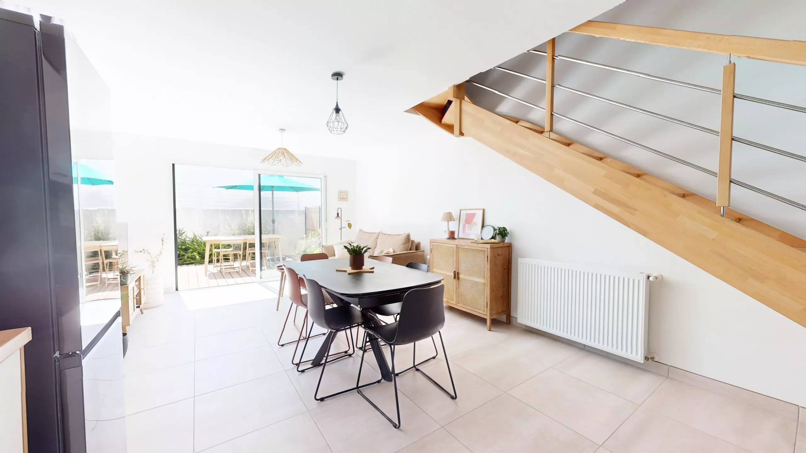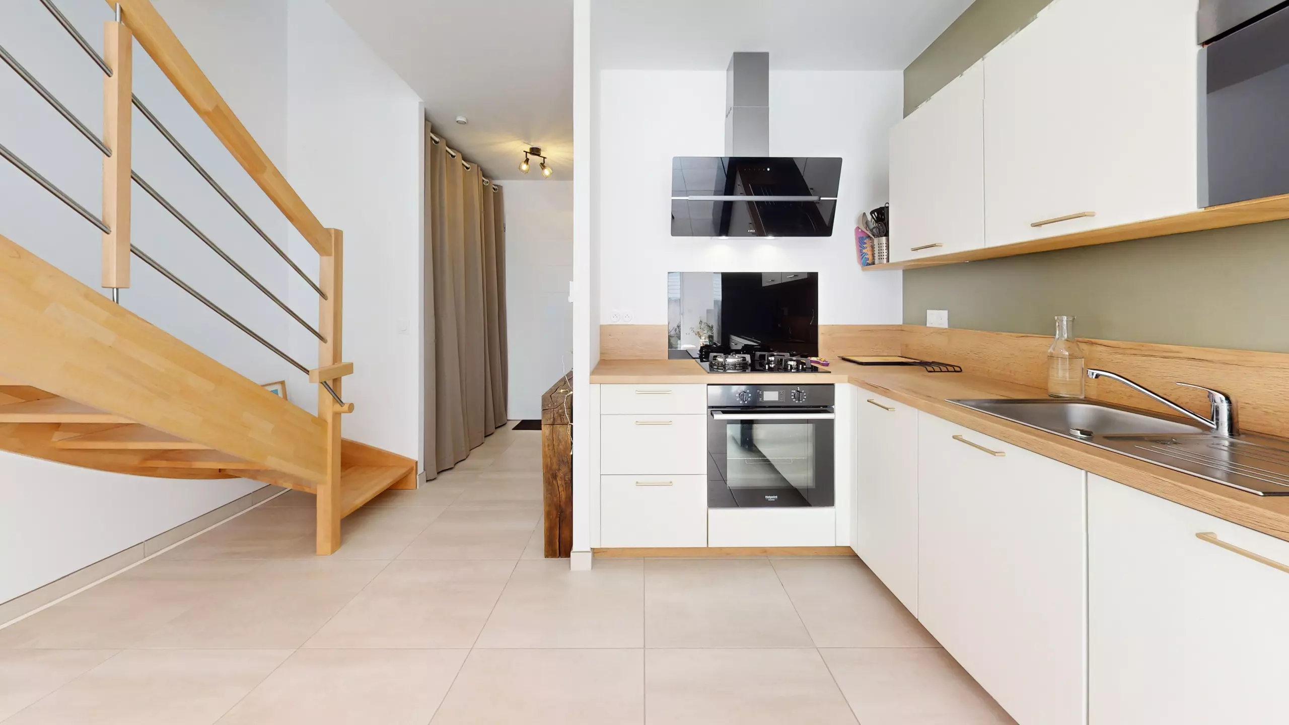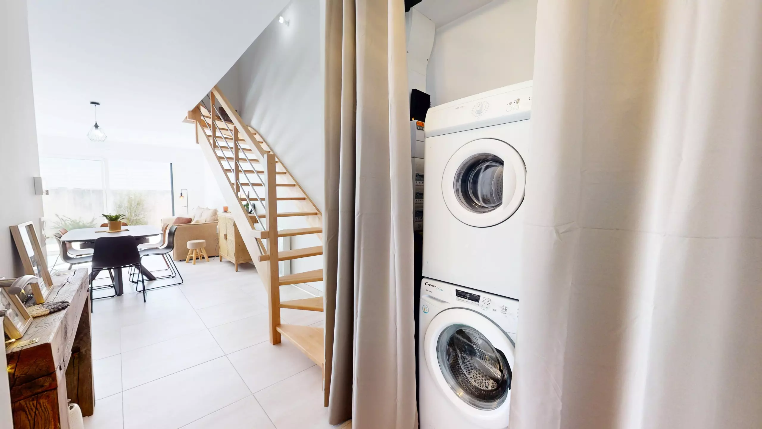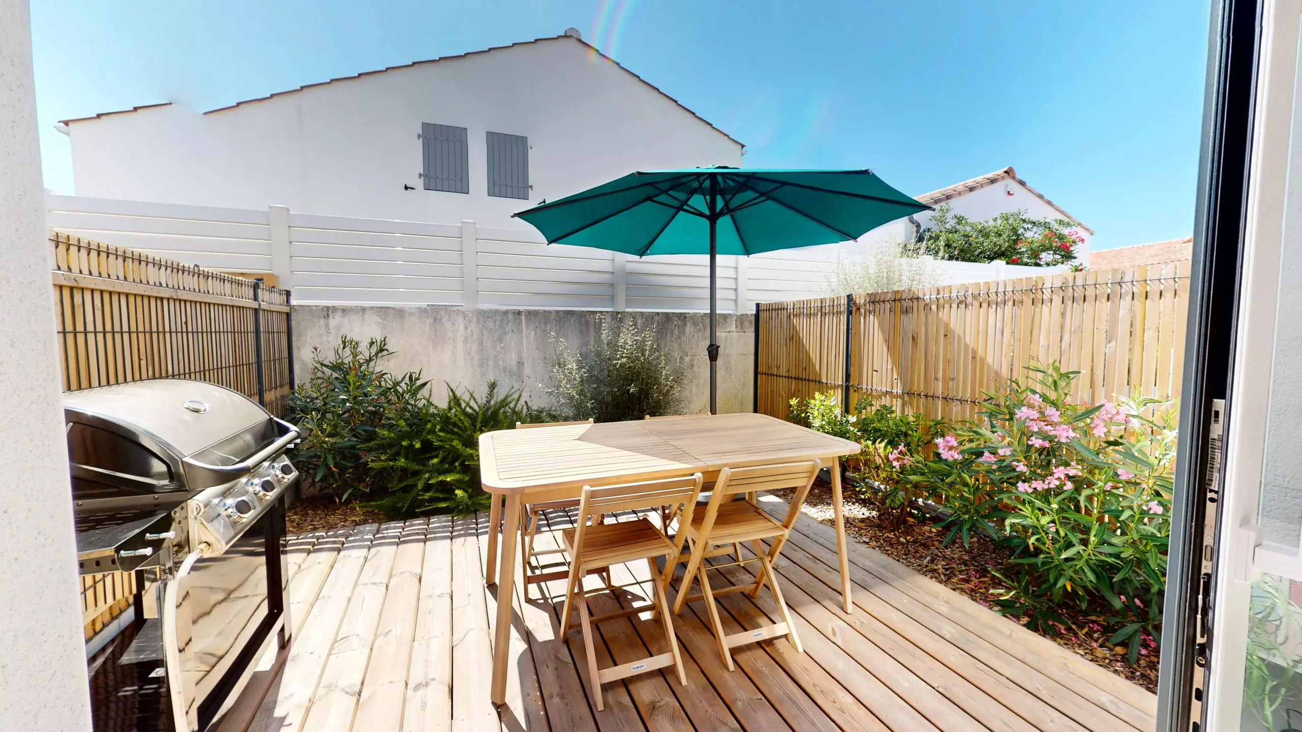 On the ground floor, you will find an entrance hall with a cupboard leading to a fully equipped open kitchen (oven, induction hob, extractor hood, dishwasher, fridge-freezer, microwave), ideal for preparing delicious meals. The sunny living room has a comfortable sofa bed, a smart TV, and opens onto a wooden terrace with garden furniture and an electric plancha, perfect for your outdoor meals.