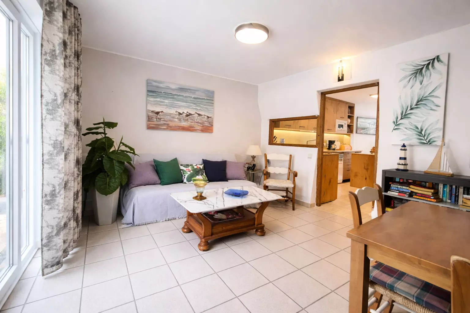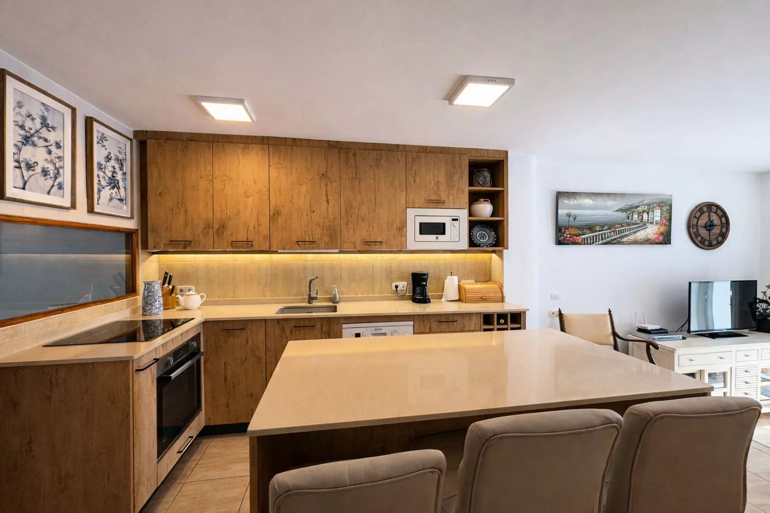 On the lower floor is the living-dining room, with a comfortable sofa, television and an island in the kitchen for eating.