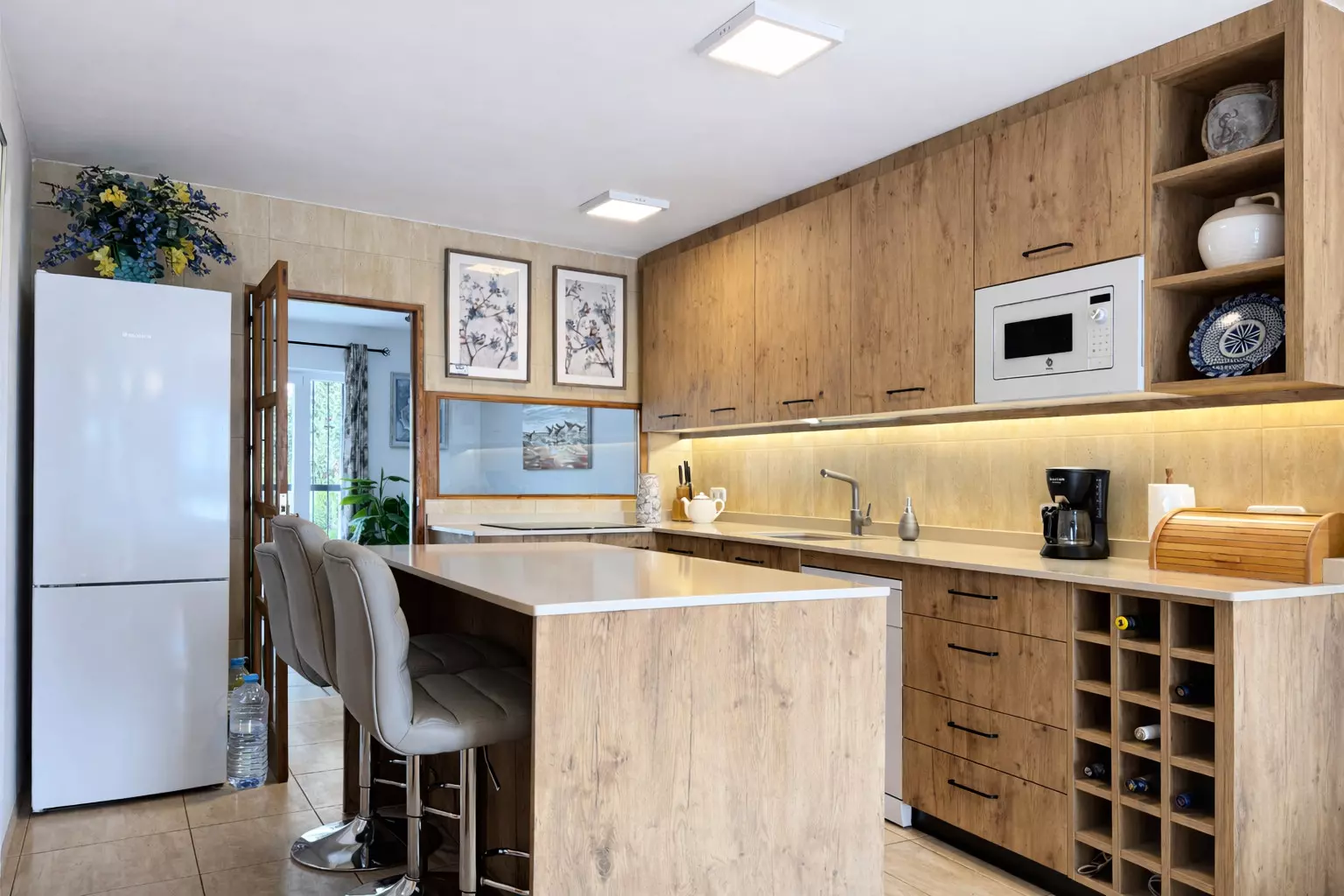 The kitchen is equipped with a refrigerator, microwave, oven, freezer, washing machine, dishes, kitchen utensils, coffee maker and toaster.