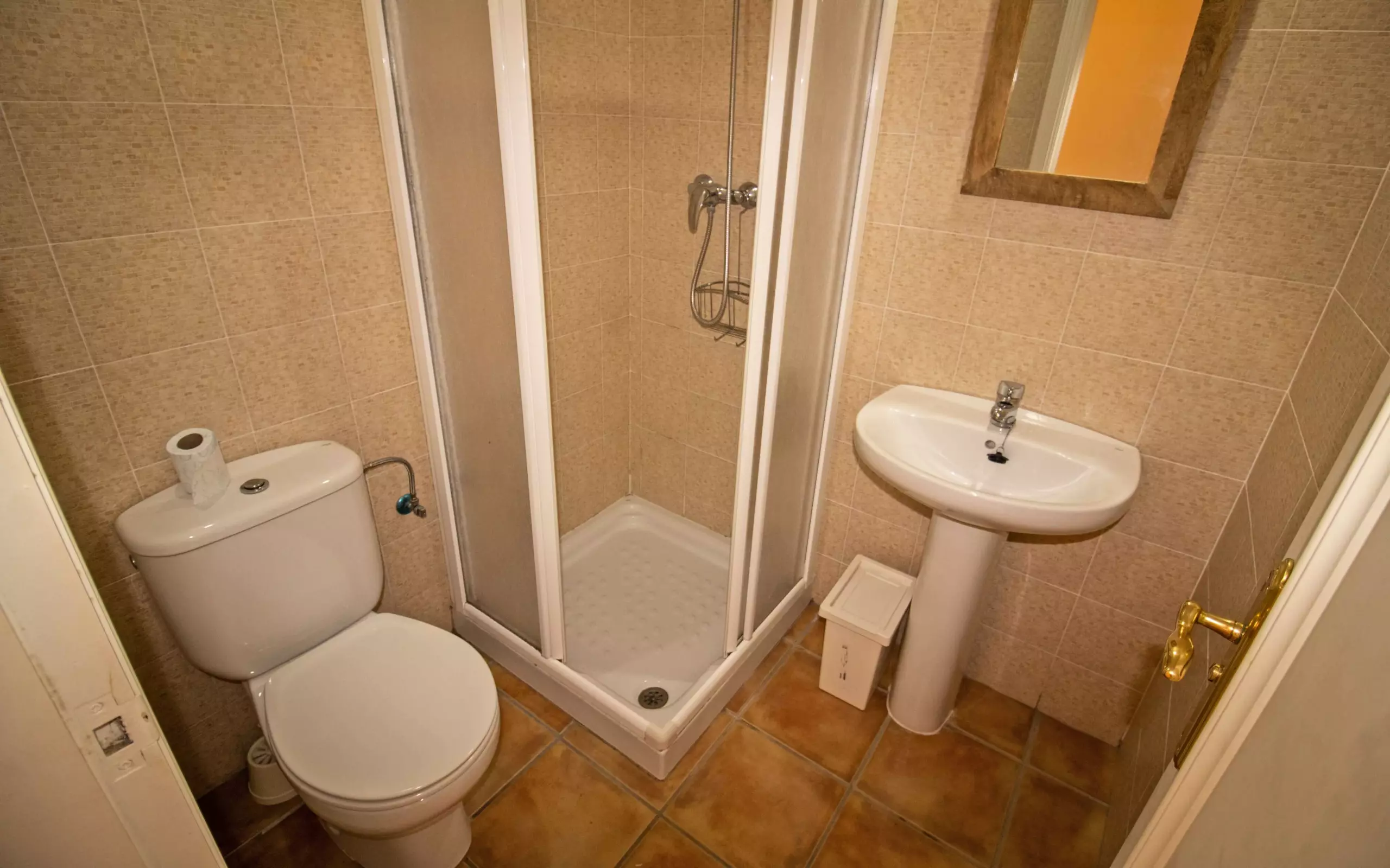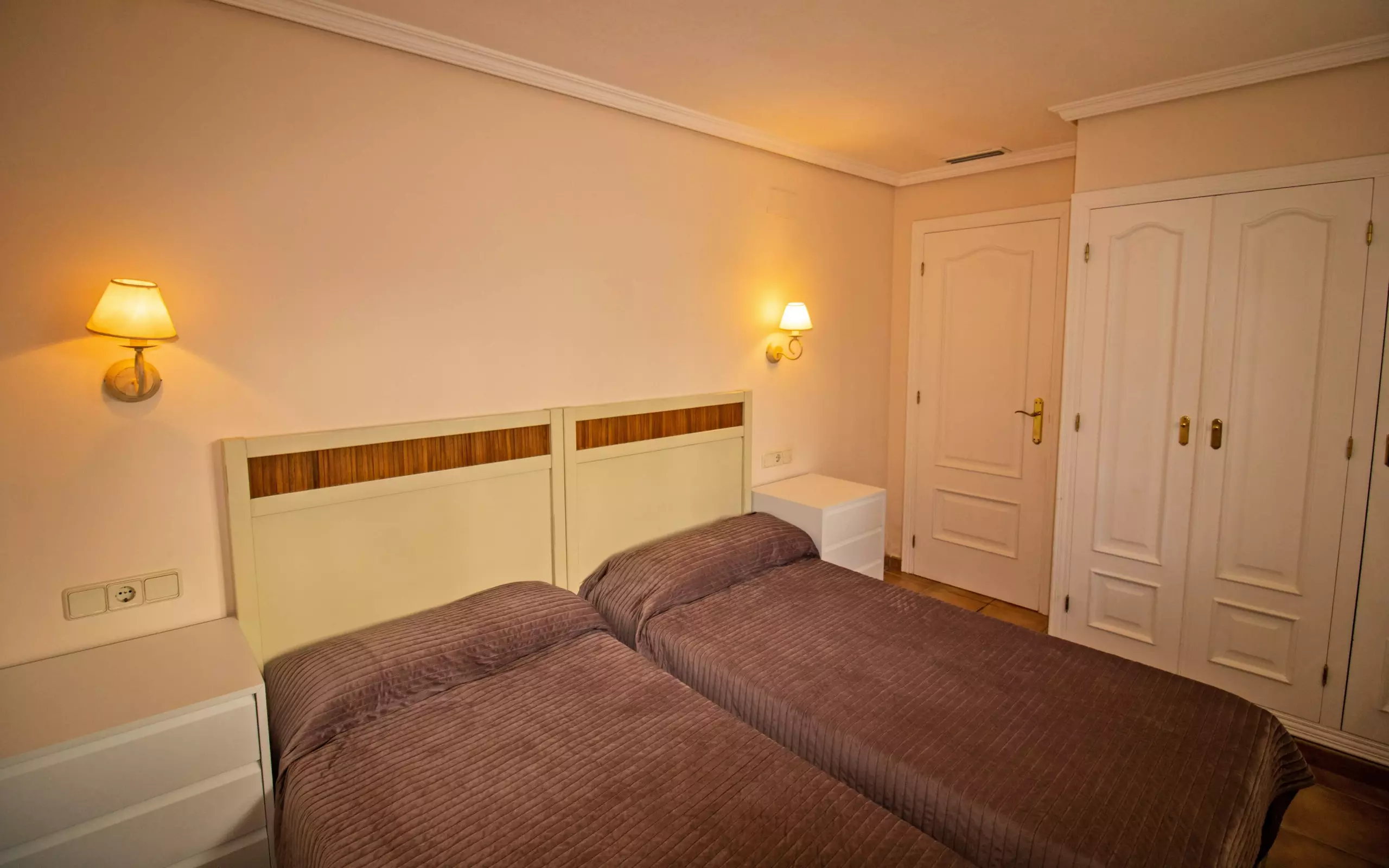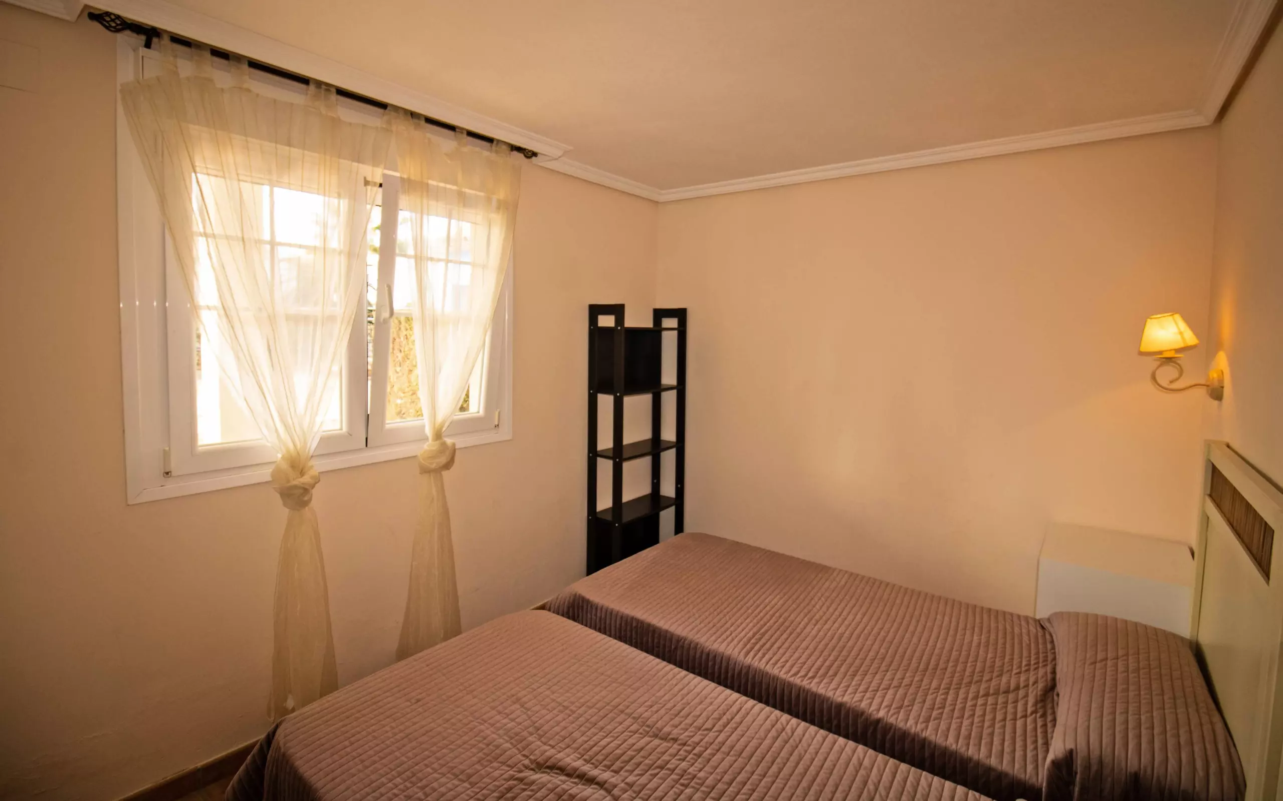 At the entrance, on the left side, is the bedroom, with two single beds. Next is the bathroom. Next is the master bedroom en suite, with a double bed and an en suite bathroom.