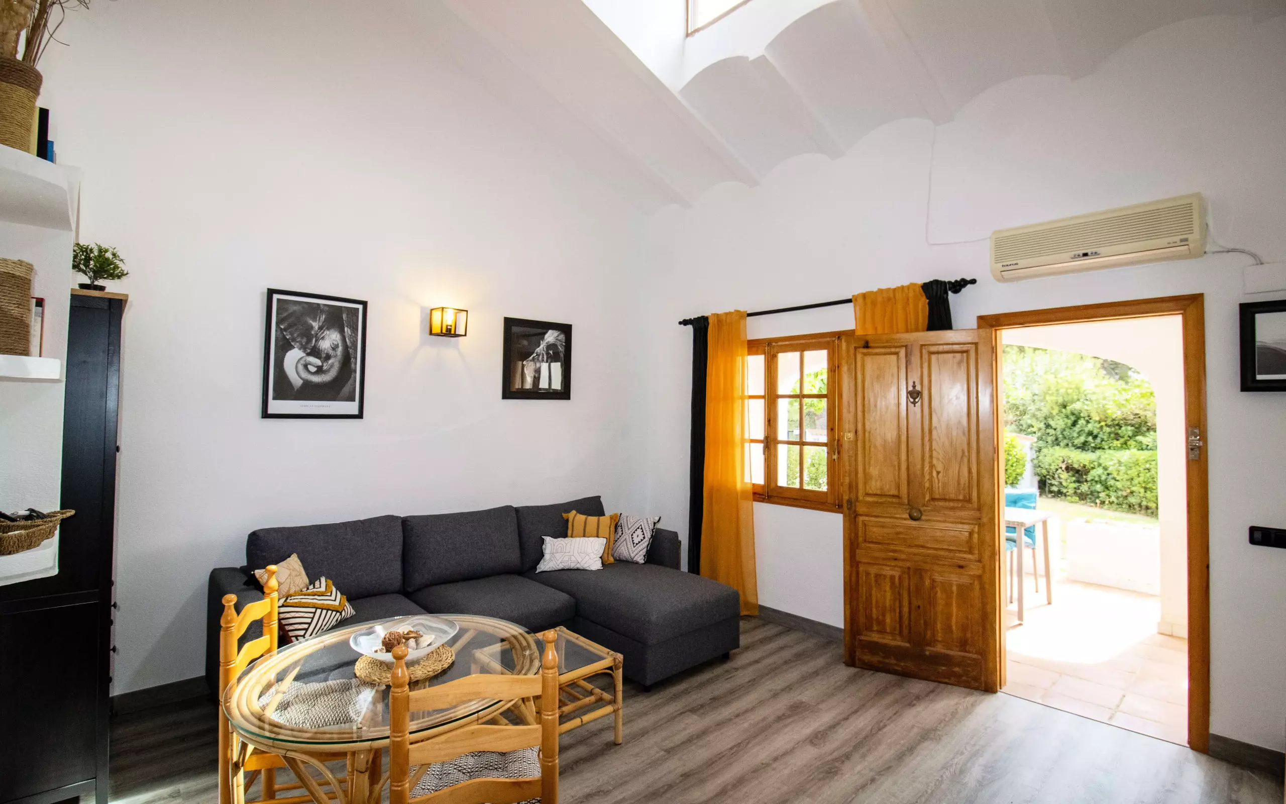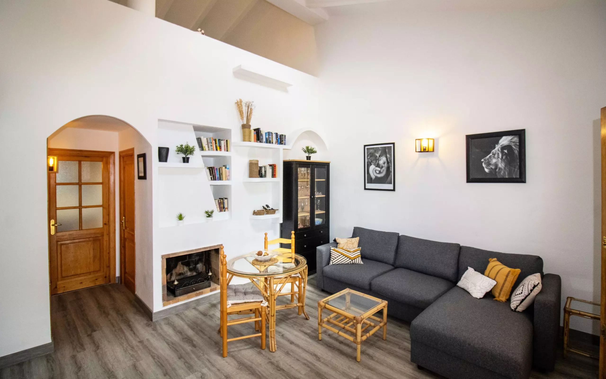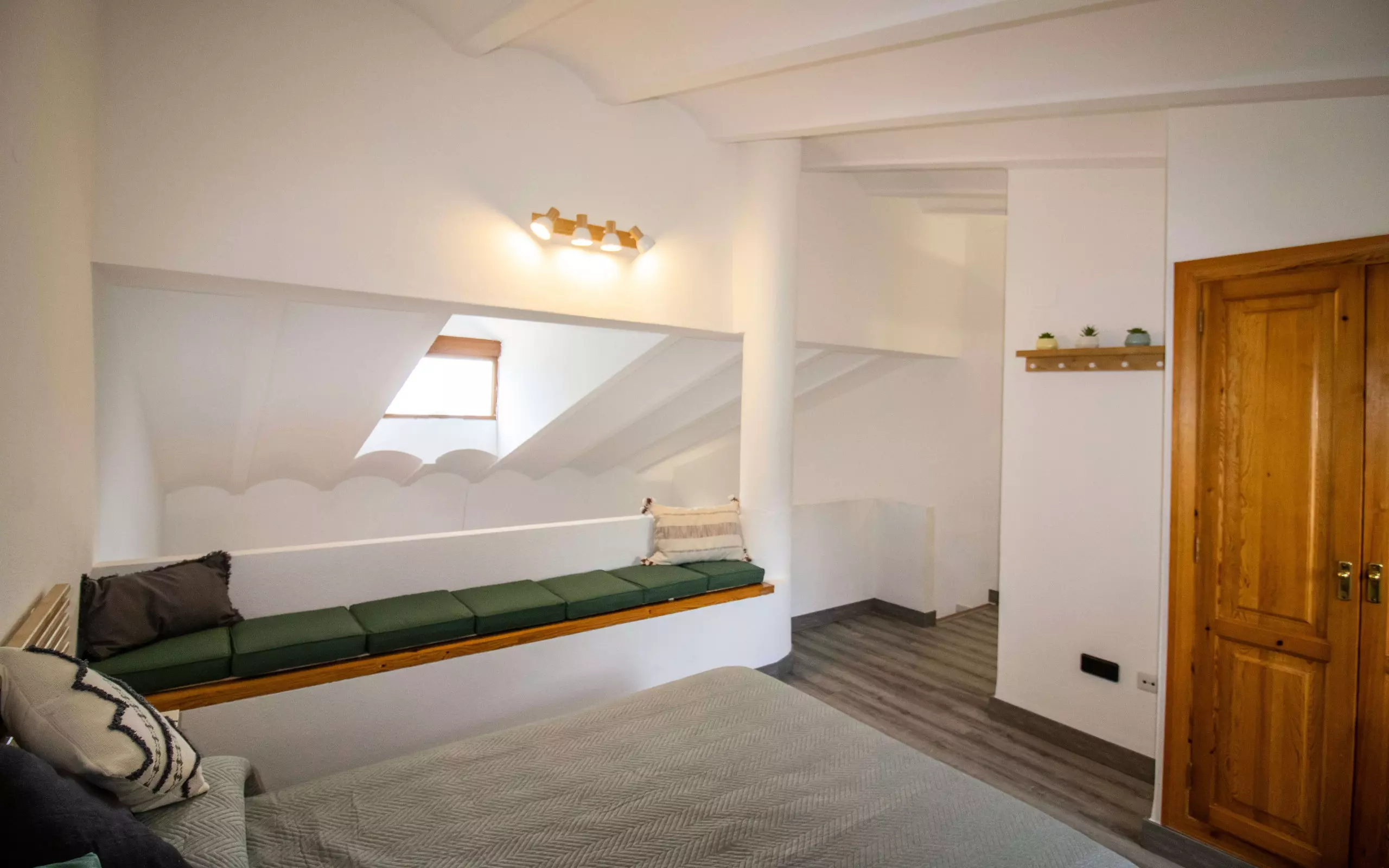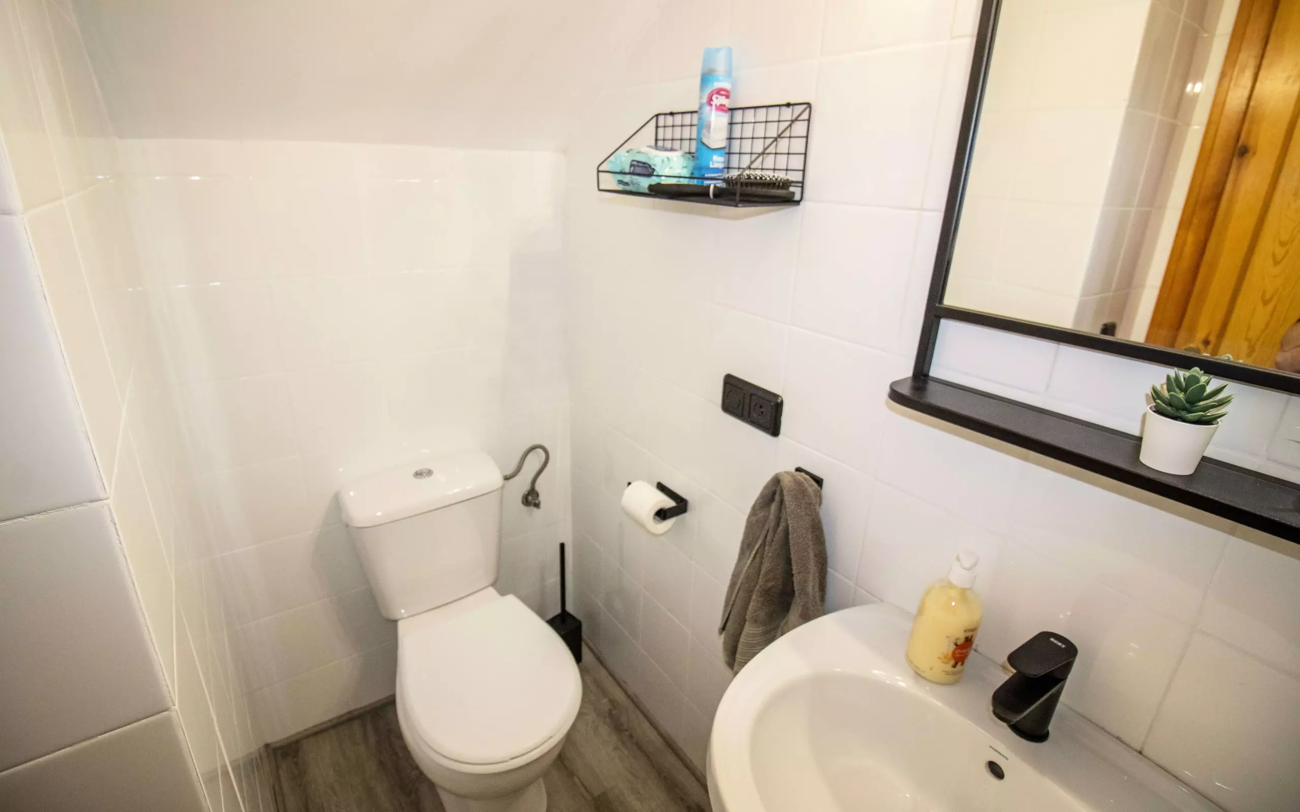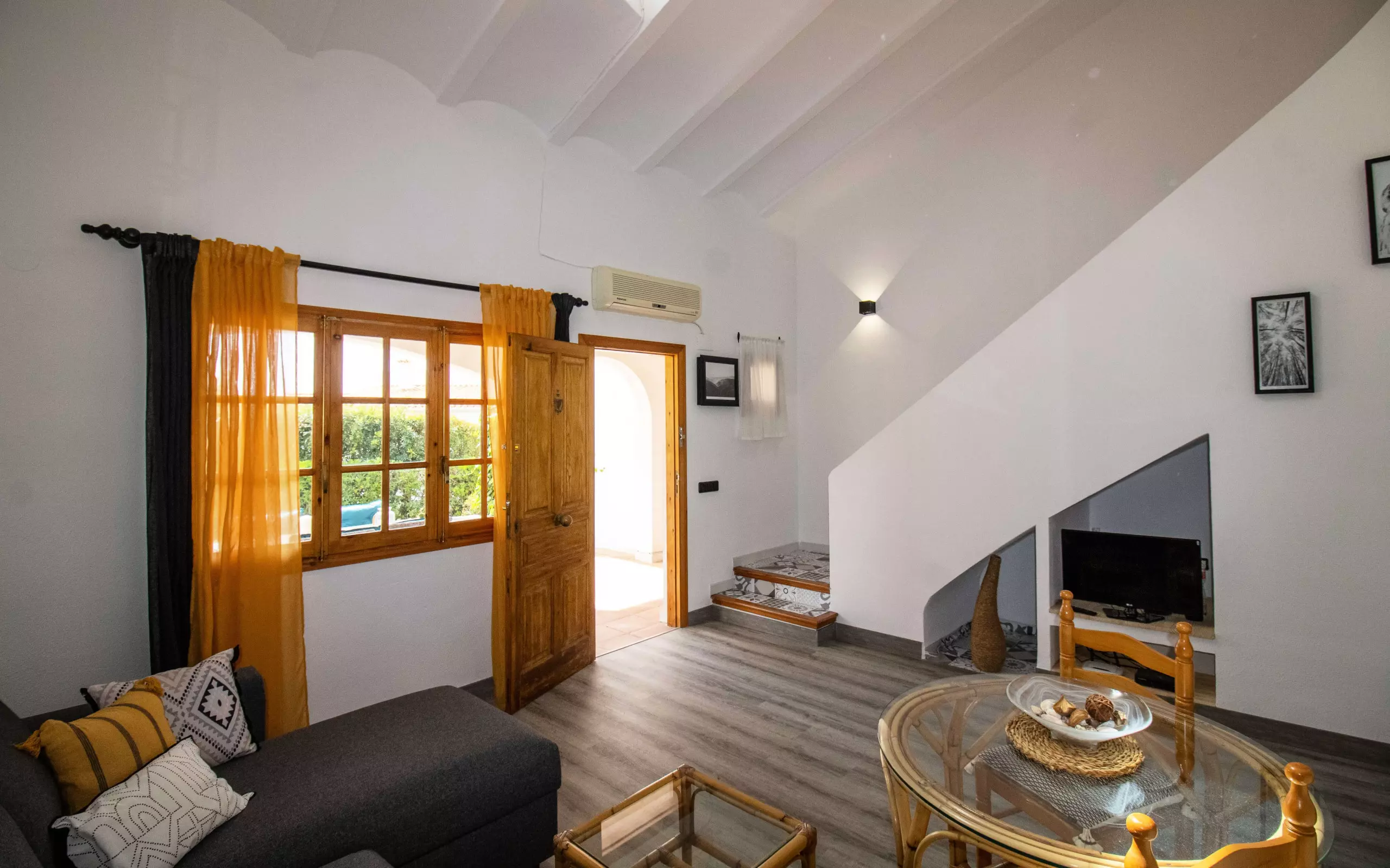 Upon entering, on the ground floor, you will find the living-dining room with a high ceiling. A very comfortable chaise longue sofa, as well as a dining table and a television. Air conditioning.