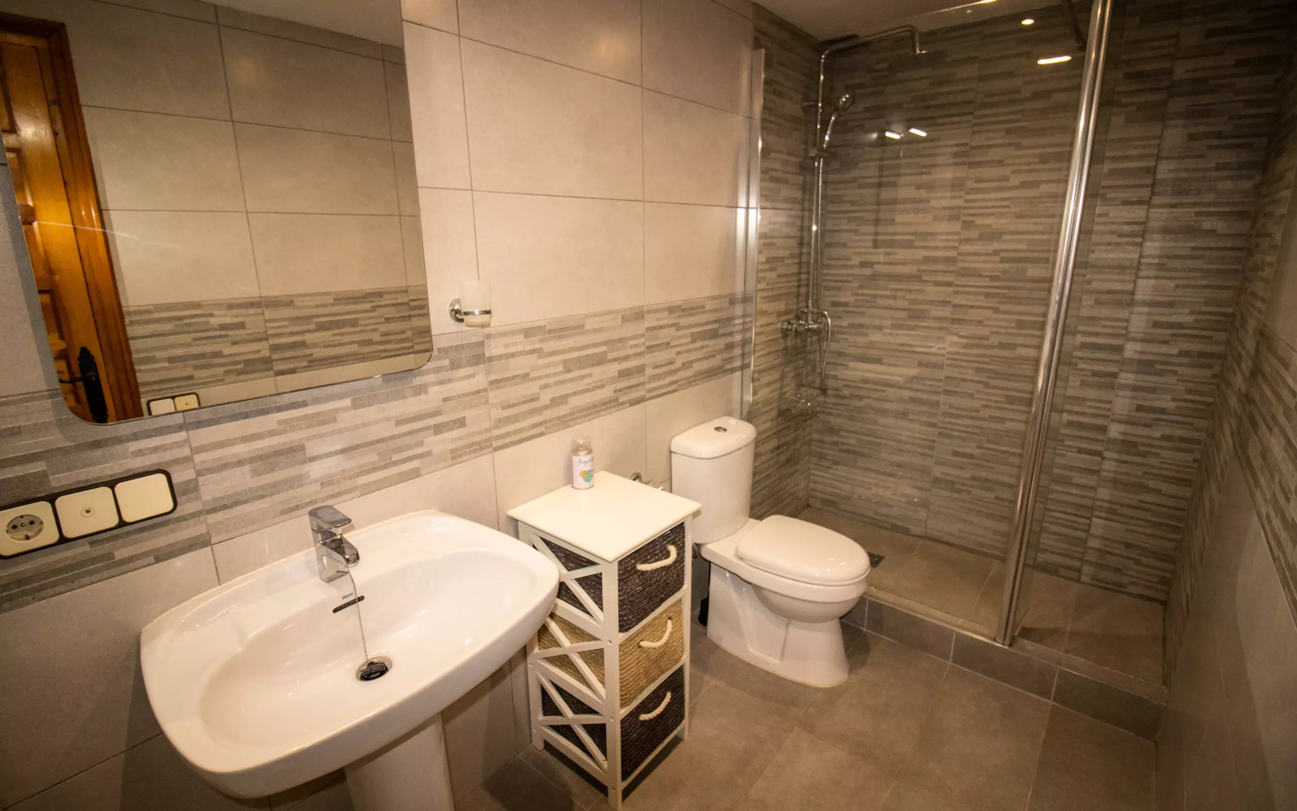 It has a terrace, washing machine, internet access (wifi), air conditioning in the living room, outdoor parking in the same building, 2 fans, TV.